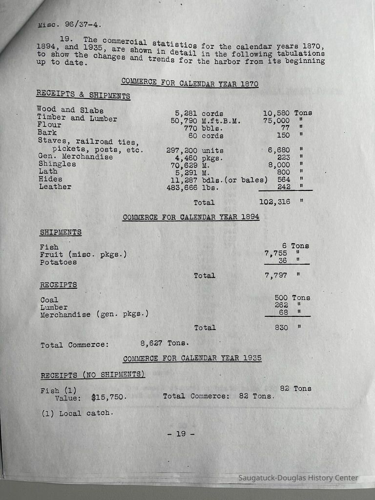 1869-1935 statistics for tons of manufactured goods, forest products, animal products and minerals shipped from harbor plus passengers.Context