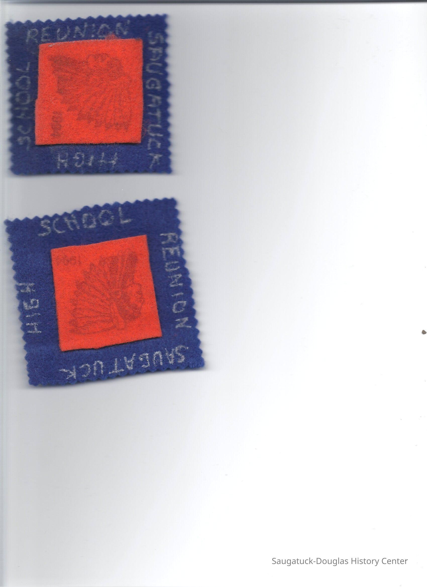 Notes: Orange and blue felt with an image of an Indian and the date 1994 on orange felt surrounded by blue felt with the words Reunion, Saugatuck High School 3" x 3 1/4"
