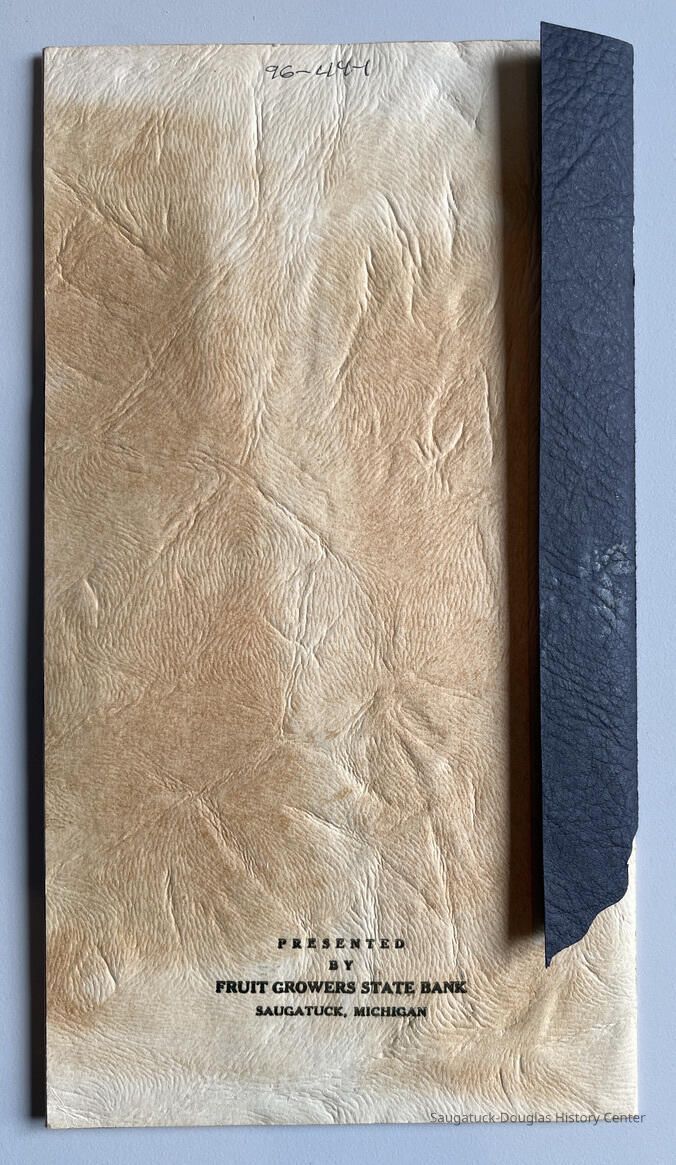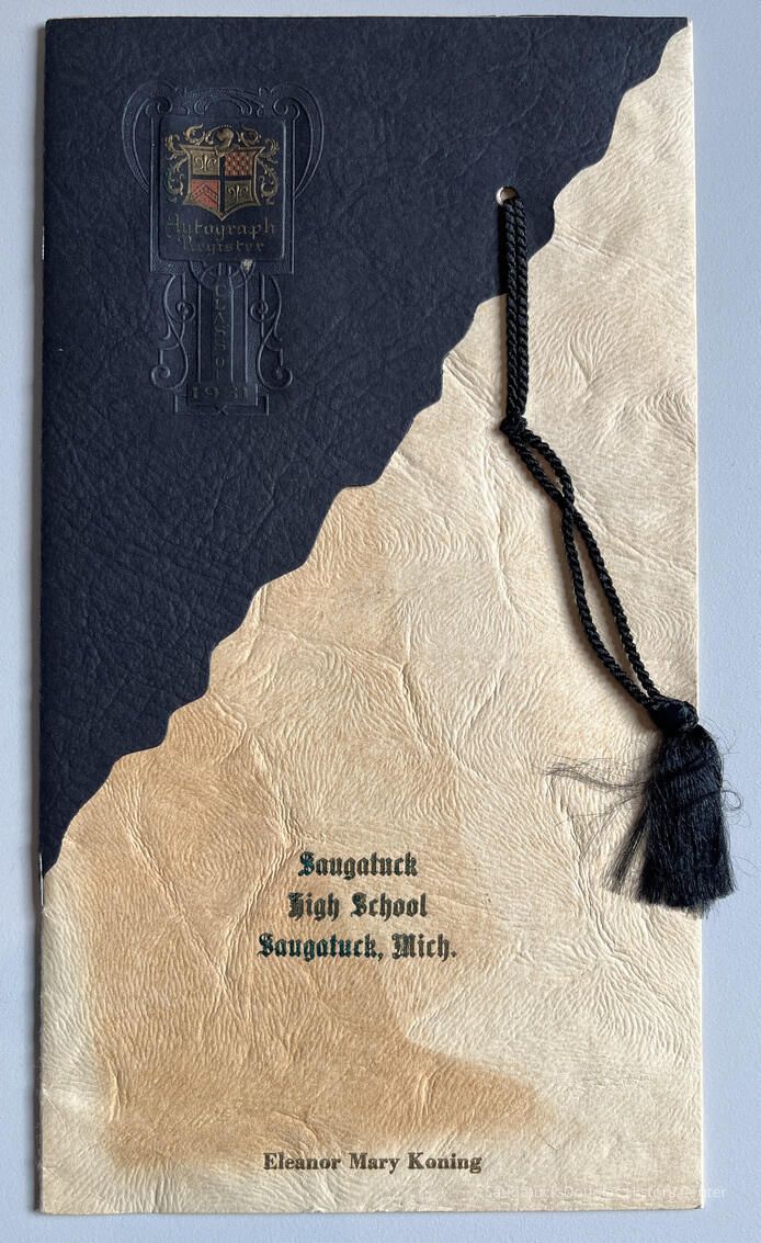 Pre-printed autograph register provide to the Saugatuck High School class of 1931 by Fruit Growers State Bank. This book was the personal property of Eleanor Mary Koning, whose name is imprinted on the cover.