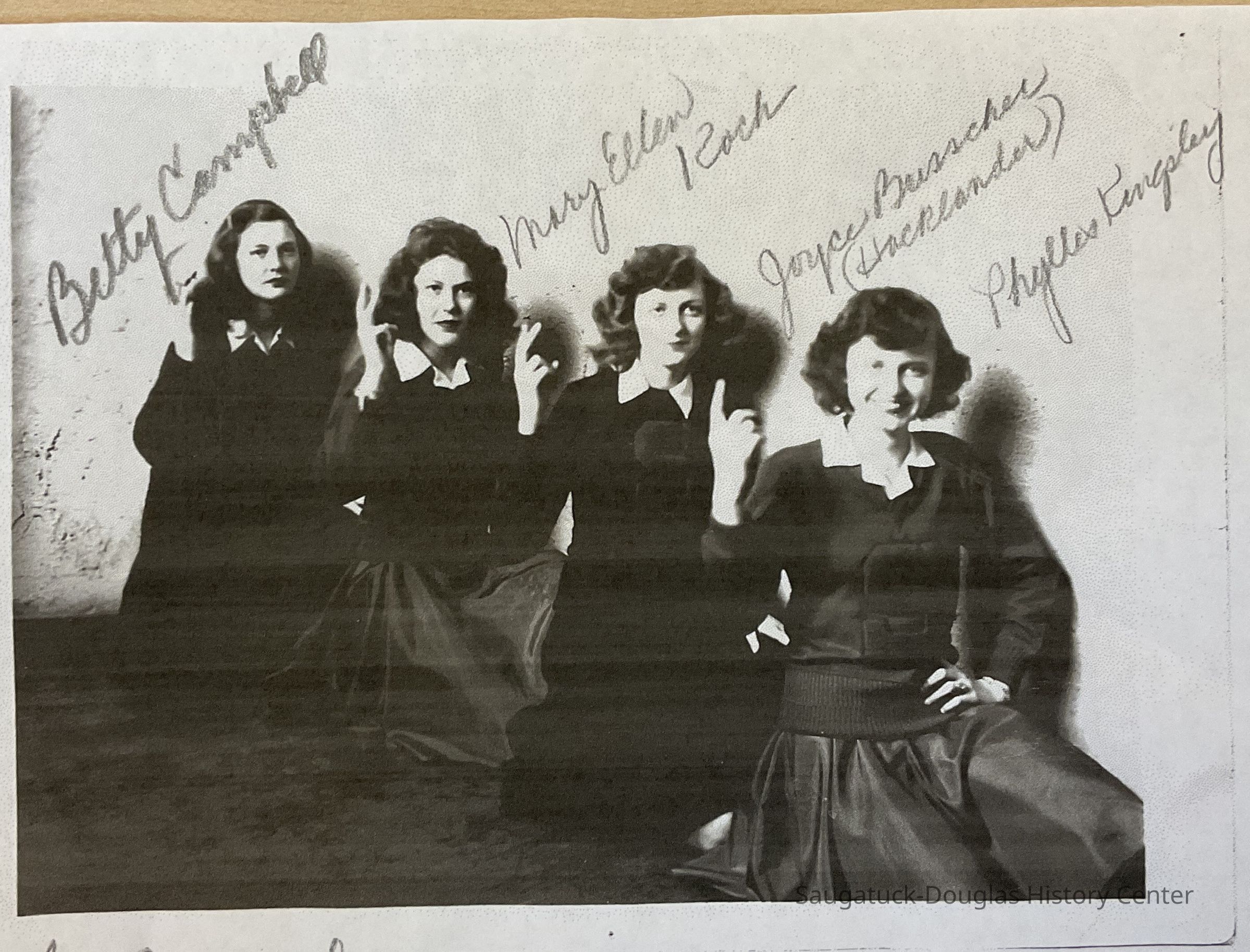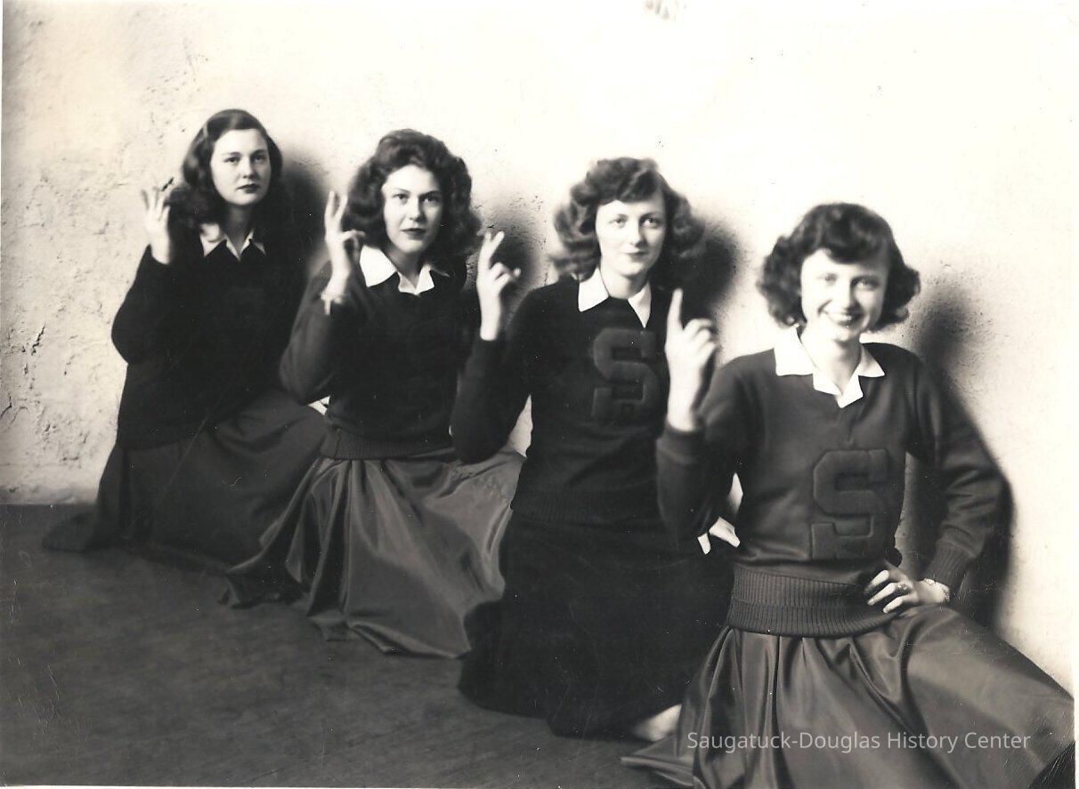 Photograph (black and white) of four cheerleaders from Saugatuck High School. Left to right Betty Campbell, Mary Ellen Koch, Joyce Hacklander Busscher, Phyllis Kingsley.Collection