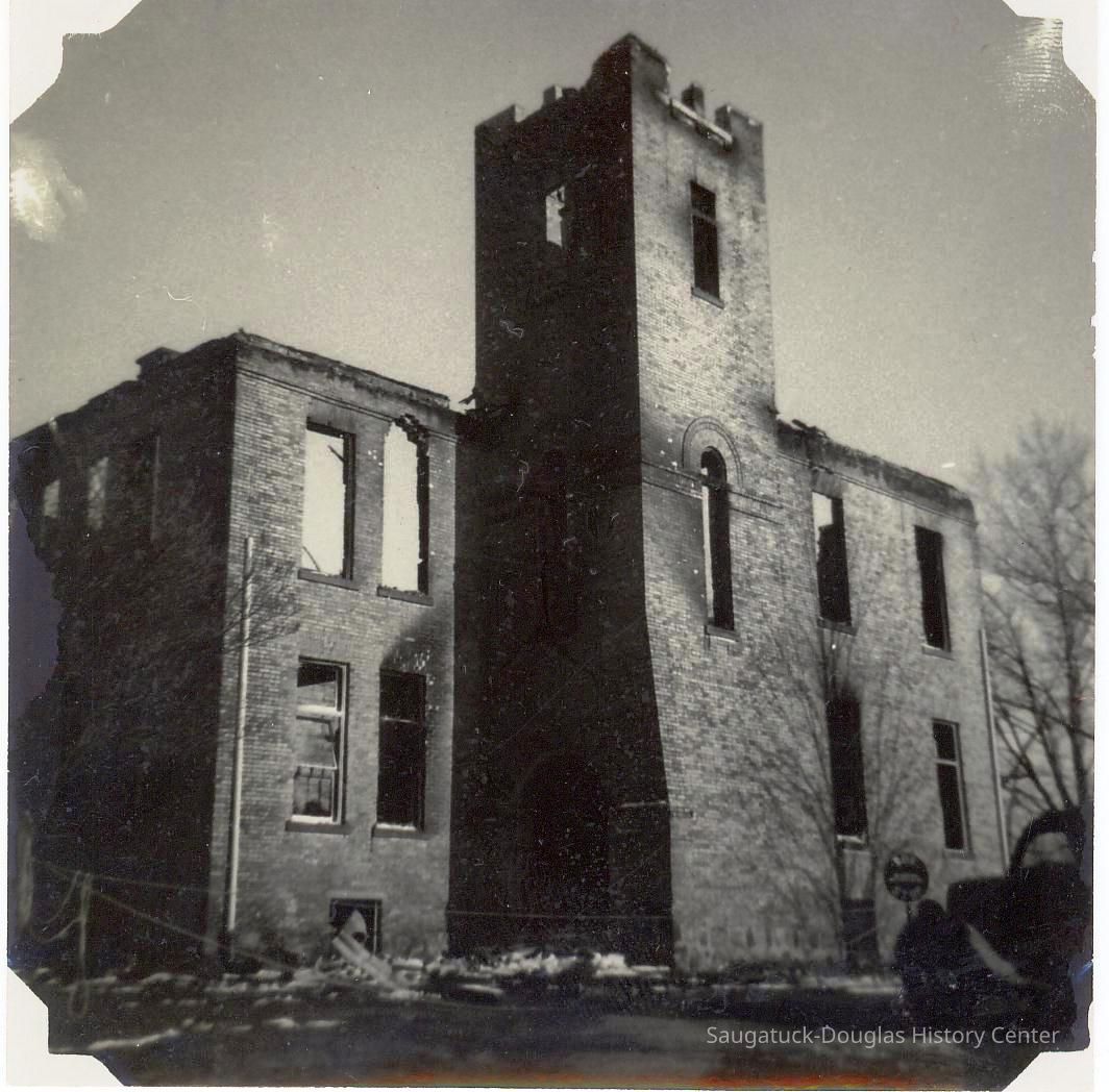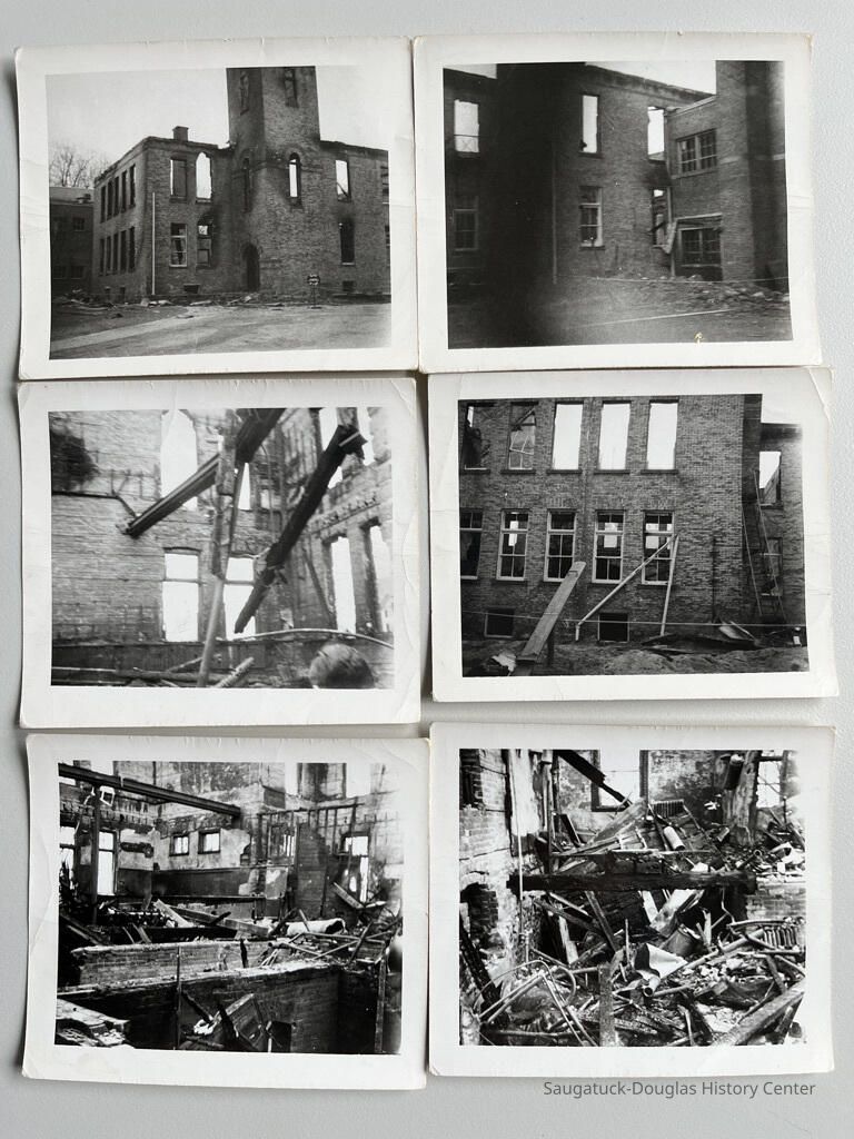 Seven photos taken of the burned out Saugatuck High School building after the March 28, 1950 fire. Photos by Carl Walters, spouse of Lucile E. Sewers.Photograph Details