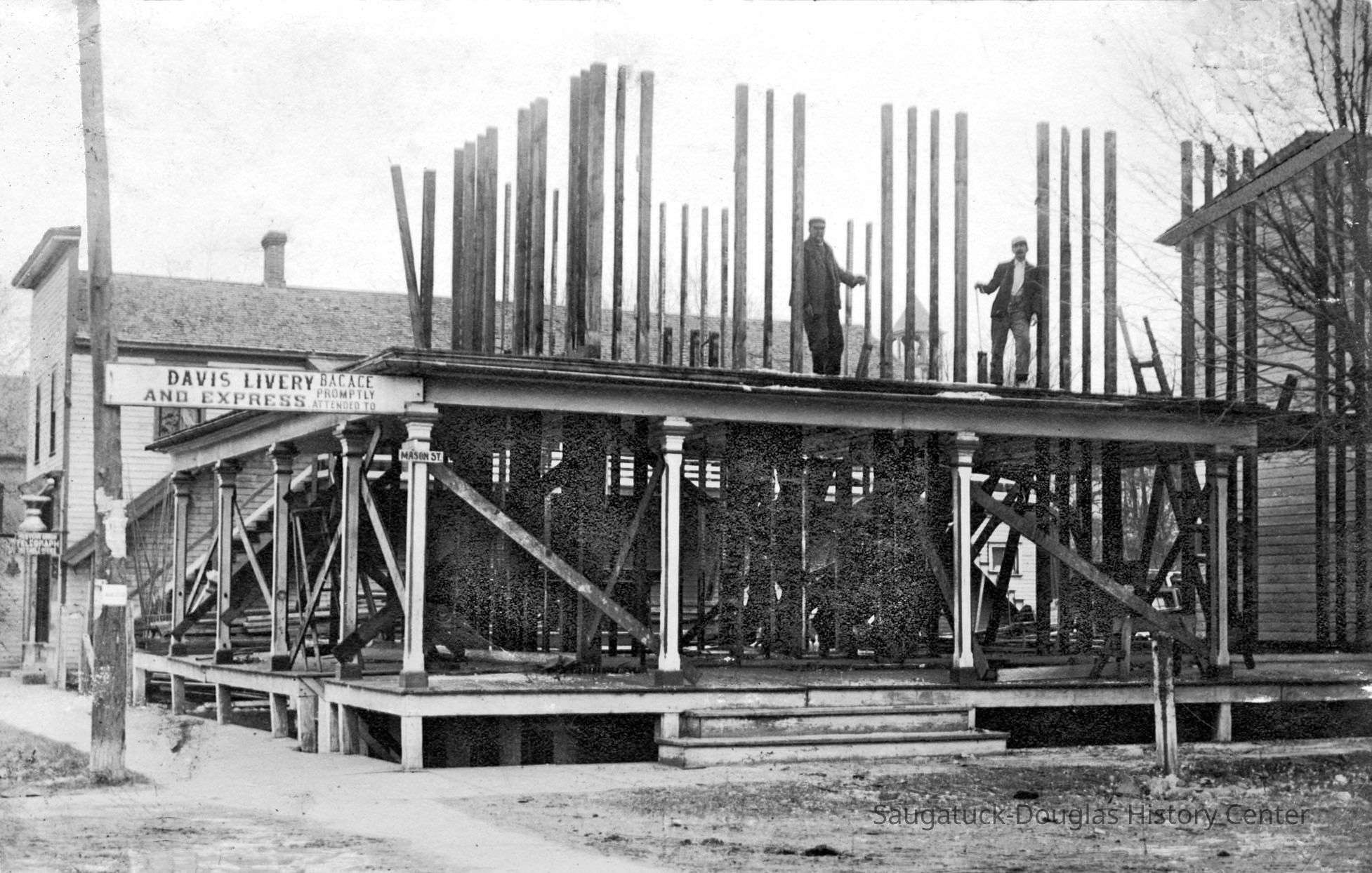 Two workers pause from deconstructing the Hotel Hamilton, previously known as the Saugatuck House. The hotel was Saugatuck's first purpose-built lodging. A sign for Davis Livery and Express remains.