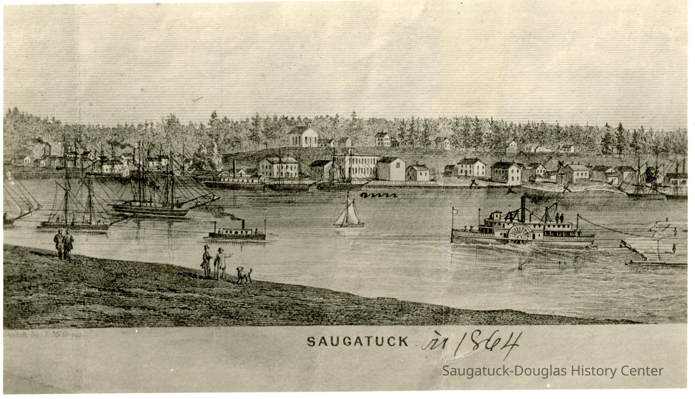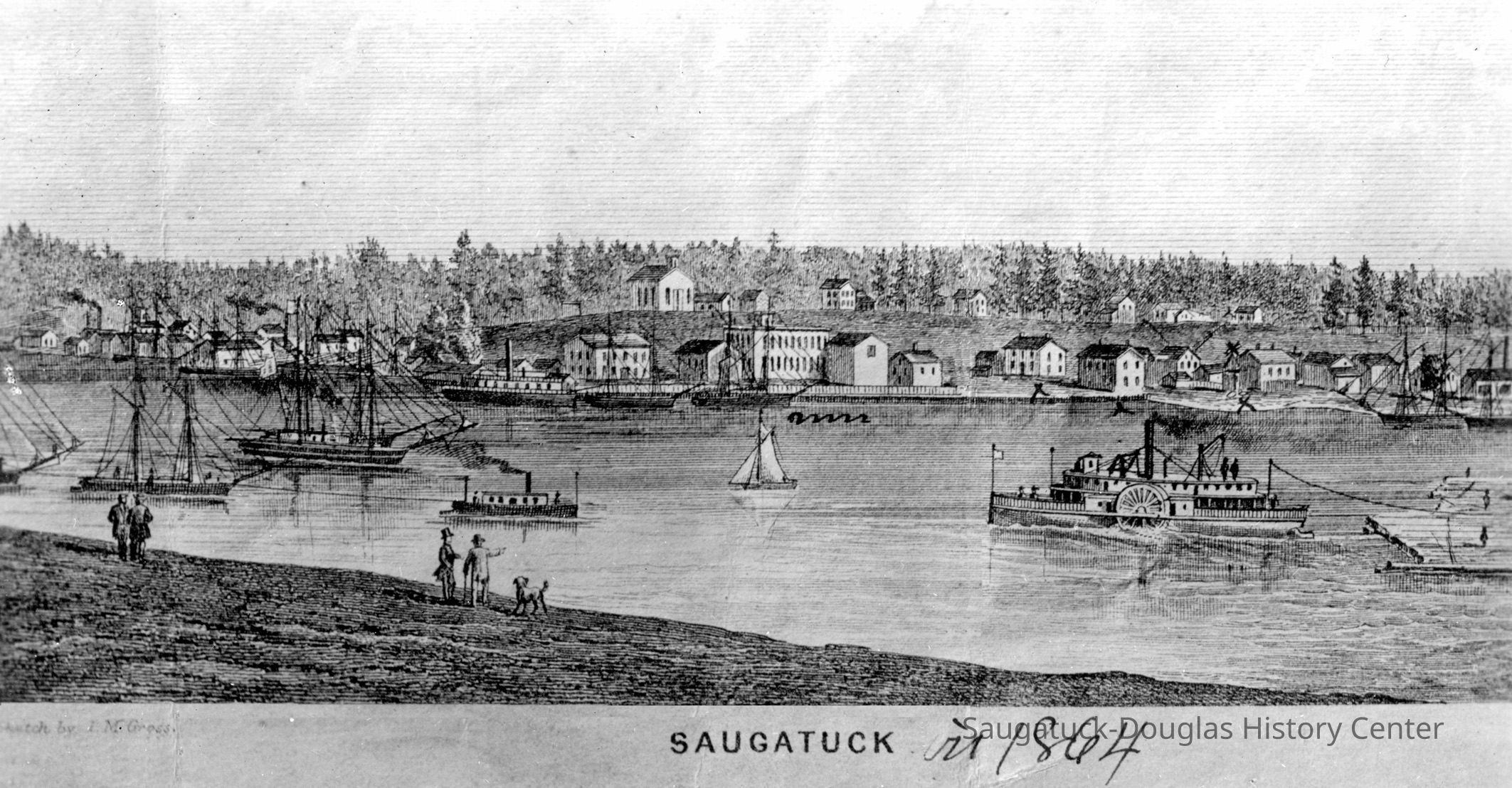 Photograph of an etching that depicts Saugatuck as seen from the opposite bank of the Kalamazoo River. The far river bank and hill beyond is dotted with houses. The river is busily trafficked by sailboats, schooners, steam ships and the side paddle wheeler "Comet" pulling a raft of logs. On the bare bank in the foreground, two pairs of well-dressed men and even a dog gaze at the prosperity and industry of the scene.