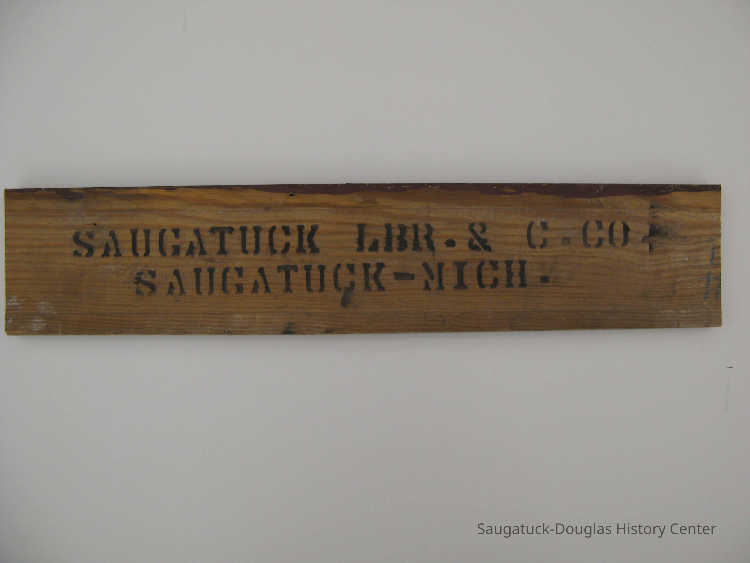 Pine board that is 19.5 inches long and 3.9 inches wide. The front of the board has no decoration other than the words, "Saugatuck LBR. & C. Co. Saugatuck-MI" stenciled on the front in black paint. The back of the piece has a a reddish-brown paint covering it.Context