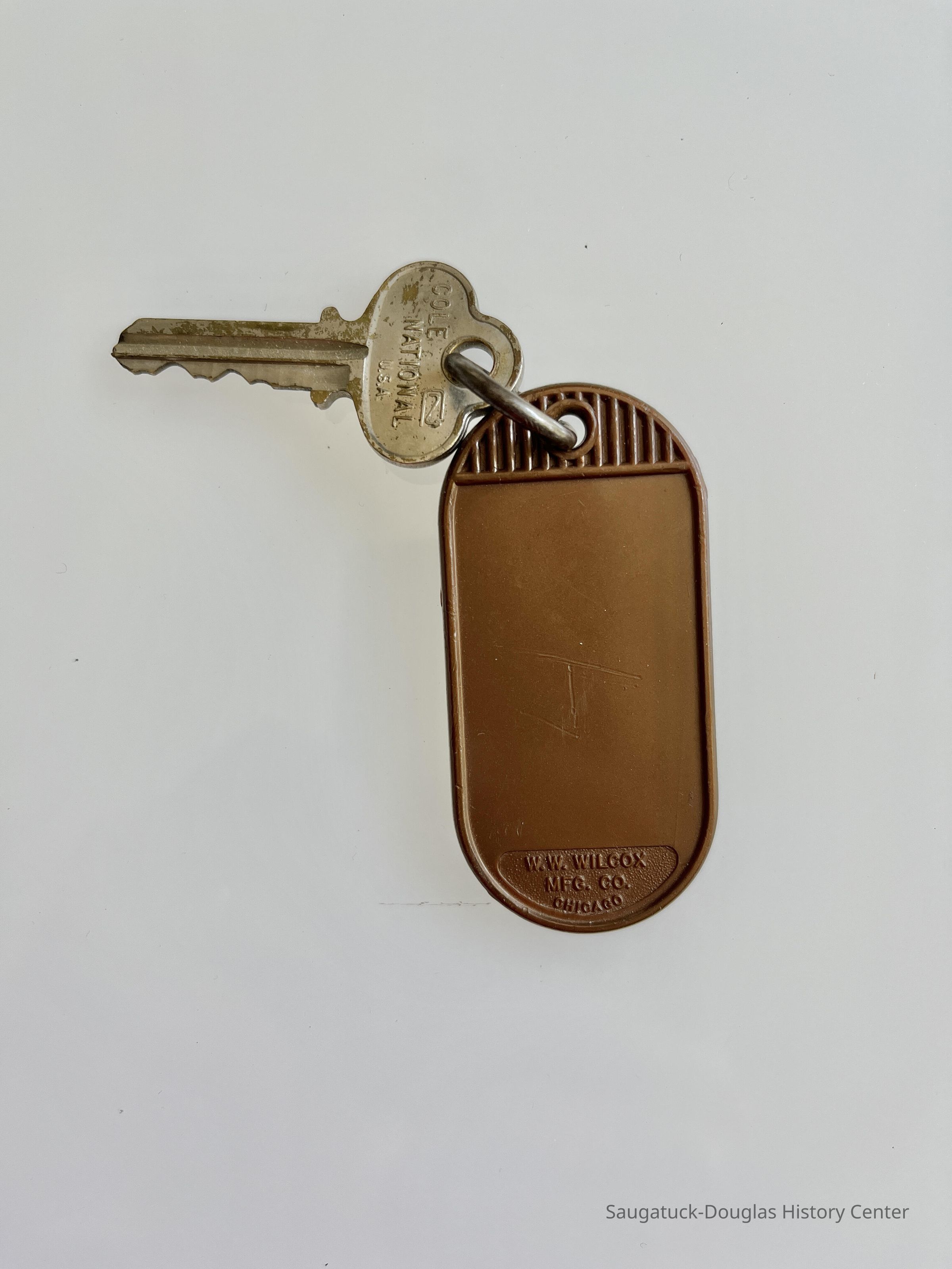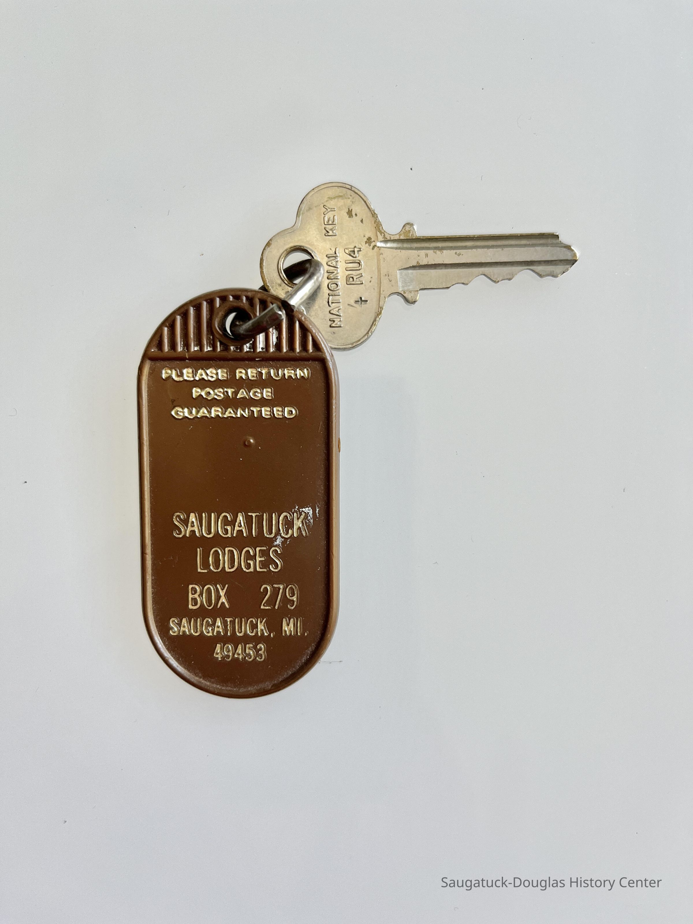 Single metal key attached with a ring to a brown plastic key fob. The heavy-duty fob is oval shaped and imprinted with the text: Please Return Postage Guaranteed Saugatuck Lodges Box 279 Saugatuck, MI. 49453. Back of fob has manufacture's imprint, W.W. Wilcox Mfg. Co. Chicago. Metal key imprinted with National Key RU4/Cole National U.S.A.