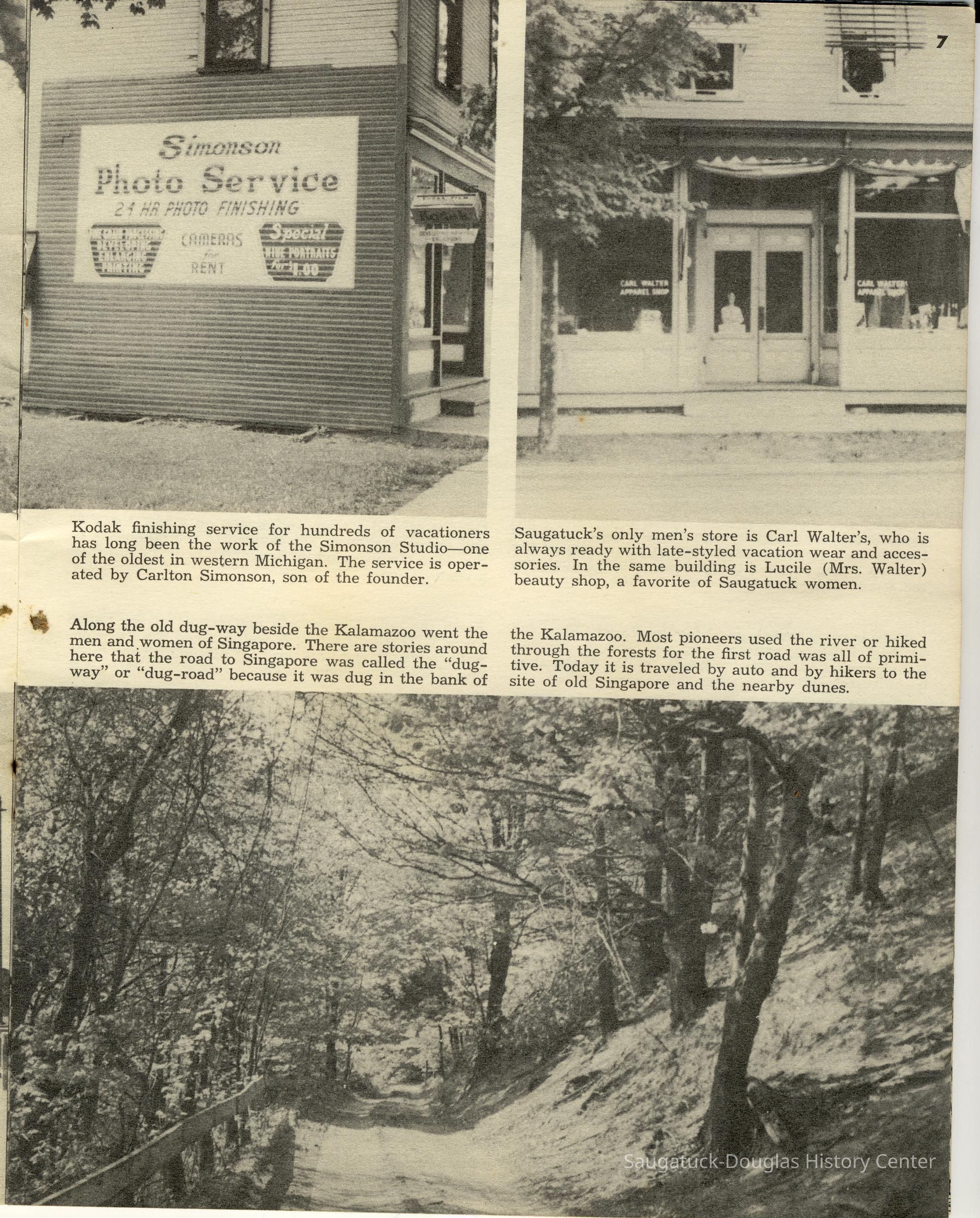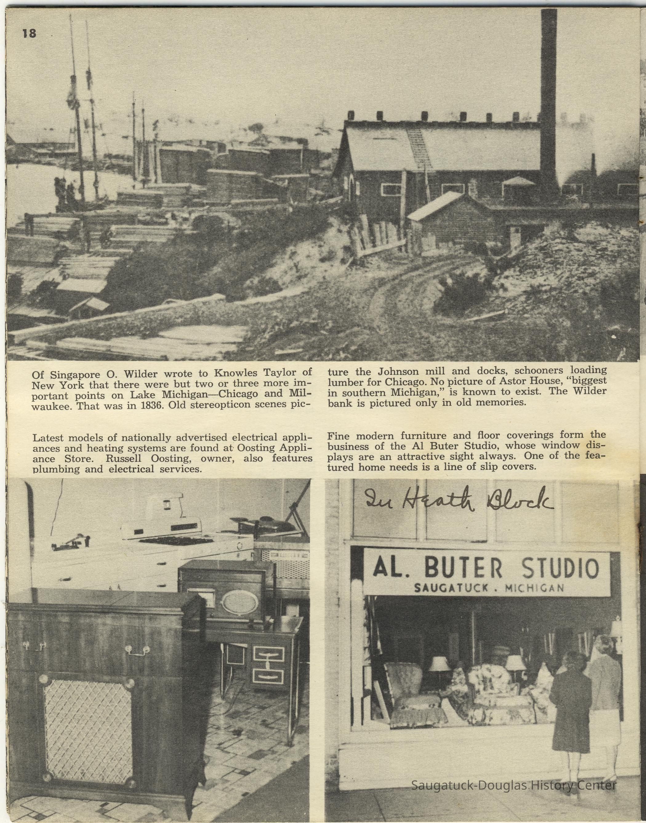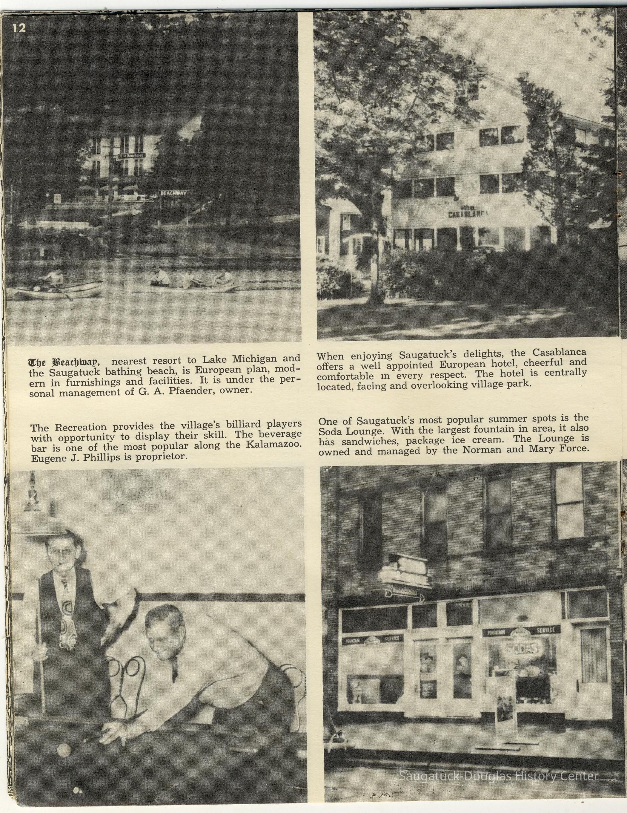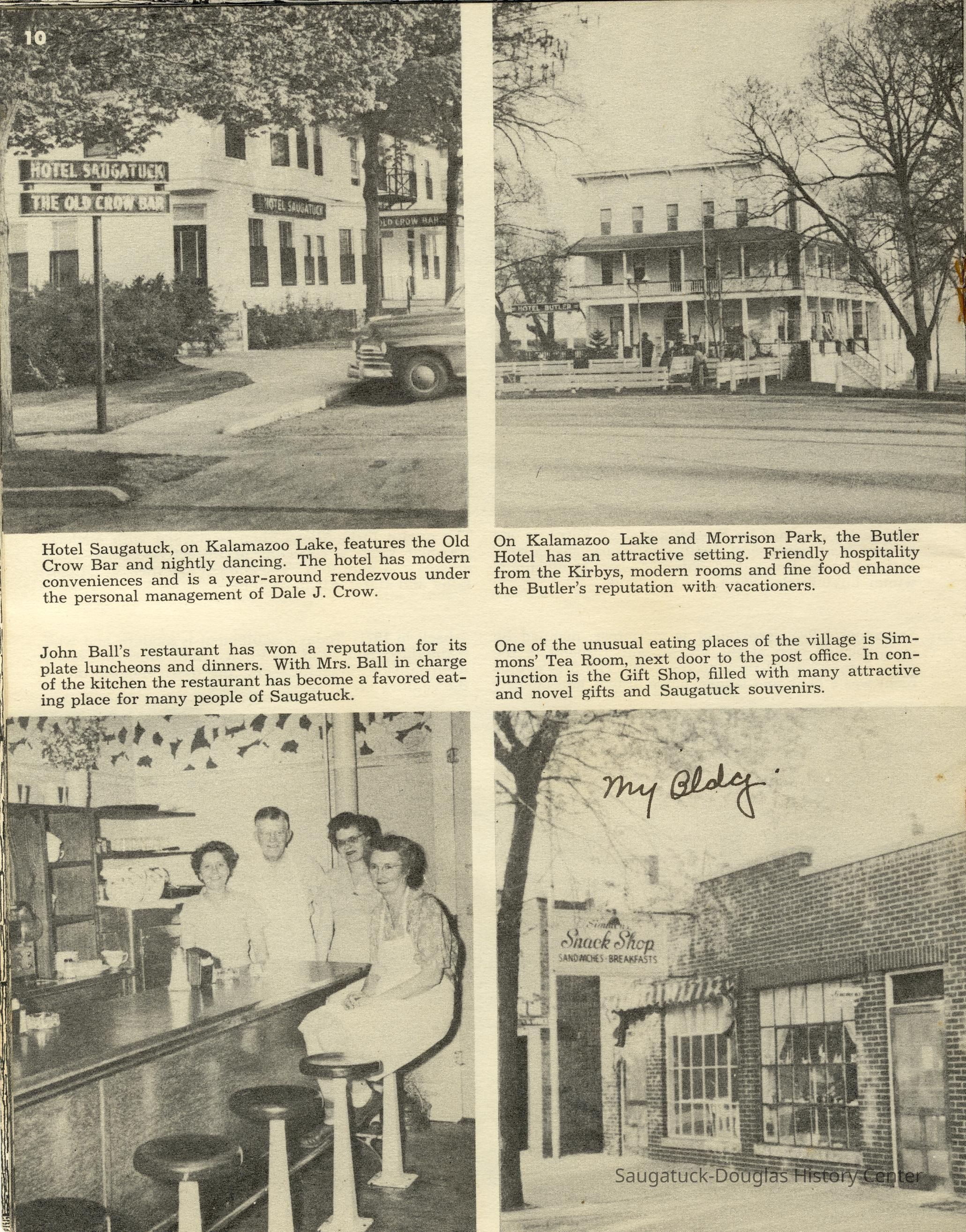 Simmons, William "Bill" R. 1890/1-1966, Heath, May (Francis) 1873-1961, Paxton, Harry, 152 Butler/Kilwins/Flint's Quality Store/Landmark Building/A.B. Taylor Store/Odd Fellow Hall, 310 Butler/Fenn Valley Tasting Room/Consumers Power/Village News & Tobacco, Sorensen, William A., Plummer, Benjamin 1802-1885, Morrison, Mary Elizabeth (Peckham) 1816-1881, Simonson, Carlton Dale 1921-1999, Simonson Studio business, Old Chain Ferry Scows c1836-1947, 317 Butler/Saugatuck Gallery/Singapore Bank Book Store/Kozy Koffee/Variety Shop/Aliber Grocery/Moore Building, Jarvis, Leroy Dillon “Roy" or "Jarvie” 1887-1949, Force, Russell H. 1902-1975, Allen's Shop, 220 Water/Coral Gables/Hotel Saugatuck/Columbia Hotel/Leiendecker's Inn/Ebmeyer Shingle Mill, 40 Butler/Hotel Butler/Grist Mill/Haymarket/Dutch windmill, 115 Butler/Beach Day/MI Coast/Music Box/John Ball's Restaurant/Niles Jewelery 1910, 240 Butler/Blanford Gallery/Taft's Antiques/Simmons of Saugatuck/Tiny Tavern/Schnobel Hardware/Francis Building, Tara Restaurant/Spencer House/200 Center, 215 Butler/Phil's/The Walton/The Embassy Bar & Grill/Cook /Metzger/Wallin Building, Mocini, Giulio "Julio" 1909-1969, Viola Fox Building/103-107 Butler/Leland Lodge/S.A. Morrison home 1850-1978, 428 Butler/Maplewood Hotel b.1860/facade 1923, Beachway Inn/Ferry Inn c1905-, Hotel Casablanca/Grace Hotel/Roamers Inn 1904-1969, 146 Butler/Articles/Thomas Green/Soda Lounge/Fruit Growers Bank 1894, Ox-Bow/Summer School of Art, 132-140 Butler/Brass Anchor/Prajna Gallery/Celebration/Elms Hotel/Francis residence/Morrison Hall, Blue Tempo/349 Culver/Ed-Mar/Louis Beuerle Hotel ?-1976, Phelps, Rutherford Ross 1893-1958, Glik's/Oostings/Saugatuck/Seymour/Ross Phelps/Schnobel's Hardware Company, Krueger Good Store IGA Market, 202 Butler/Pumpernickle's/Carl's AG/Richard Roda's Billiard Hall/Union Hotel 1870, 439 Butler/Butler Pantry/Wilkins/Koning/Nies Hardware, Chamber of Commerce, Saugatuck-Douglas, Saugatuck Woman's Club 1904-present, House, Edwin Harvey 1875-1958, Kasten/House's Cherry Cider Co. at Riverside Fruit Farm, 229-233 Butler/Oosting Appliance Shop East/Green Kandle/Busy Bee, Al Buter Studio, Holley, Burton D., Raxworthy, W.K., 237 Butler/Puddingstone/Sinbad/Carl Walter's/Community Cleaners/Roche building, Phelps, Waterman George Grandison 1849-1934, Old Harbor/Channel piers pre-1906/Ox-Bow Lagoon, Fishtown, Kalamazoo Lighthouses 1839/1858/1956-presentNotes