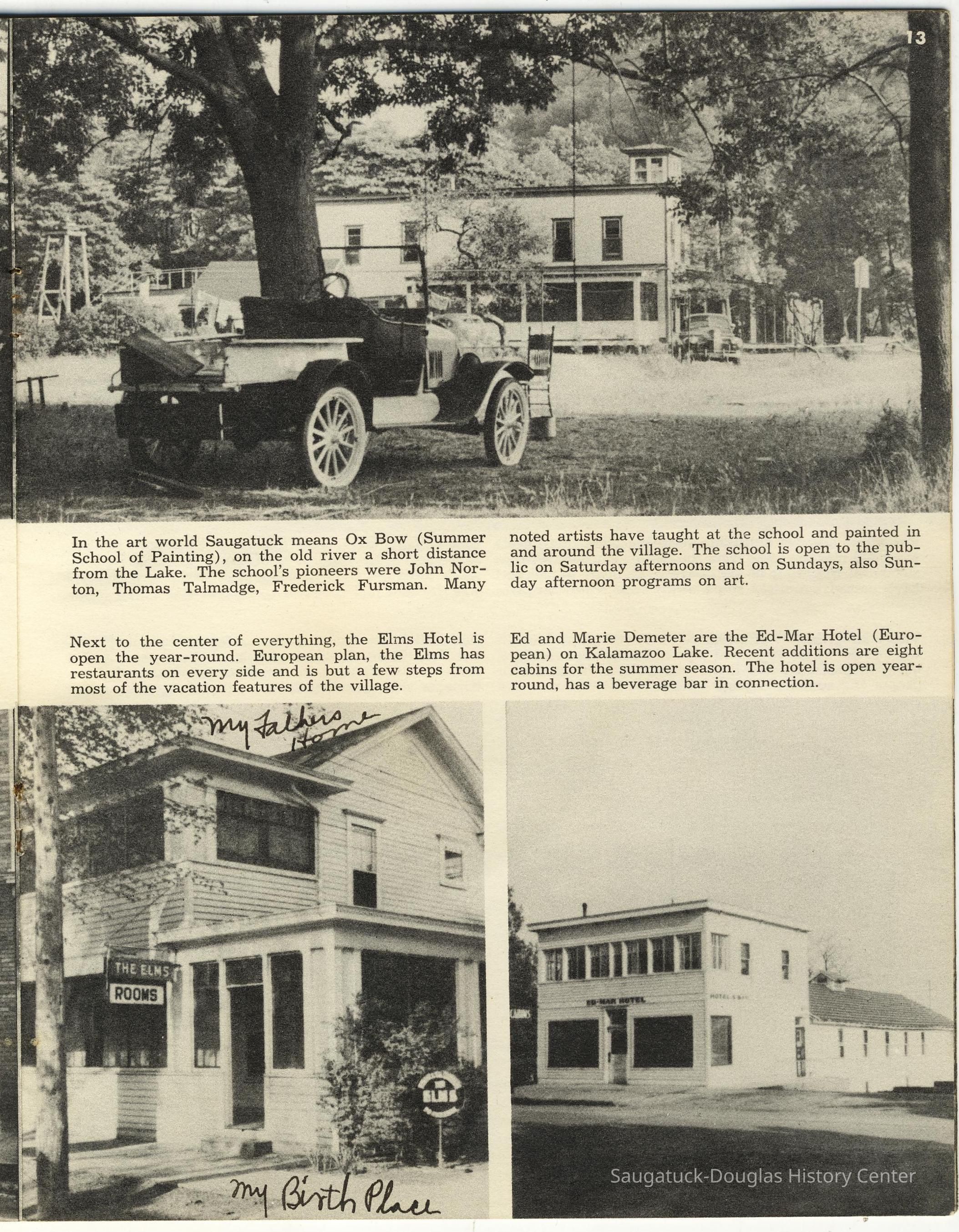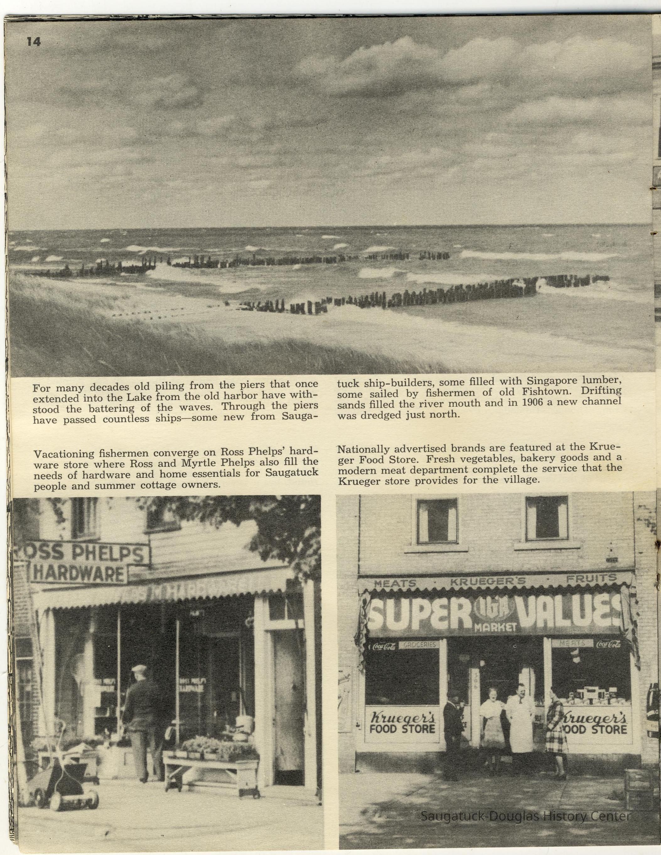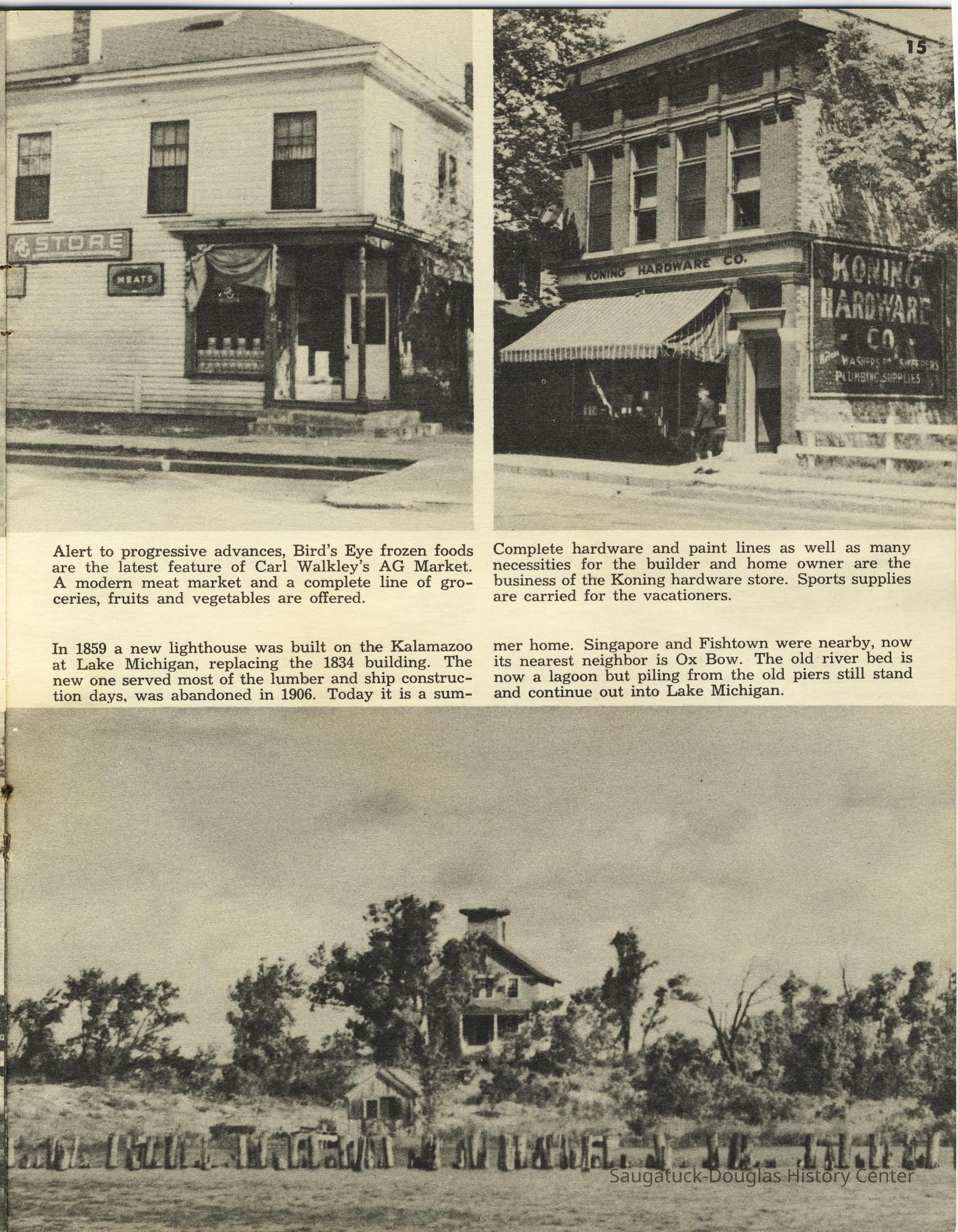 Simmons, William "Bill" R. 1890/1-1966, Heath, May (Francis) 1873-1961, Paxton, Harry, 152 Butler/Kilwins/Flint's Quality Store/Landmark Building/A.B. Taylor Store/Odd Fellow Hall, 310 Butler/Fenn Valley Tasting Room/Consumers Power/Village News & Tobacco, Sorensen, William A., Plummer, Benjamin 1802-1885, Morrison, Mary Elizabeth (Peckham) 1816-1881, Simonson, Carlton Dale 1921-1999, Simonson Studio business, Old Chain Ferry Scows c1836-1947, 317 Butler/Saugatuck Gallery/Singapore Bank Book Store/Kozy Koffee/Variety Shop/Aliber Grocery/Moore Building, Jarvis, Leroy Dillon “Roy" or "Jarvie” 1887-1949, Force, Russell H. 1902-1975, Allen's Shop, 220 Water/Coral Gables/Hotel Saugatuck/Columbia Hotel/Leiendecker's Inn/Ebmeyer Shingle Mill, 40 Butler/Hotel Butler/Grist Mill/Haymarket/Dutch windmill, 115 Butler/Beach Day/MI Coast/Music Box/John Ball's Restaurant/Niles Jewelery 1910, 240 Butler/Blanford Gallery/Taft's Antiques/Simmons of Saugatuck/Tiny Tavern/Schnobel Hardware/Francis Building, Tara Restaurant/Spencer House/200 Center, 215 Butler/Phil's/The Walton/The Embassy Bar & Grill/Cook /Metzger/Wallin Building, Mocini, Giulio "Julio" 1909-1969, Viola Fox Building/103-107 Butler/Leland Lodge/S.A. Morrison home 1850-1978, 428 Butler/Maplewood Hotel b.1860/facade 1923, Beachway Inn/Ferry Inn c1905-, Hotel Casablanca/Grace Hotel/Roamers Inn 1904-1969, 146 Butler/Articles/Thomas Green/Soda Lounge/Fruit Growers Bank 1894, Ox-Bow/Summer School of Art, 132-140 Butler/Brass Anchor/Prajna Gallery/Celebration/Elms Hotel/Francis residence/Morrison Hall, Blue Tempo/349 Culver/Ed-Mar/Louis Beuerle Hotel ?-1976, Phelps, Rutherford Ross 1893-1958, Glik's/Oostings/Saugatuck/Seymour/Ross Phelps/Schnobel's Hardware Company, Krueger Good Store IGA Market, 202 Butler/Pumpernickle's/Carl's AG/Richard Roda's Billiard Hall/Union Hotel 1870, 439 Butler/Butler Pantry/Wilkins/Koning/Nies Hardware, Chamber of Commerce, Saugatuck-Douglas, Saugatuck Woman's Club 1904-present, House, Edwin Harvey 1875-1958, Kasten/House's Cherry Cider Co. at Riverside Fruit Farm, 229-233 Butler/Oosting Appliance Shop East/Green Kandle/Busy Bee, Al Buter Studio, Holley, Burton D., Raxworthy, W.K., 237 Butler/Puddingstone/Sinbad/Carl Walter's/Community Cleaners/Roche building, Phelps, Waterman George Grandison 1849-1934, Old Harbor/Channel piers pre-1906/Ox-Bow Lagoon, Fishtown, Kalamazoo Lighthouses 1839/1858/1956-presentNotes