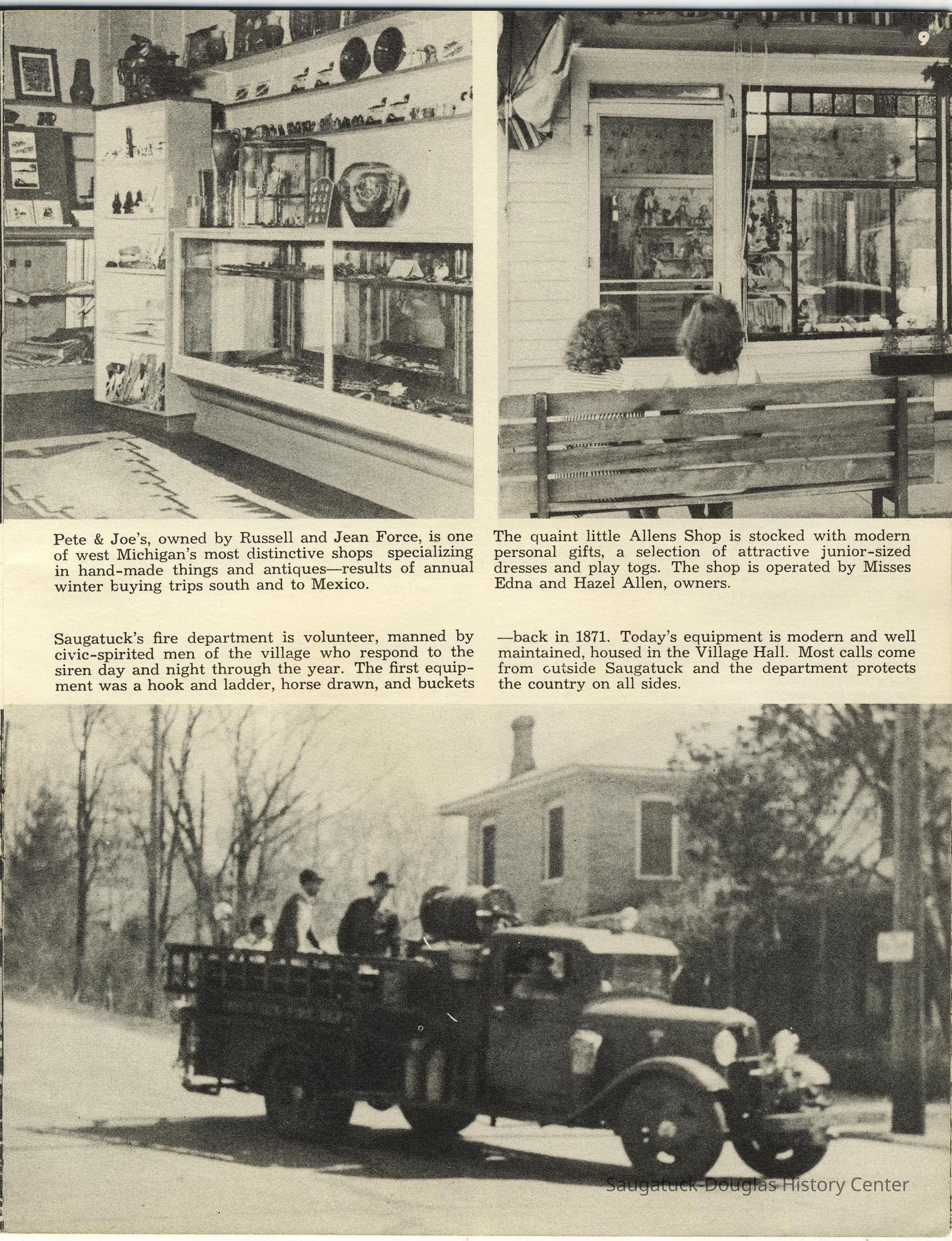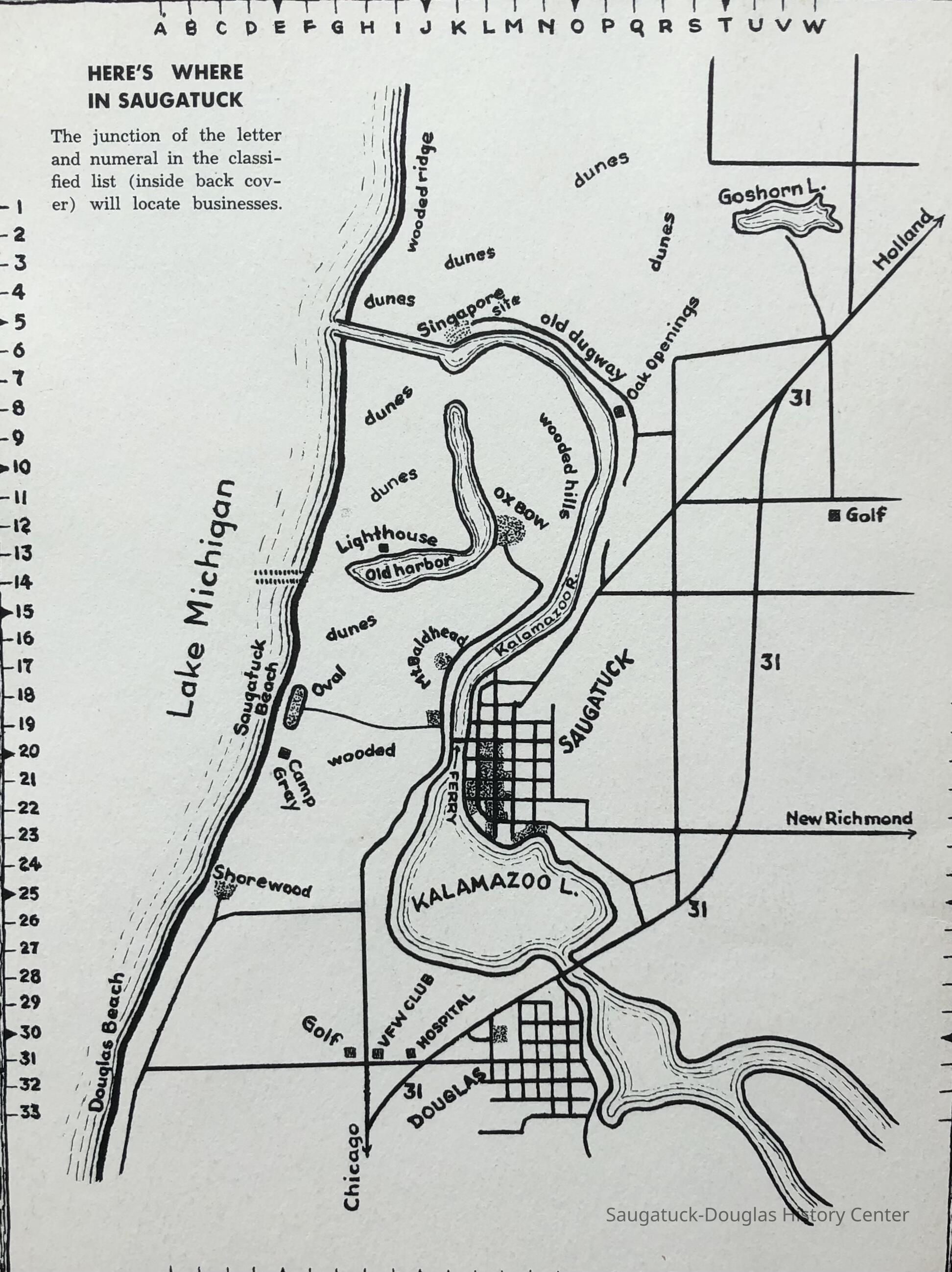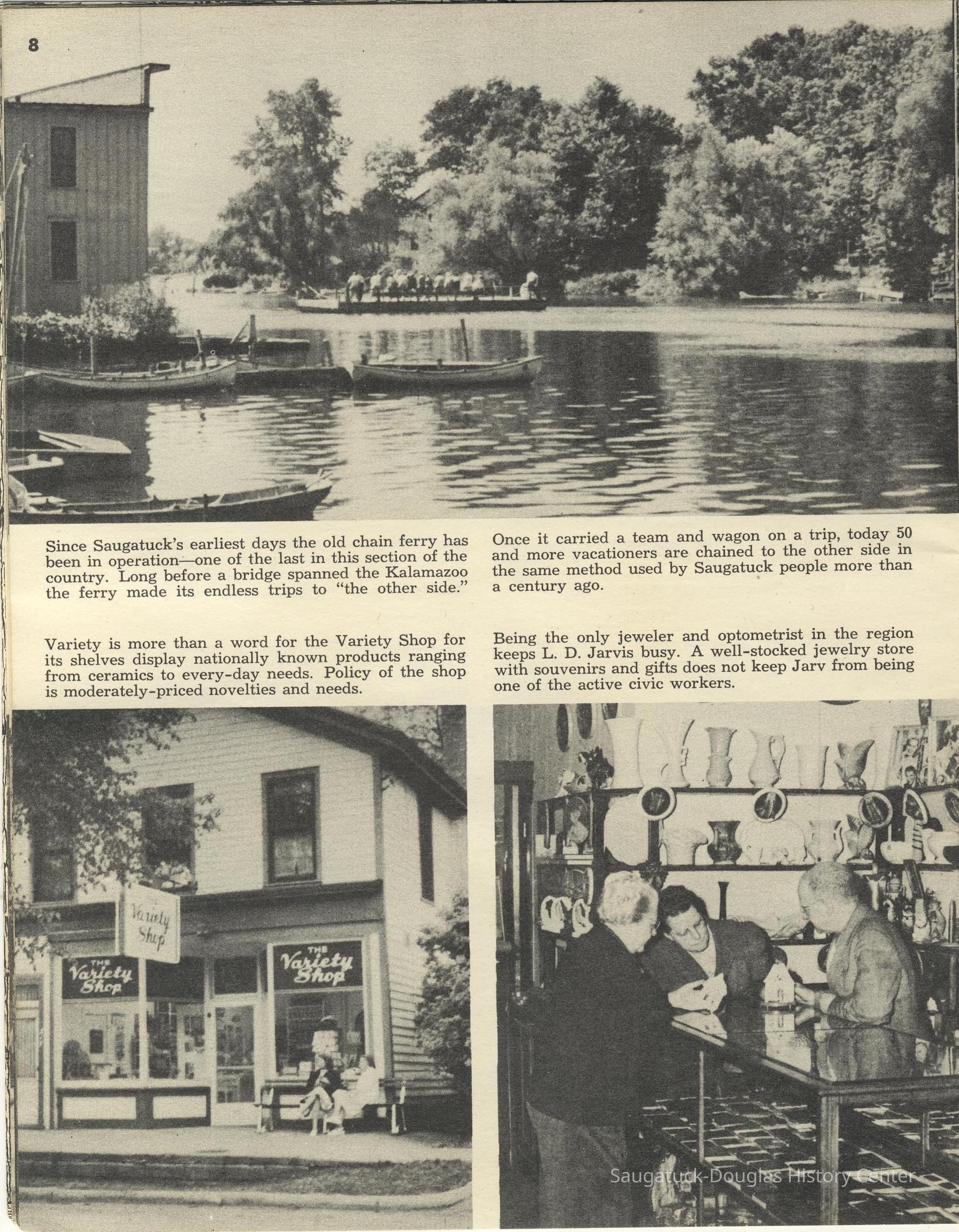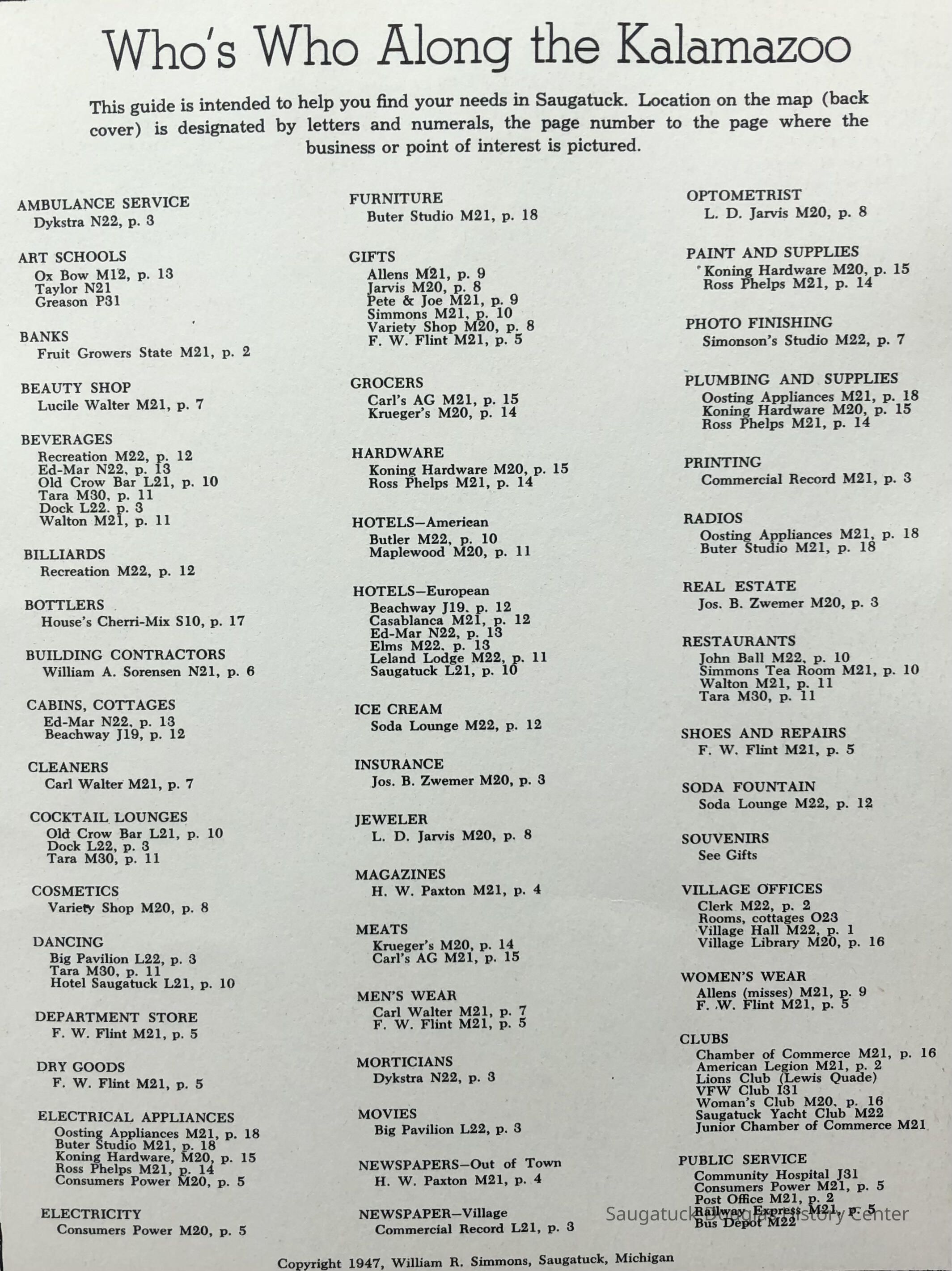 Simmons, William "Bill" R. 1890/1-1966, Heath, May (Francis) 1873-1961, Paxton, Harry, 152 Butler/Kilwins/Flint's Quality Store/Landmark Building/A.B. Taylor Store/Odd Fellow Hall, 310 Butler/Fenn Valley Tasting Room/Consumers Power/Village News & Tobacco, Sorensen, William A., Plummer, Benjamin 1802-1885, Morrison, Mary Elizabeth (Peckham) 1816-1881, Simonson, Carlton Dale 1921-1999, Simonson Studio business, Old Chain Ferry Scows c1836-1947, 317 Butler/Saugatuck Gallery/Singapore Bank Book Store/Kozy Koffee/Variety Shop/Aliber Grocery/Moore Building, Jarvis, Leroy Dillon “Roy" or "Jarvie” 1887-1949, Force, Russell H. 1902-1975, Allen's Shop, 220 Water/Coral Gables/Hotel Saugatuck/Columbia Hotel/Leiendecker's Inn/Ebmeyer Shingle Mill, 40 Butler/Hotel Butler/Grist Mill/Haymarket/Dutch windmill, 115 Butler/Beach Day/MI Coast/Music Box/John Ball's Restaurant/Niles Jewelery 1910, 240 Butler/Blanford Gallery/Taft's Antiques/Simmons of Saugatuck/Tiny Tavern/Schnobel Hardware/Francis Building, Tara Restaurant/Spencer House/200 Center, 215 Butler/Phil's/The Walton/The Embassy Bar & Grill/Cook /Metzger/Wallin Building, Mocini, Giulio "Julio" 1909-1969, Viola Fox Building/103-107 Butler/Leland Lodge/S.A. Morrison home 1850-1978, 428 Butler/Maplewood Hotel b.1860/facade 1923, Beachway Inn/Ferry Inn c1905-, Hotel Casablanca/Grace Hotel/Roamers Inn 1904-1969, 146 Butler/Articles/Thomas Green/Soda Lounge/Fruit Growers Bank 1894, Ox-Bow/Summer School of Art, 132-140 Butler/Brass Anchor/Prajna Gallery/Celebration/Elms Hotel/Francis residence/Morrison Hall, Blue Tempo/349 Culver/Ed-Mar/Louis Beuerle Hotel ?-1976, Phelps, Rutherford Ross 1893-1958, Glik's/Oostings/Saugatuck/Seymour/Ross Phelps/Schnobel's Hardware Company, Krueger Good Store IGA Market, 202 Butler/Pumpernickle's/Carl's AG/Richard Roda's Billiard Hall/Union Hotel 1870, 439 Butler/Butler Pantry/Wilkins/Koning/Nies Hardware, Chamber of Commerce, Saugatuck-Douglas, Saugatuck Woman's Club 1904-present, House, Edwin Harvey 1875-1958, Kasten/House's Cherry Cider Co. at Riverside Fruit Farm, 229-233 Butler/Oosting Appliance Shop East/Green Kandle/Busy Bee, Al Buter Studio, Holley, Burton D., Raxworthy, W.K., 237 Butler/Puddingstone/Sinbad/Carl Walter's/Community Cleaners/Roche building, Phelps, Waterman George Grandison 1849-1934, Old Harbor/Channel piers pre-1906/Ox-Bow Lagoon, Fishtown, Kalamazoo Lighthouses 1839/1858/1956-presentNotes