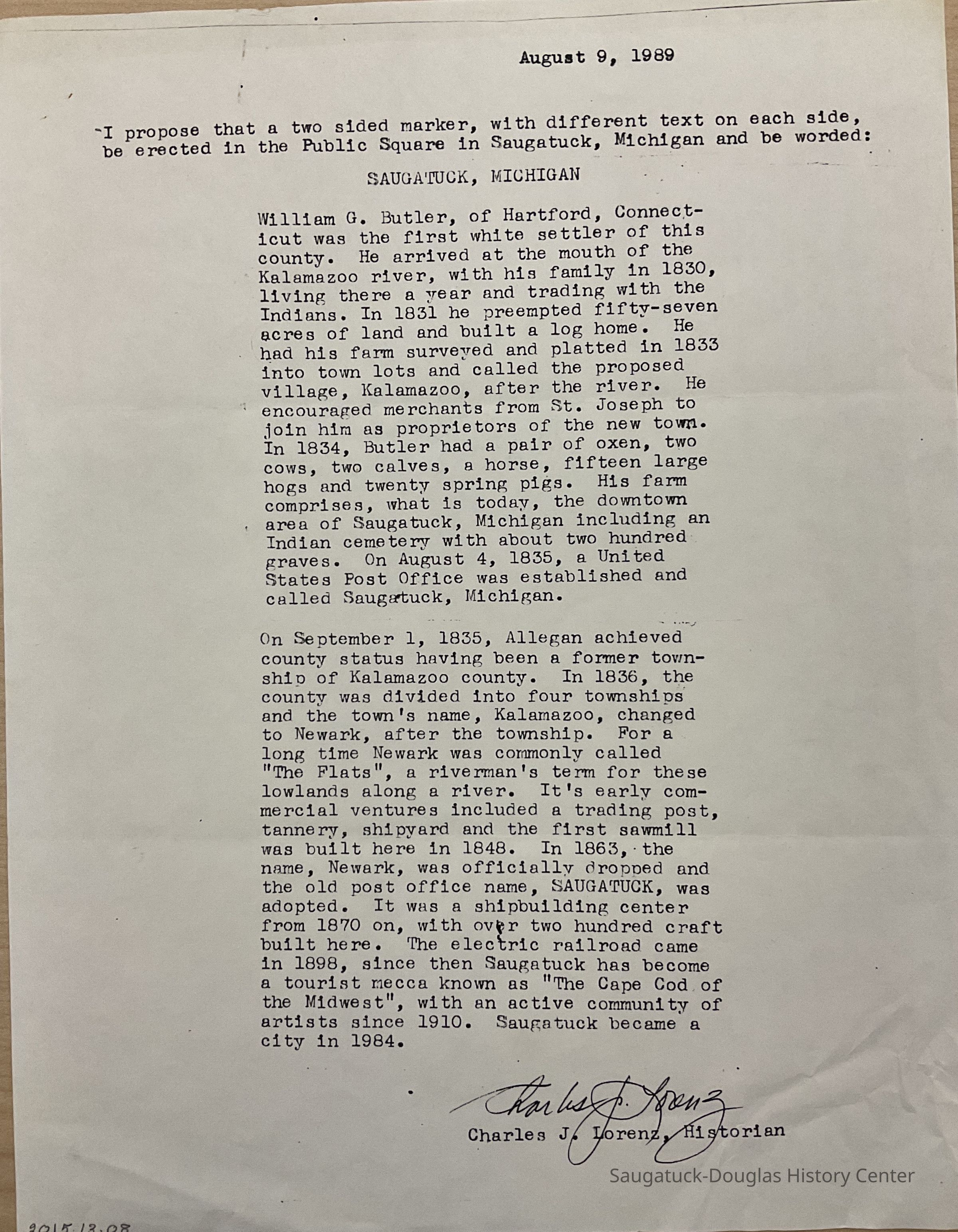 The proposed wording for the historical marker in front of the City Hall in SaugatuckCataloged By