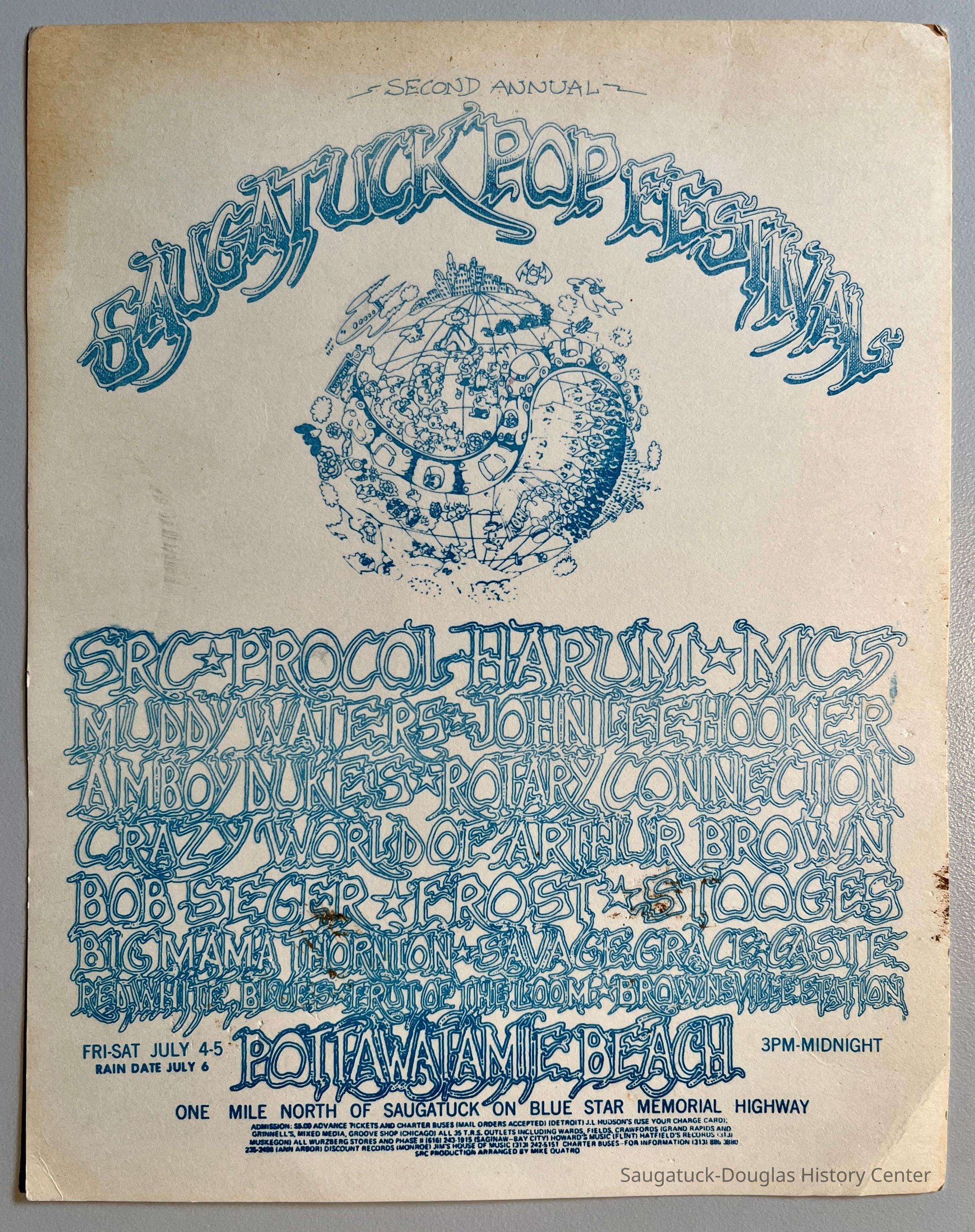 Flyer from the 1969 second annual Saugatuck Pops Festival at Pottawatamie Beach. The flyer is printed with blue ink on off-white card stock.