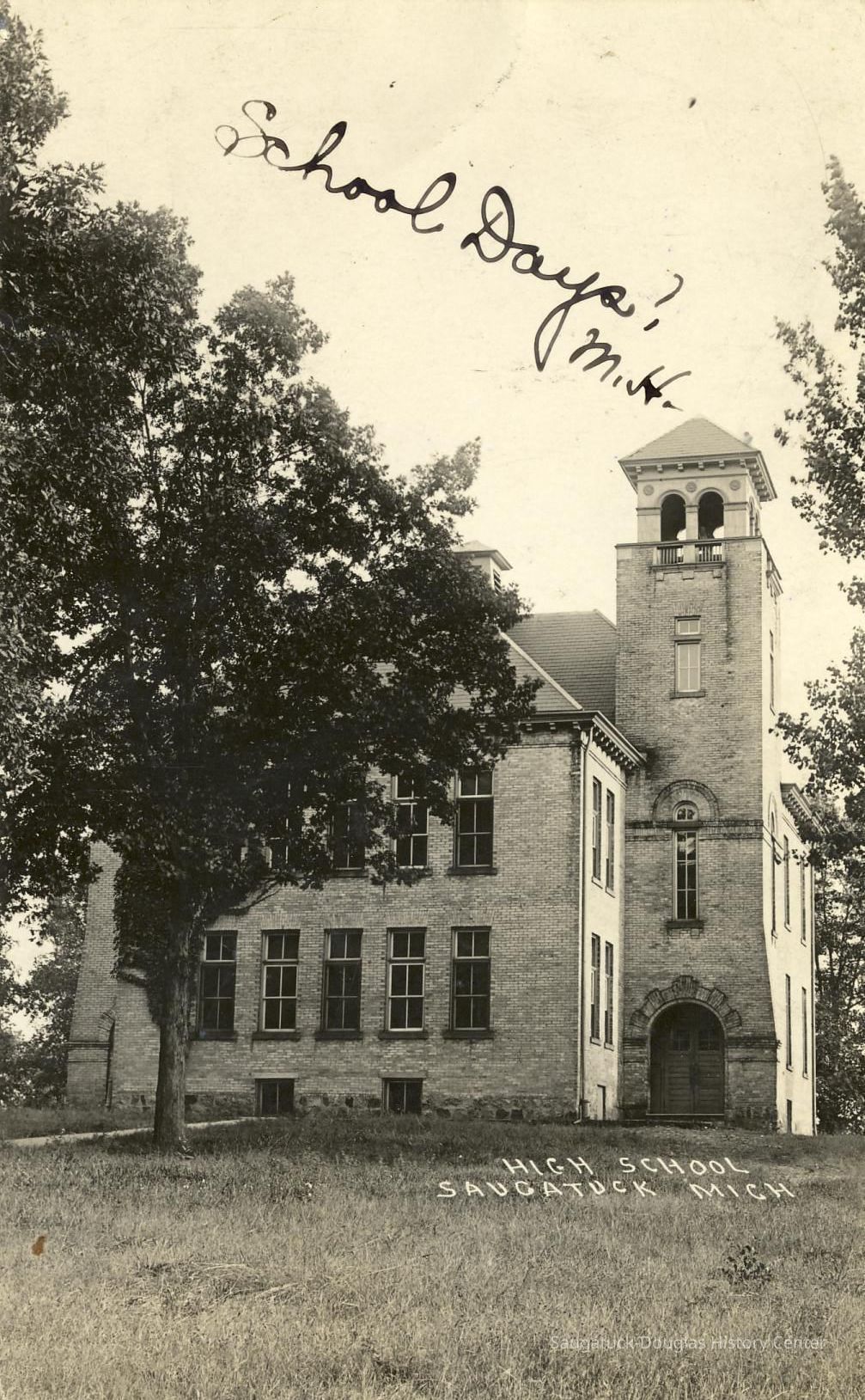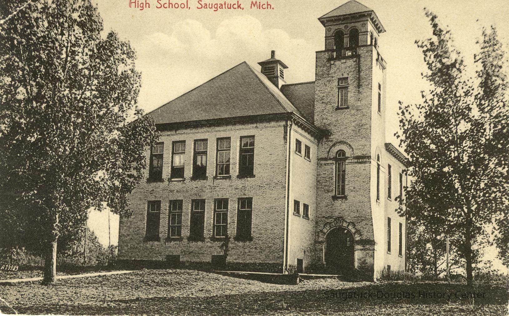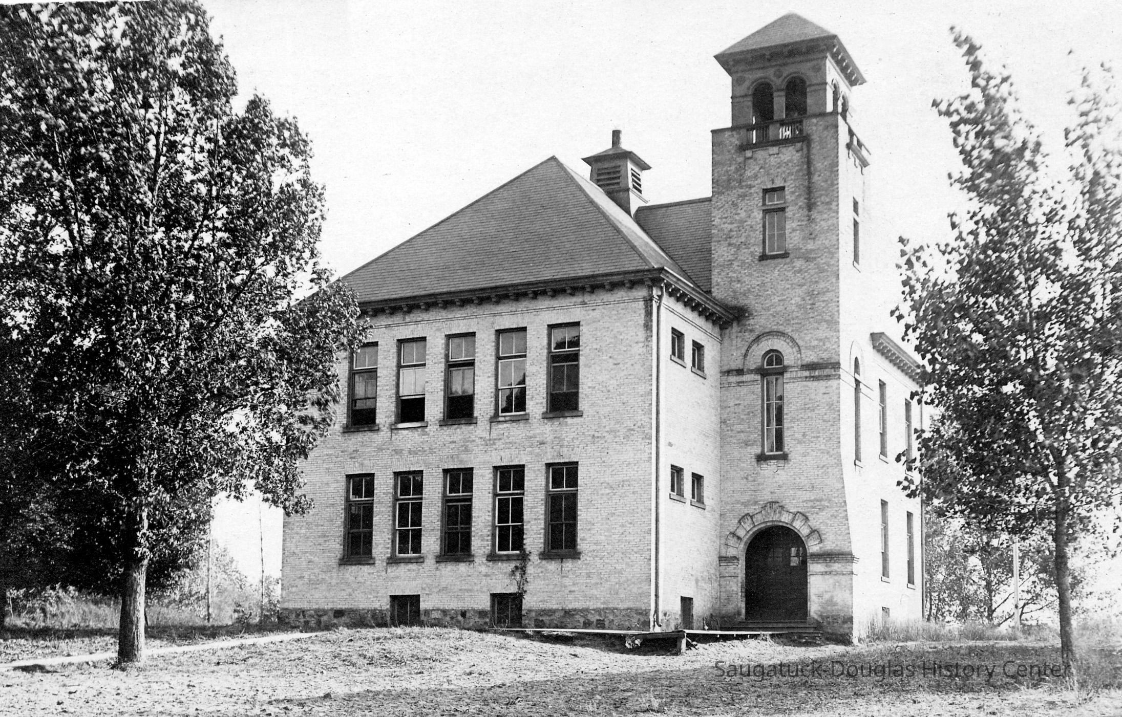 Digital scan of a postcards that pictures the Saugatuck school building with its distinctive tower and arched doorway.Photograph Details