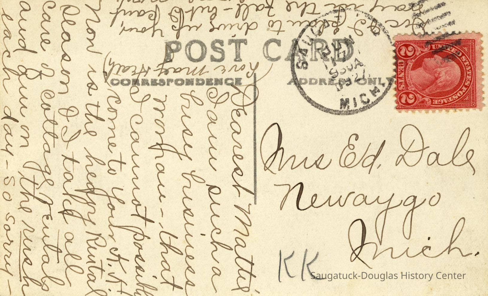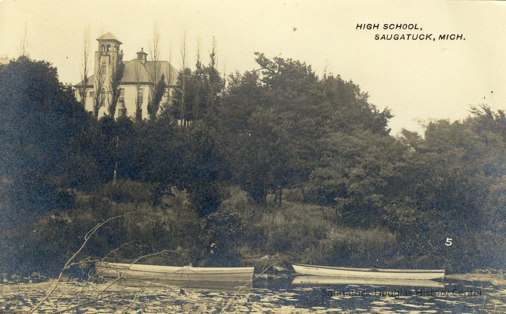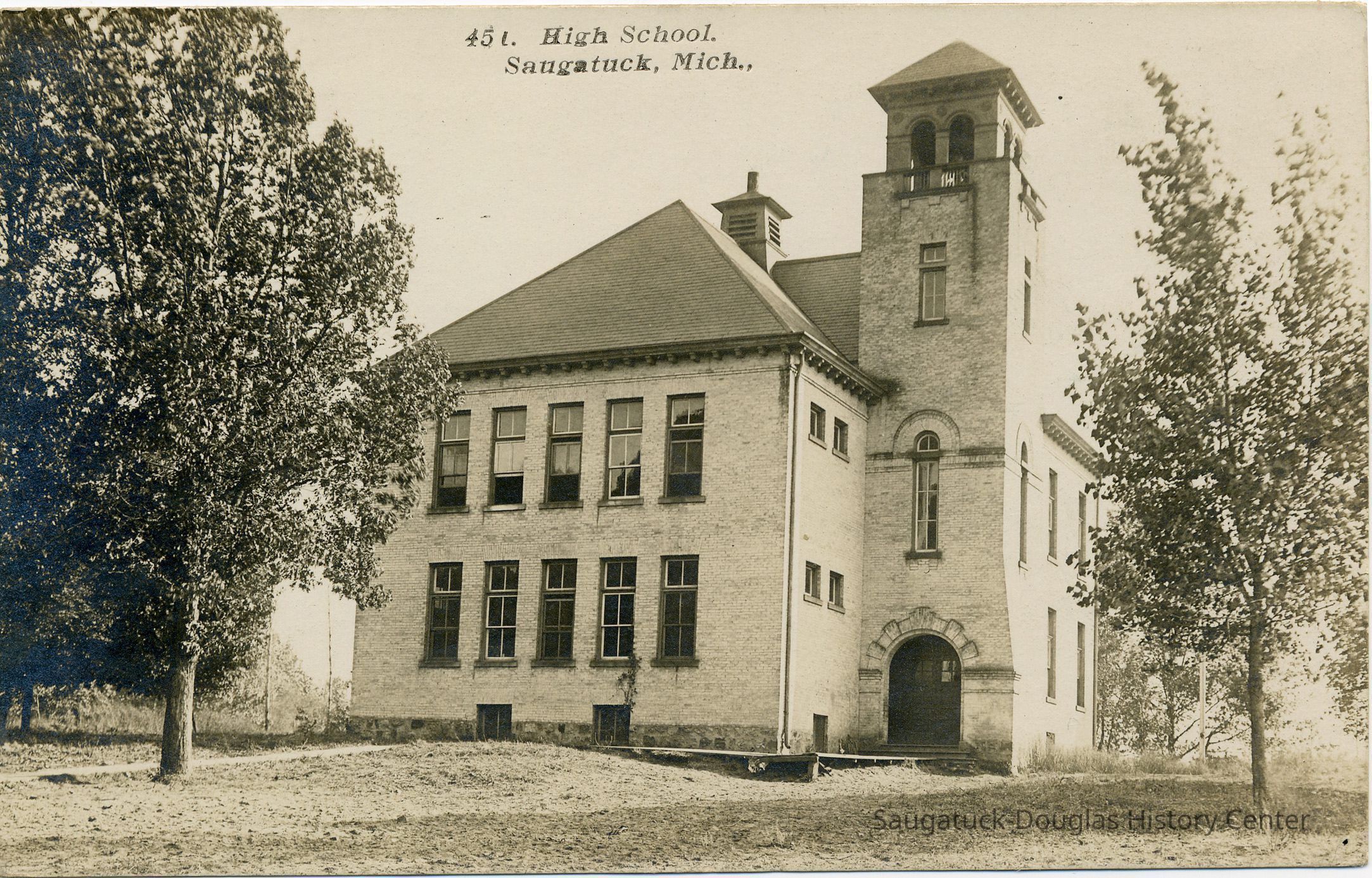 Digital scan of a postcards that pictures the Saugatuck school building with its distinctive tower and arched doorway.Photograph Details