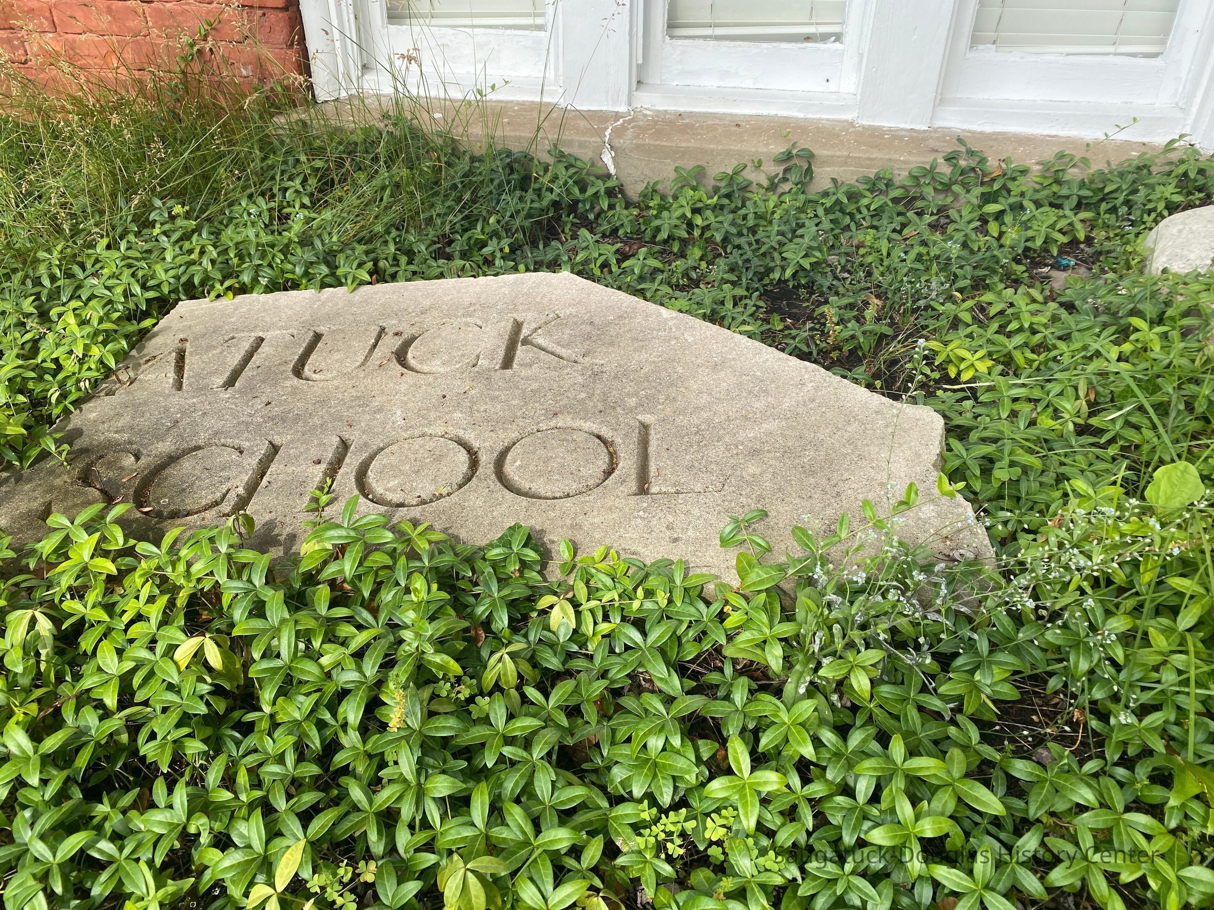 Fragment of a stone that graced the entry to the Saugatuck Public School (built in 1897) before the building was destroyed in a 1950 fire.Context