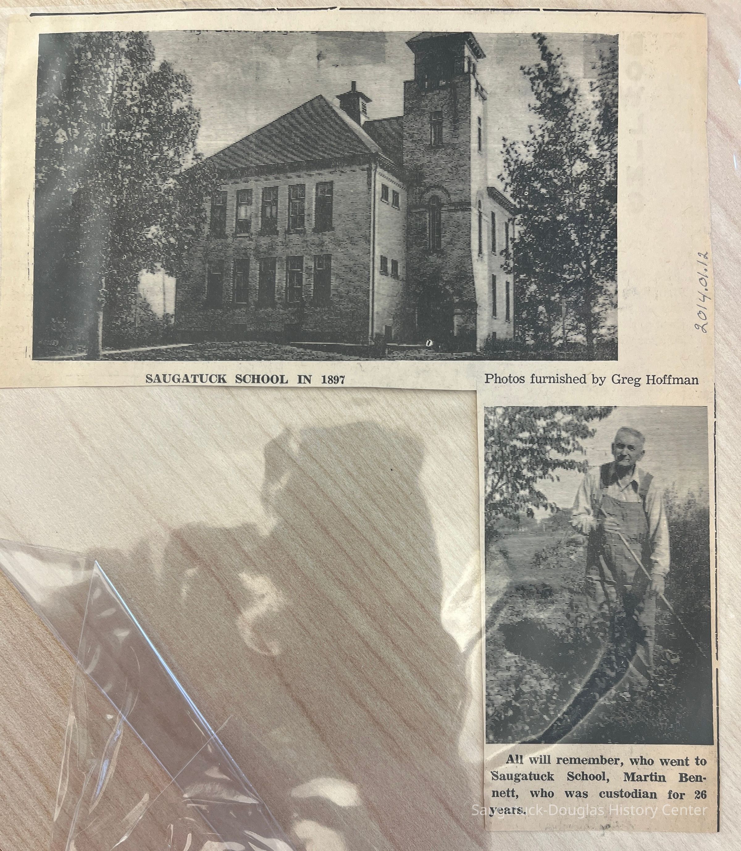 This newspaper clipping features an early picture of the Saugatuck School and the photo of the custodian, Martin Bennett. No date on the article.Collection