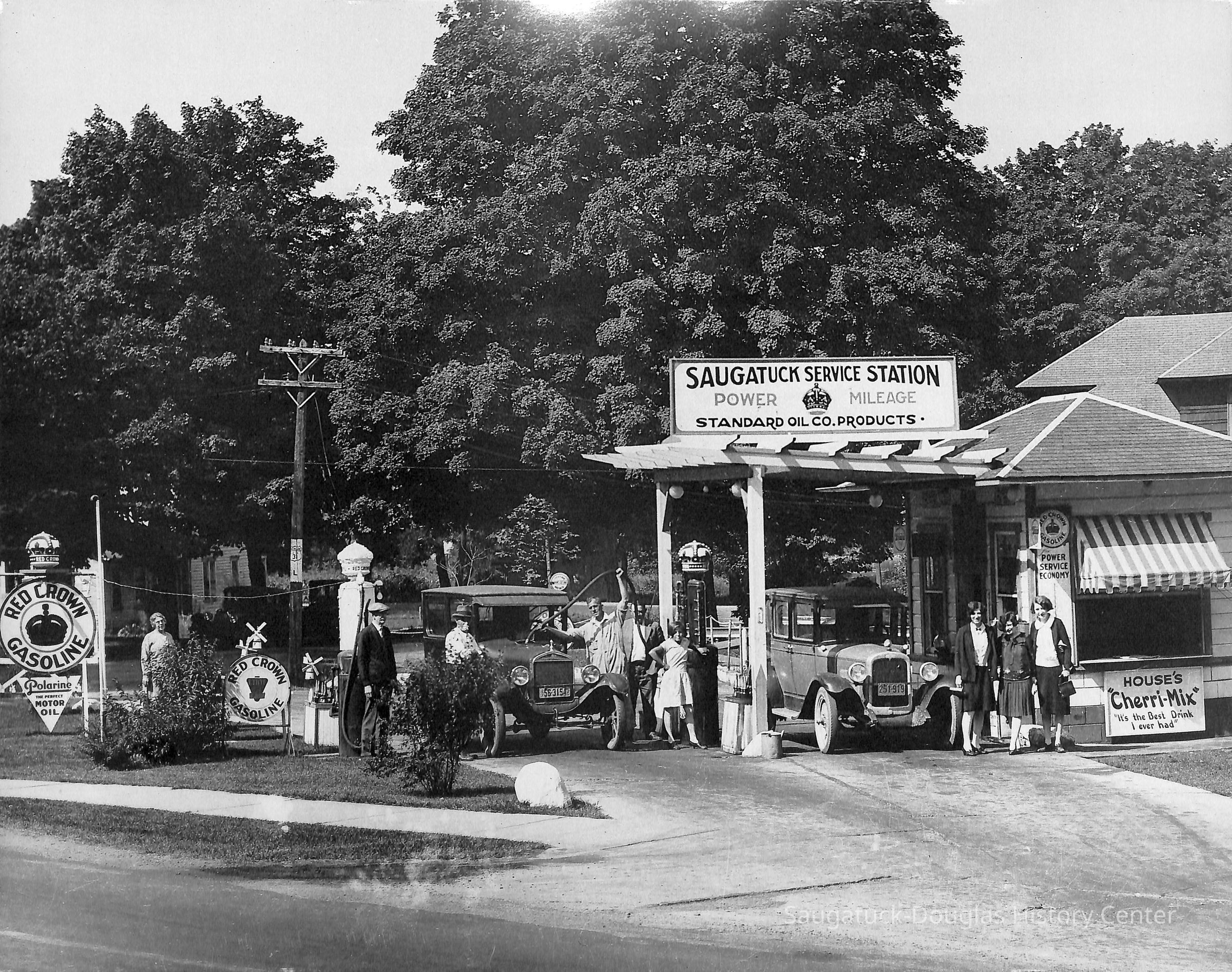 11x14" black and white photograph of the Saugatuck Service Station showing two 1920s model cars, one being filled with gas from a Standard oil visible gas pump with a red crown on top. Three women standing by the door of the service station, 5 people (4 men and one girl) stand near the car being filled, a woman stands in the back of the scene. Other signs are for House's Cherri-Mix. The licence plate on the car has the date 1927.