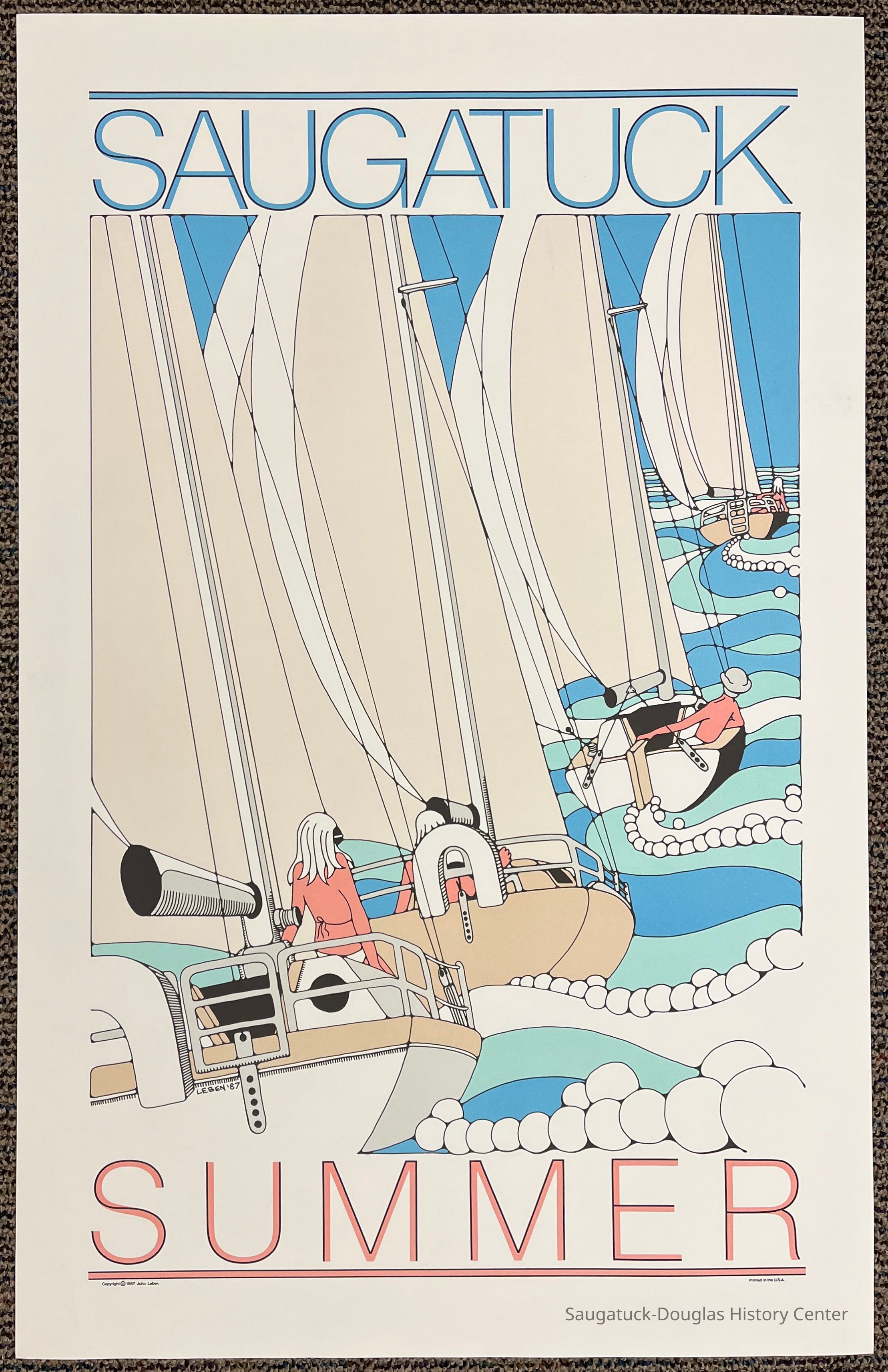 Color poster of four stylized sailboats sailing away from the viewer. The sails are shades of white and beige. The sailors are a redish-tan and the waves are bule and green with pearl-like strands of white wake. All items have a crisp black outline. The top and bottom of the poster includes in sanserif type the words "Saugatuck" and "Summer" The poster includes a printed signature "Leben '87" on the back of the closest sailboat, "Copyright 1987 John Leben" in the lower left corner and "Printed in the U.S.A." in the lower right corner.Type of Print