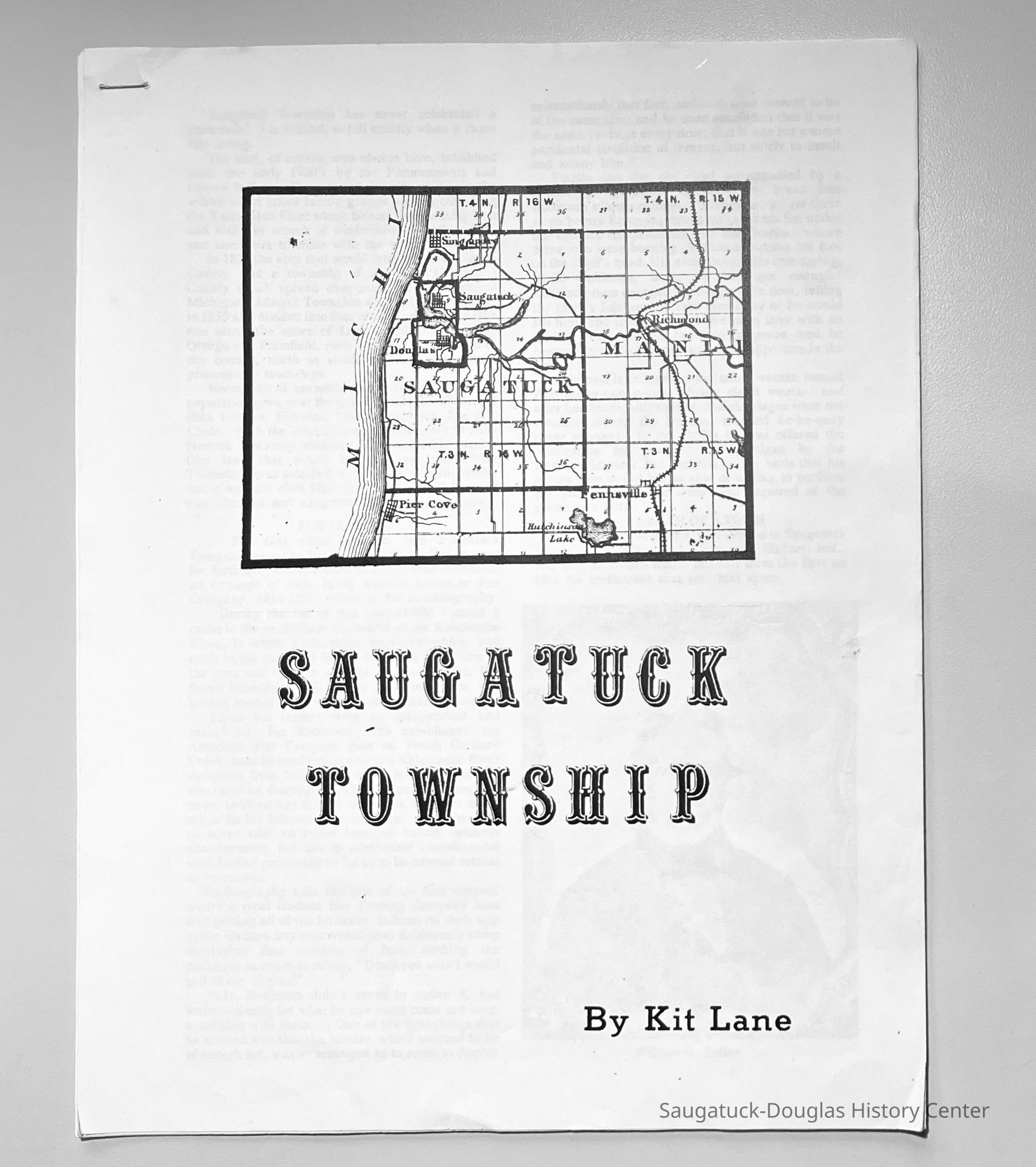 Kit's notes and resources for writing this booklet are in her archive box, "Township" folder. On the back of the last page is the text "This history of Saugatuck Township was commissioned in 1987 by the Saugatuck Township Board in celebration of the sesquicentennial of the State of Michigan."Collection