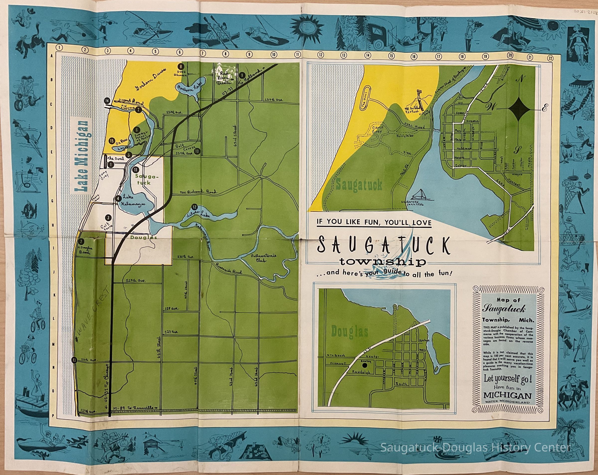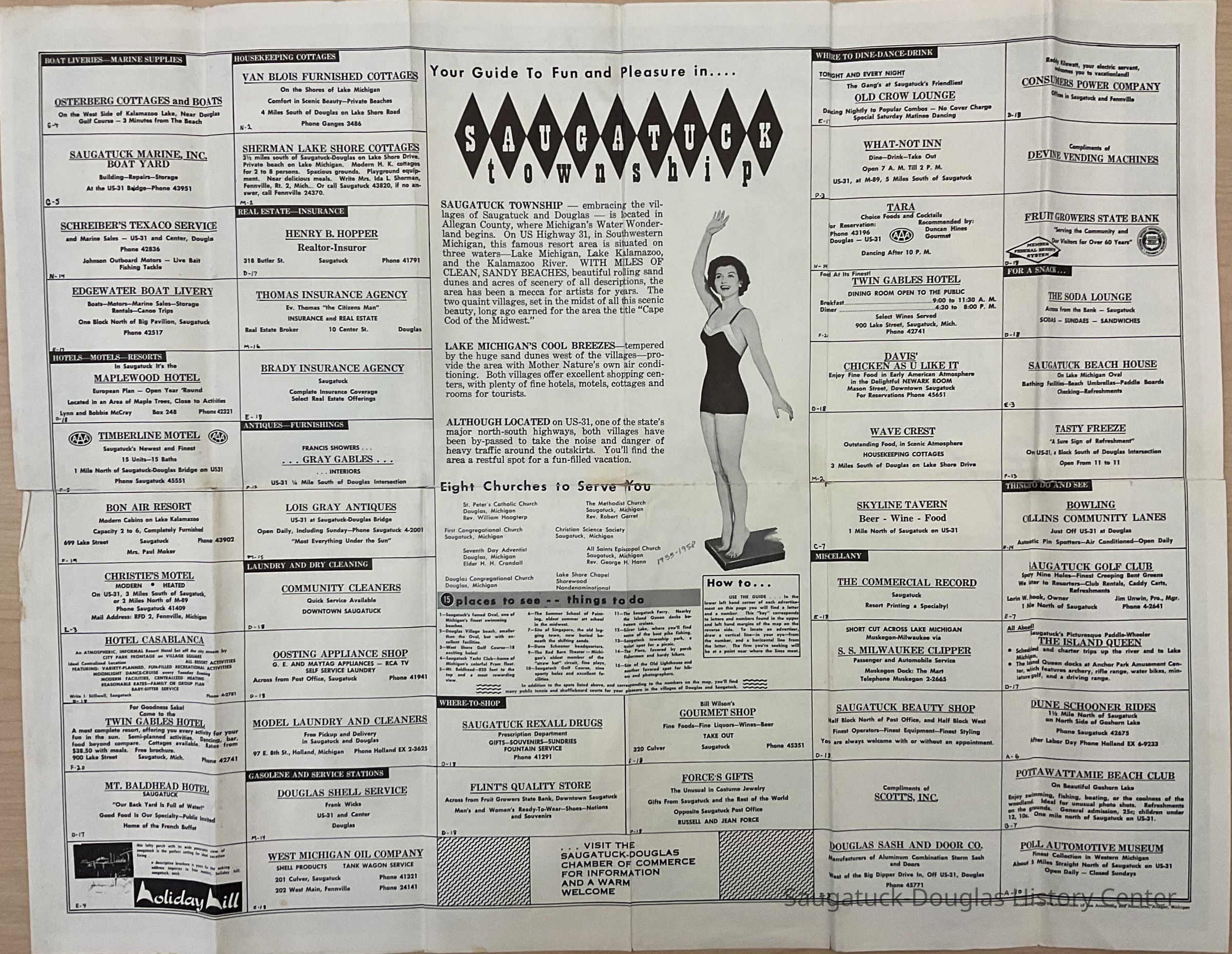 1955-58 Tourist map of Saugatuck Township. showing Saugatuck and Douglas. On the reverse side is a listing of area businesses that helped pay for the map.Collection