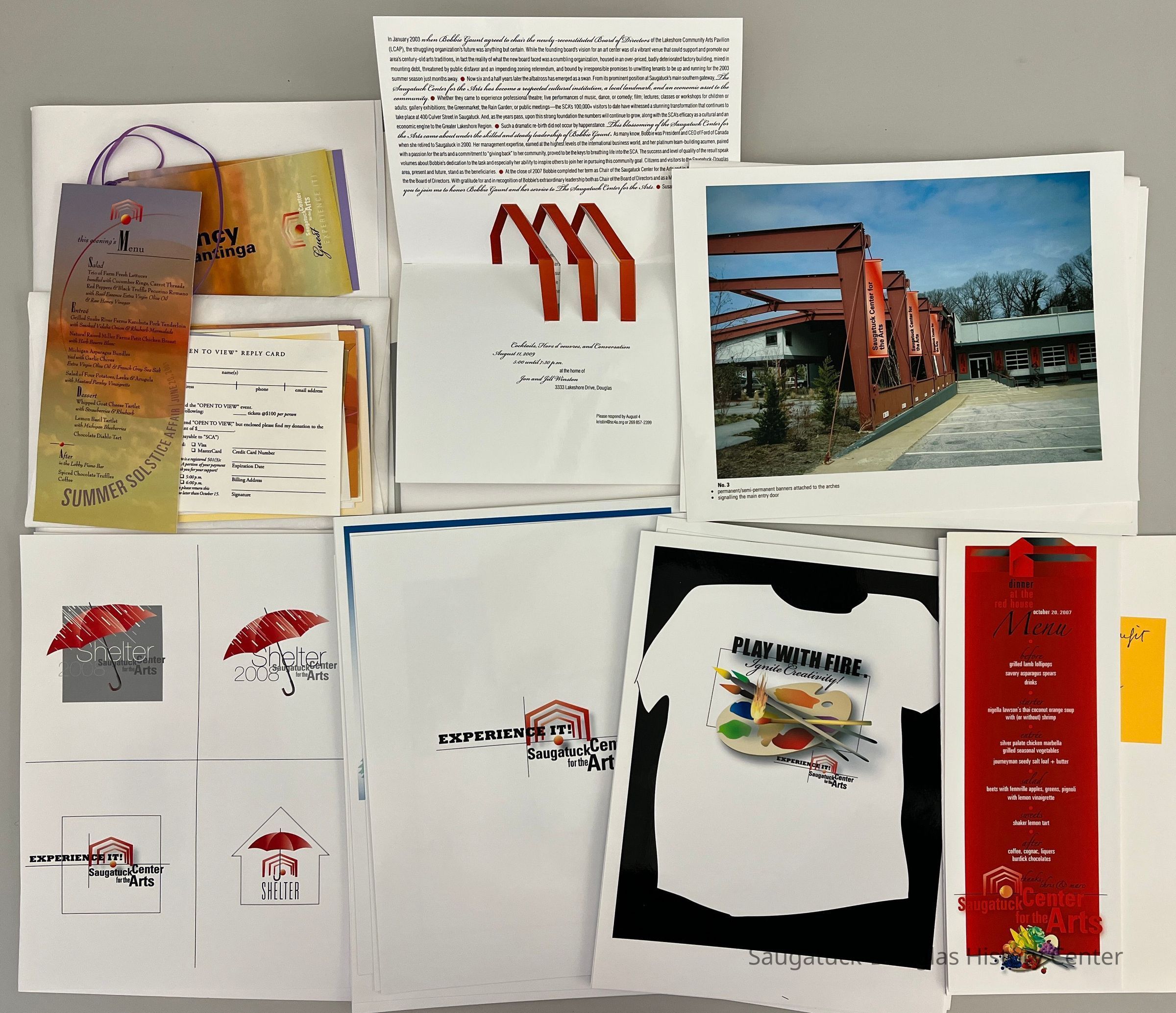 Glossy, photopaper color prints of graphic designs created by Ken Carls for the Saugatuck Center for the Art that includes logos, signage, product design, invitations, name tags, brochures, postcards, fundraising, exhibits and event materials.Context