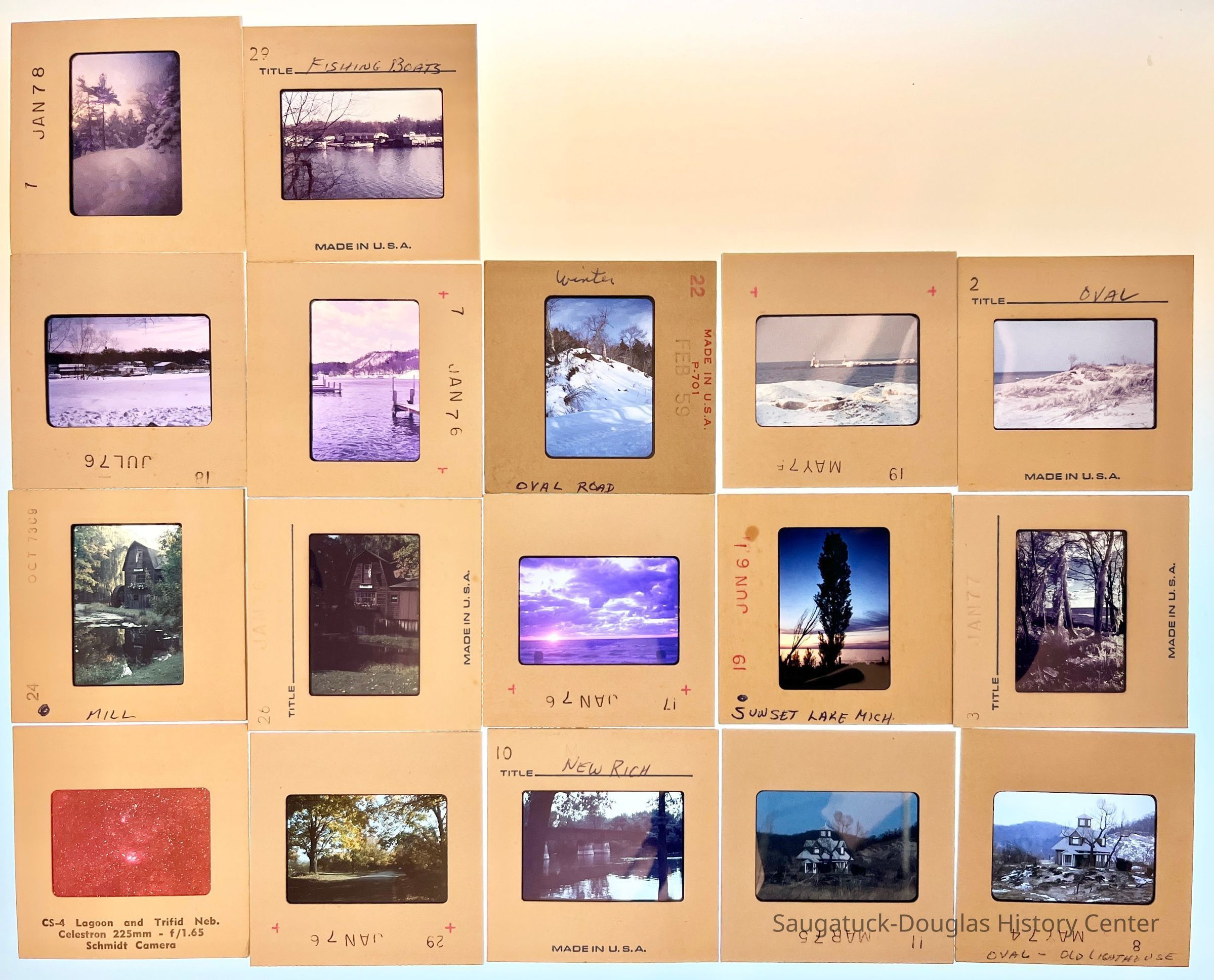 Sixteen color slides of local scenes plus one purchased slide of an astronomical nebula that were donated on 9/9/2004 by Virginia Burton. The timestamps on the slides indicate when the slide was developed, not when the photo was taken.
