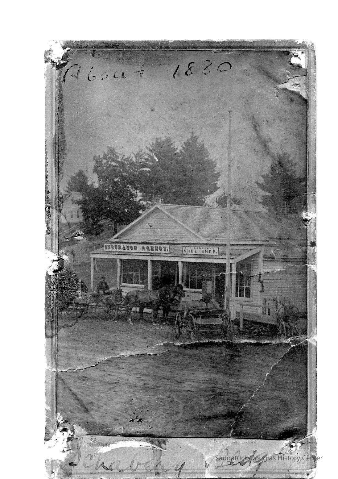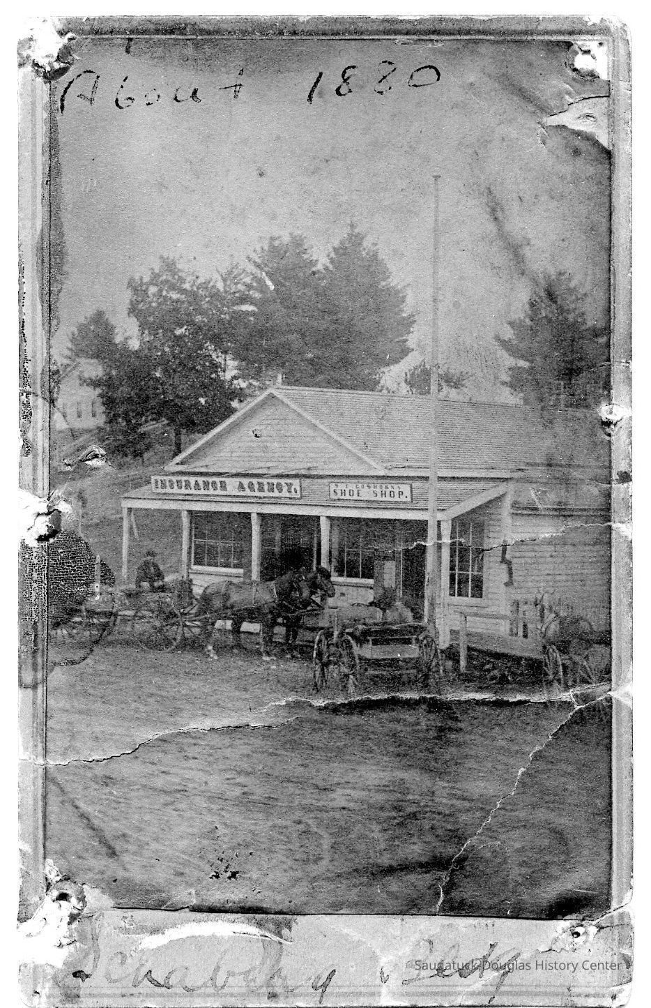 Single-story, clapboard building with flagpole, porch and boardwalk. Horse-drawn wagons parked in front on an unpaved road. Signs on the building read "Insurance Agency" and "C.E. Goshorn's Shoe Shop".Photograph Details