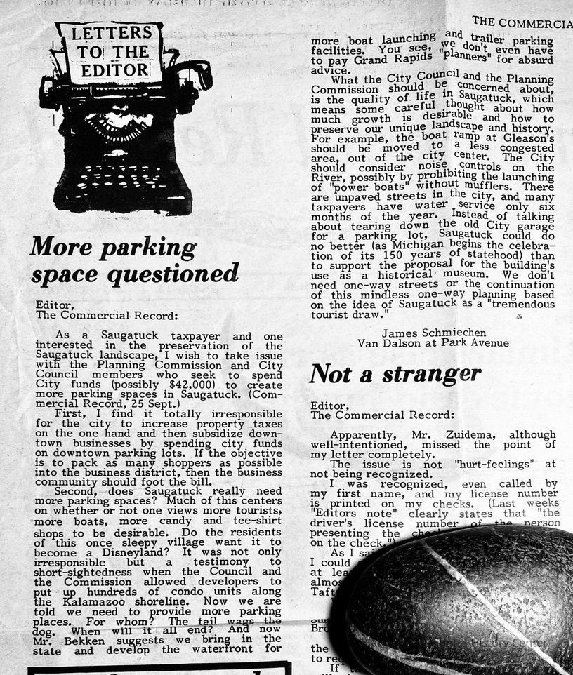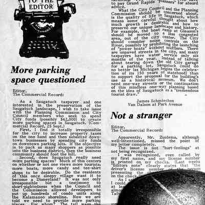 1986 October - "More parking space questioned" by Schmiechen to editor