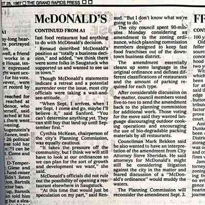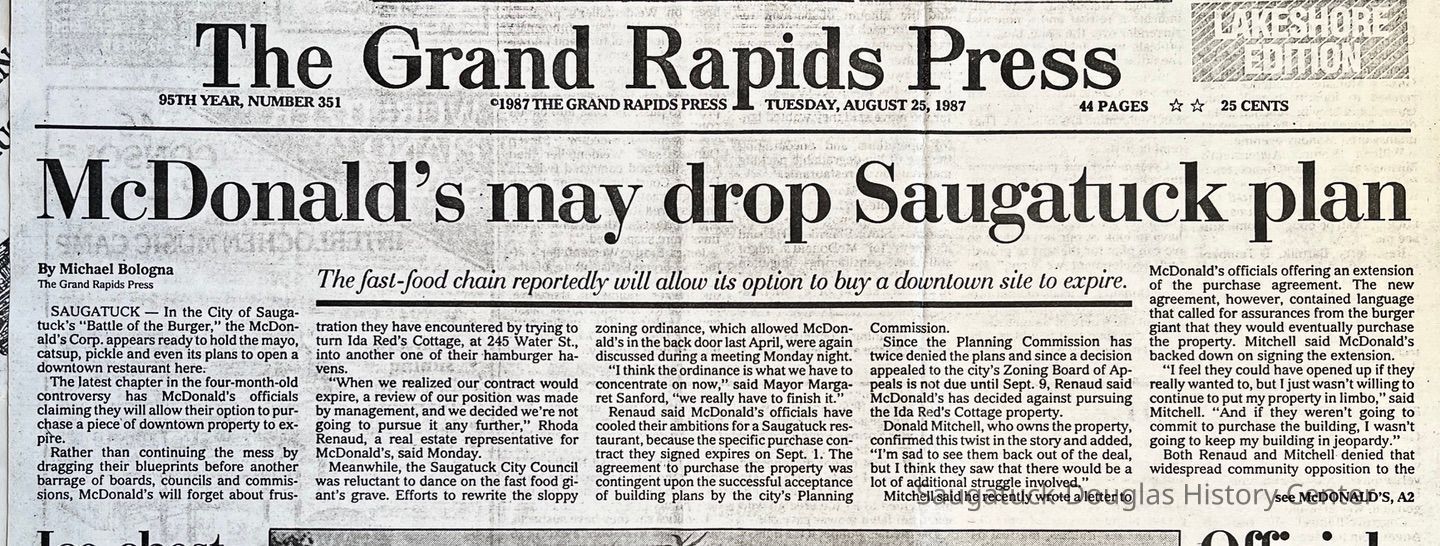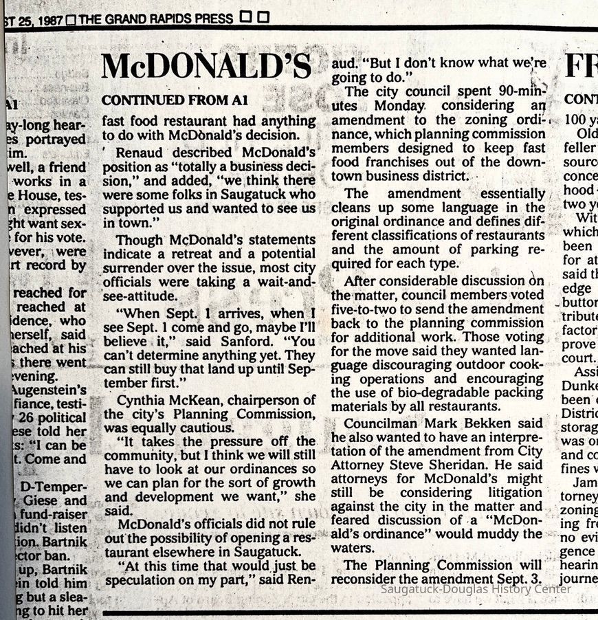"McDonald's may drop Saugatuck plan" Grand Rapids Press, 25 August 1987, photocopies