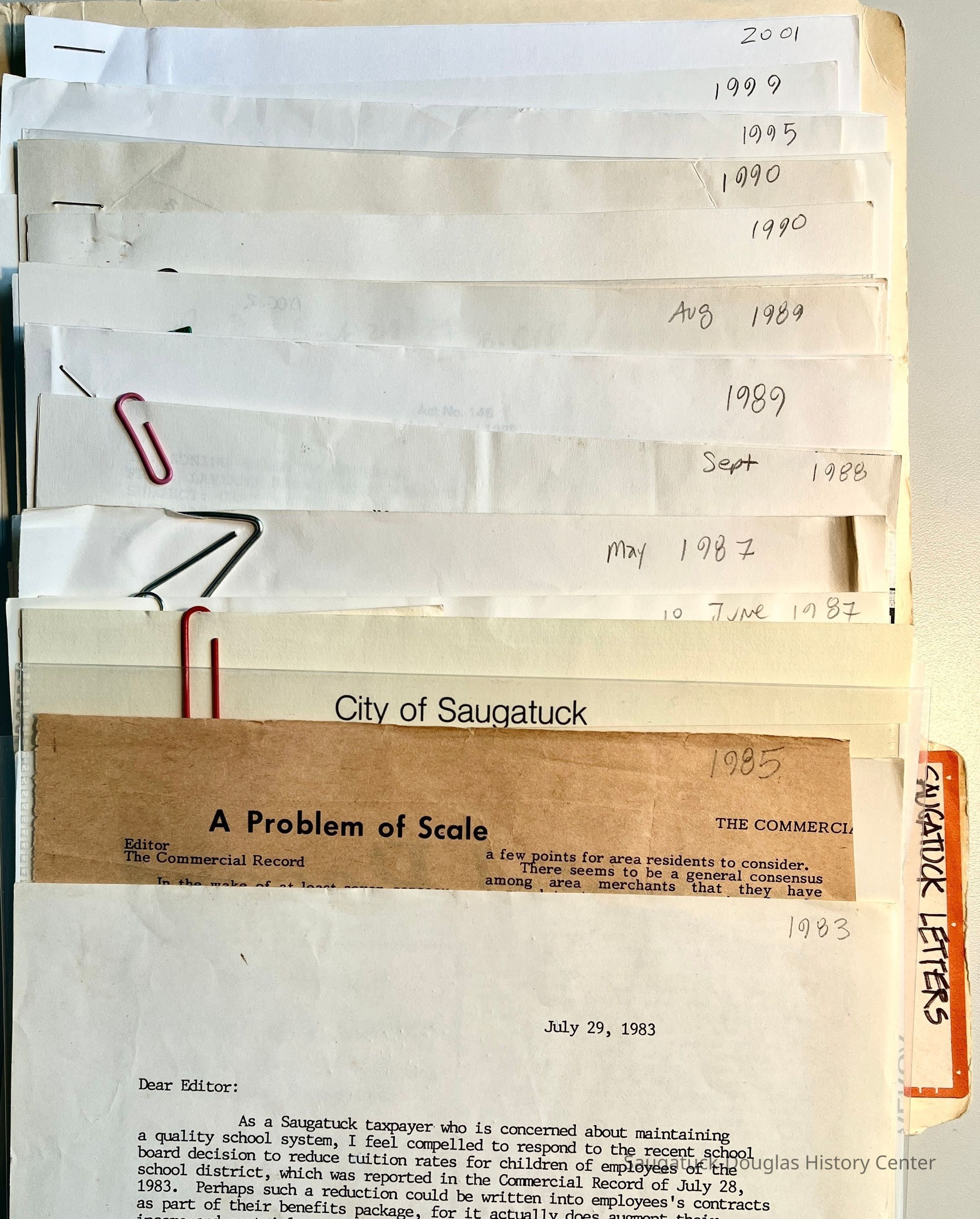 Letters to the editor, local officials written by Dr. James Schmiechen and Ken Carls about local issues from 1983 to 2001. Some letters are drafts, others are newspaper clippings.