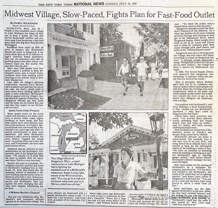 "Midwest Village, Slow-Paced, Fights Plan for Fast-Food Outlet" New York Times, 19 July 1987 by Isabel Wilkerson, photocopy