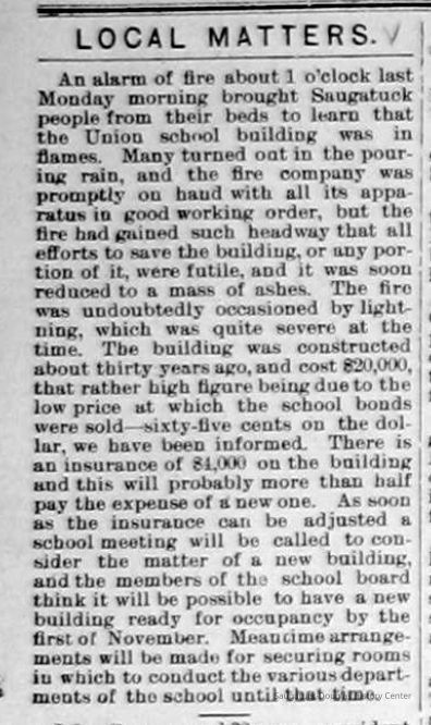 Photo of the wrecked Saugatuck Union School building. It was thought lightening from the storm caused the fire.