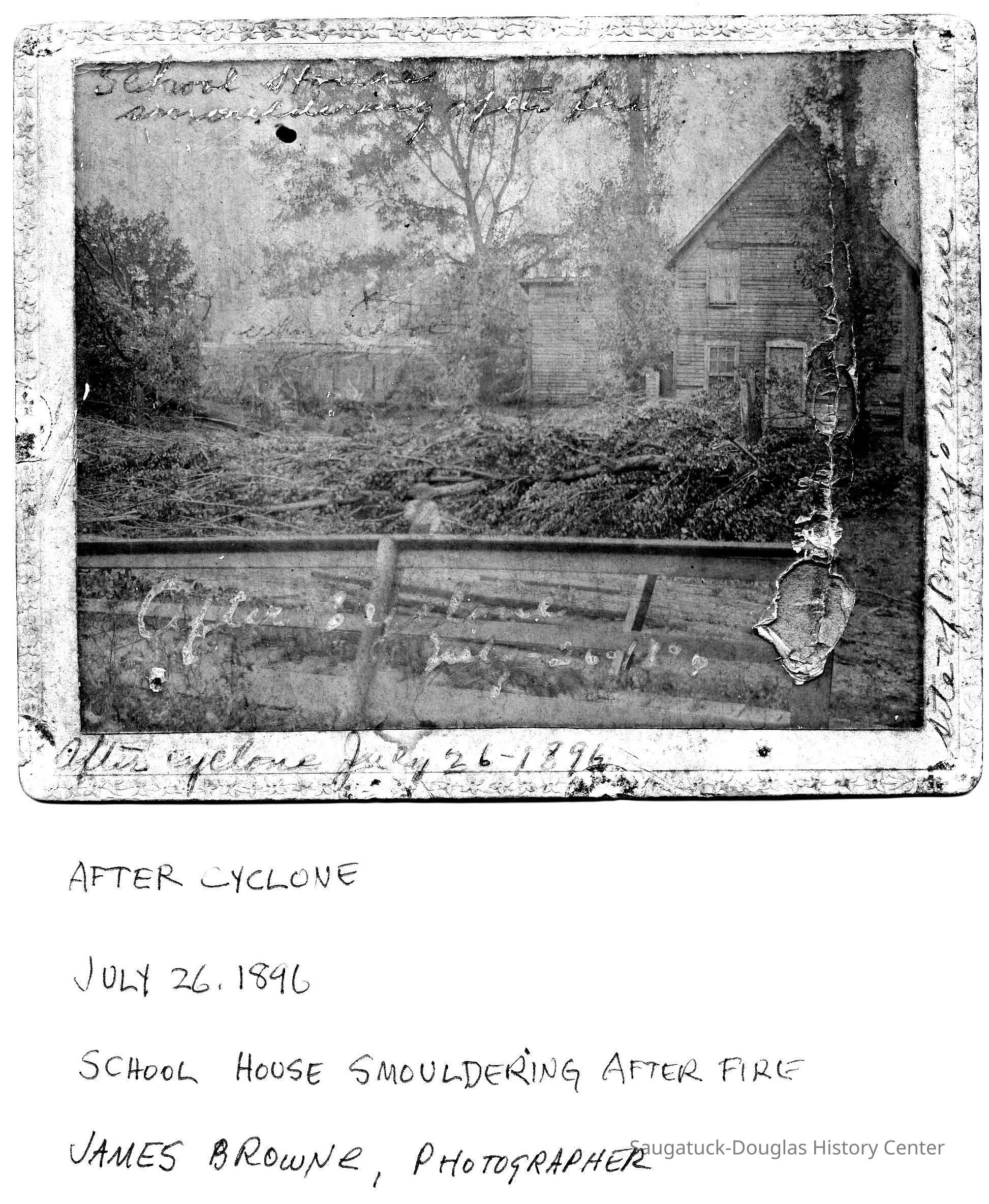 Notations on the photo read "After Cyclone, July 26, 1896. School House Smoldering after Fire, James Browne, Photographer", "Site of Brady's residence", "X where school stood."
