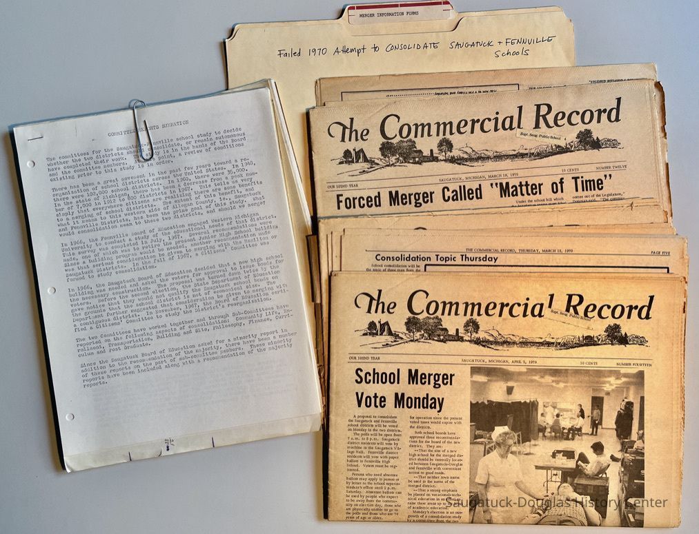 Newspaper clippings and documents about the failed 1970 bid to consolidate Saugatuck and Fennville area schoolsCollection
