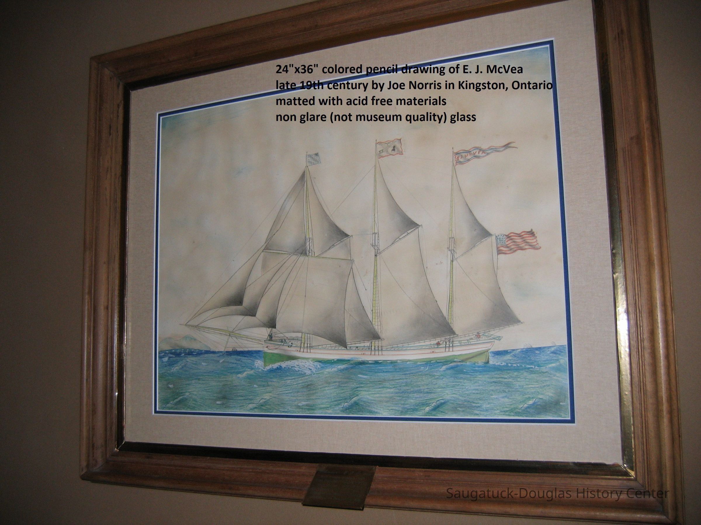 A. Colored pencil rendering of the E.J. McVea, a three-masted schooner, alone on orderly waves. According to the donor, the drawing was done by Joe Norris of Kingston Ontario in the late 19th century.