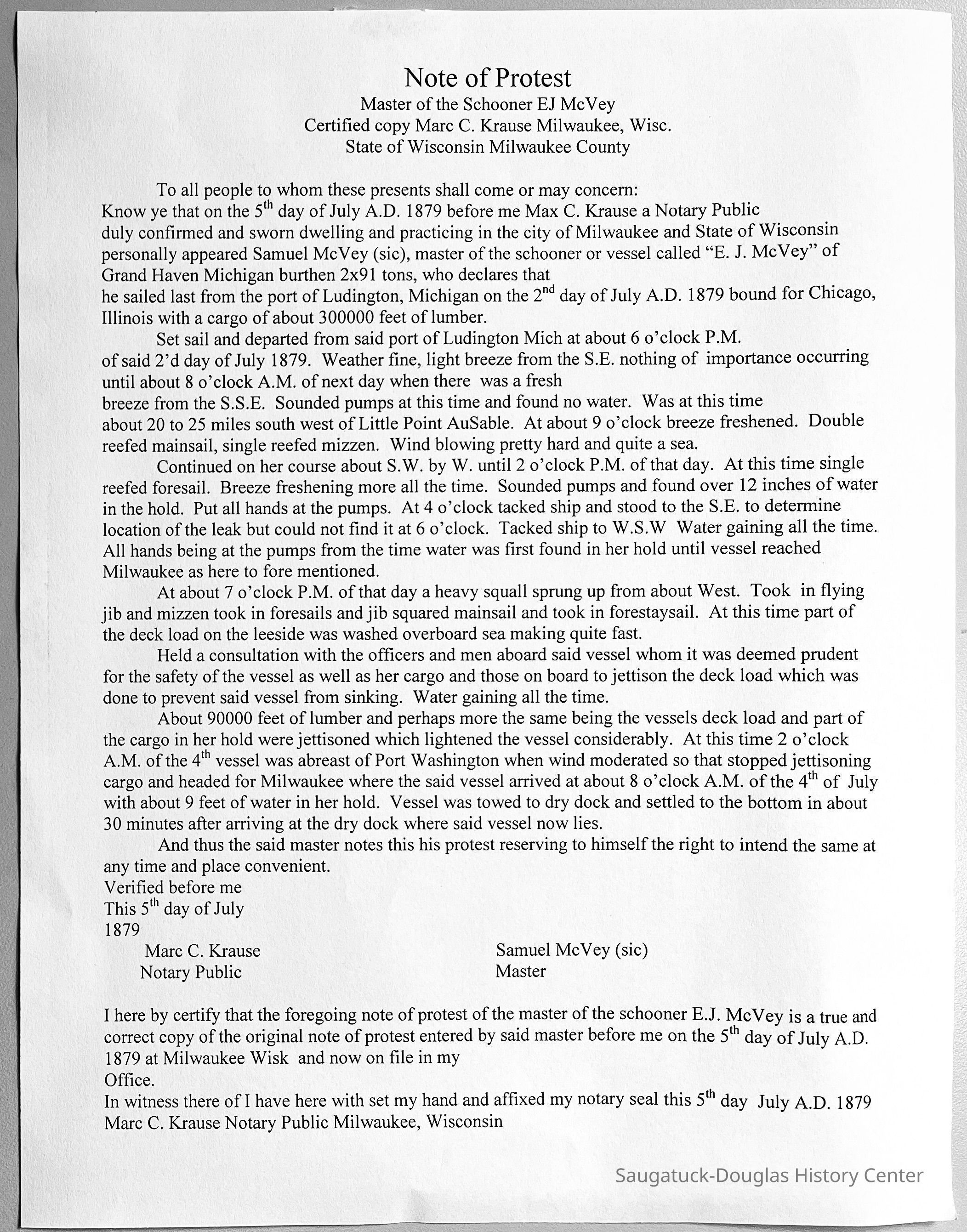 B. Photocopy of transcript of 1879 "Note of Protest" describing the E.J. McVea's journey from Ludington, Michigan to Chicago that due to a leak in the hull, required the dumping overboard of 90000 feet of lumber to keep the vessel from sinking. Original document is at 2022.80.06