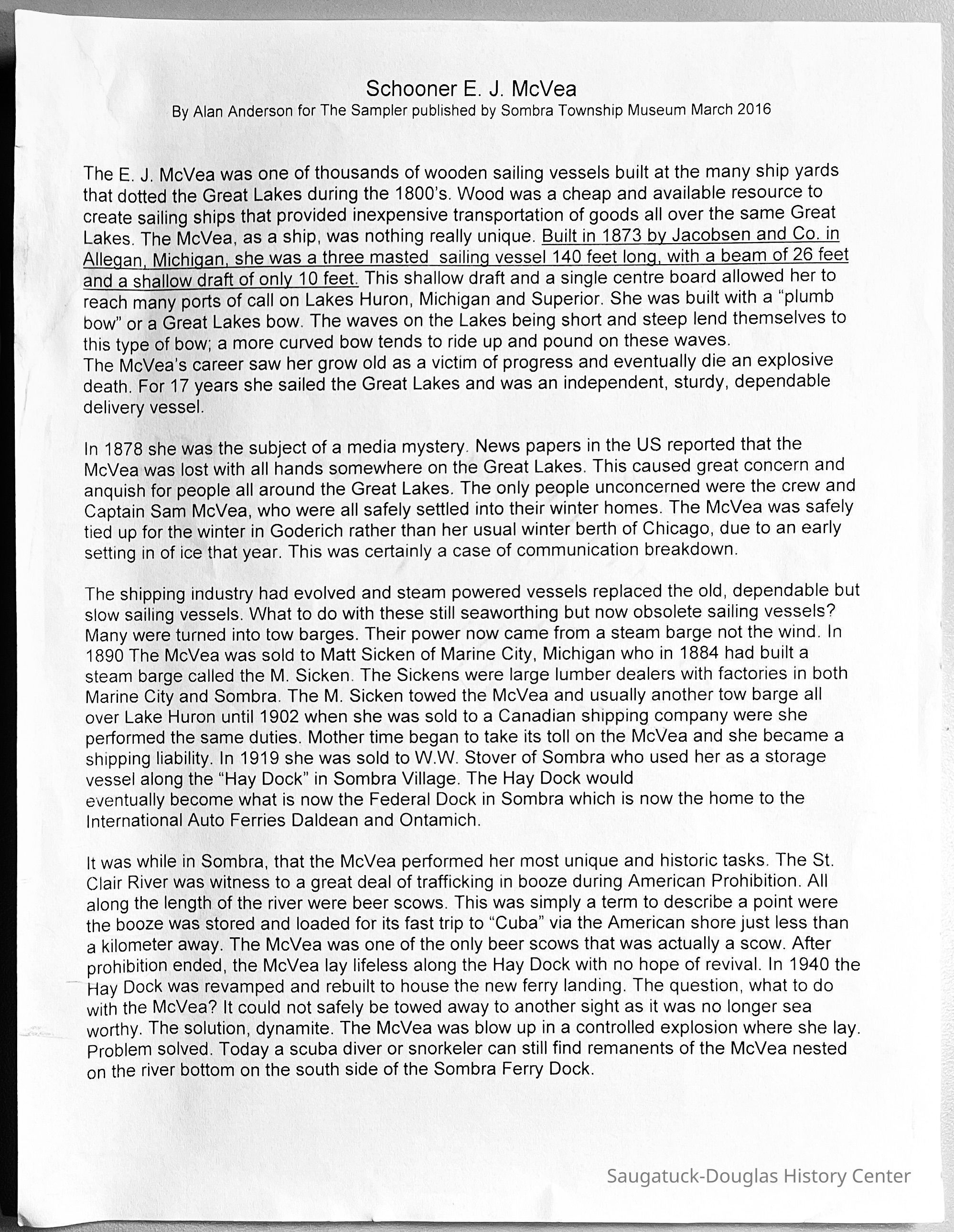 C. Photocopy of "Schooner E.J. McVea" By Alan Anderson for The Sampler published by Sombra Township Museum, March 2016