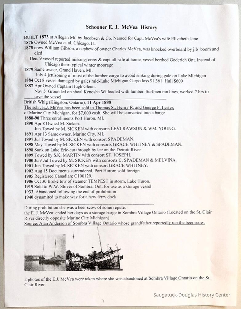D. Photocopy of "Schooner E. J. McVea History" Built 1873 at Allegan, MI by Jacobsen & Co. Named for Capt. McVea's wife Elizabeth Jane