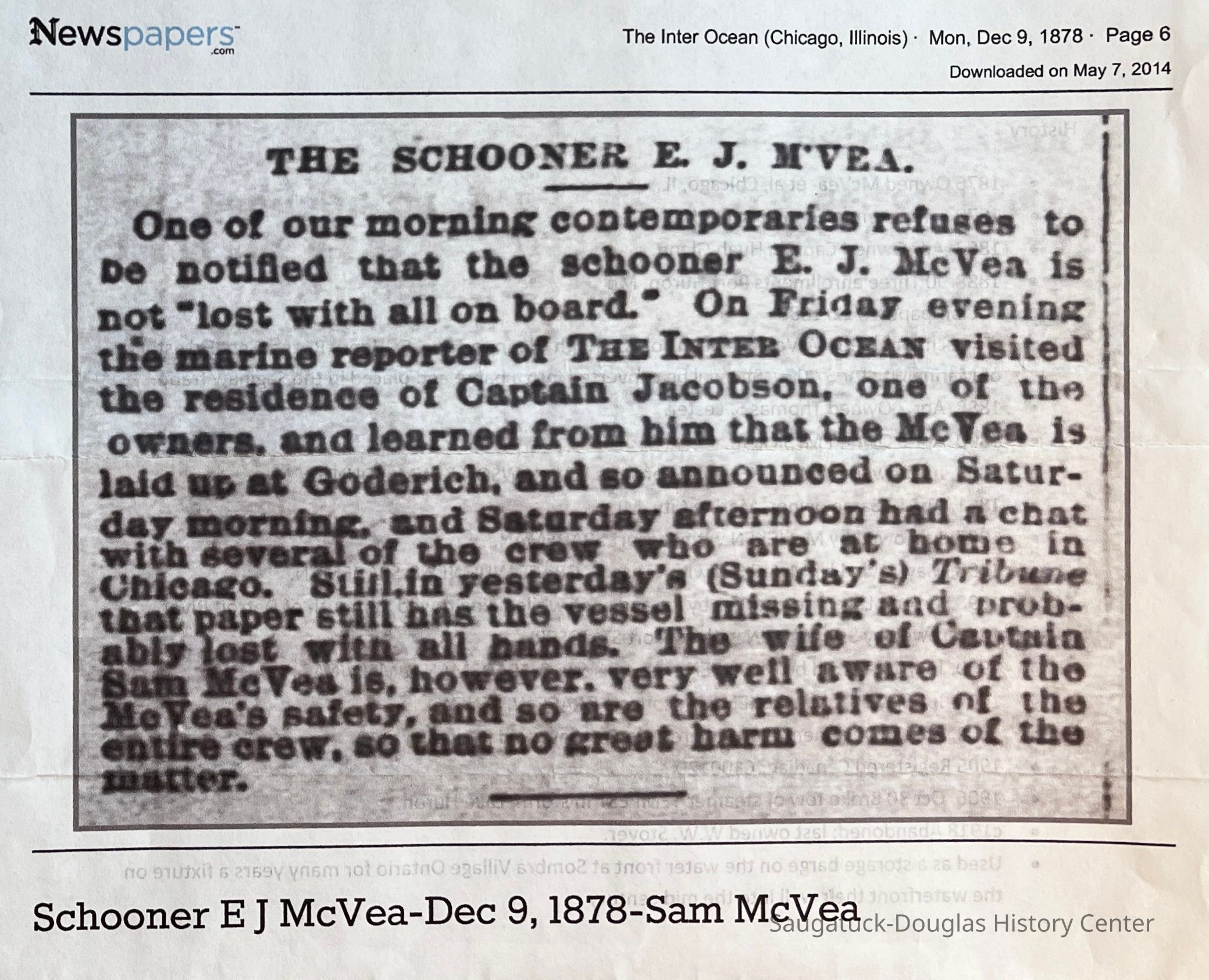 E. Photocopy of Newspapers.com article "Schooner E J McVea-Dec 9, 1878-Sam McVea"Type of Drawing