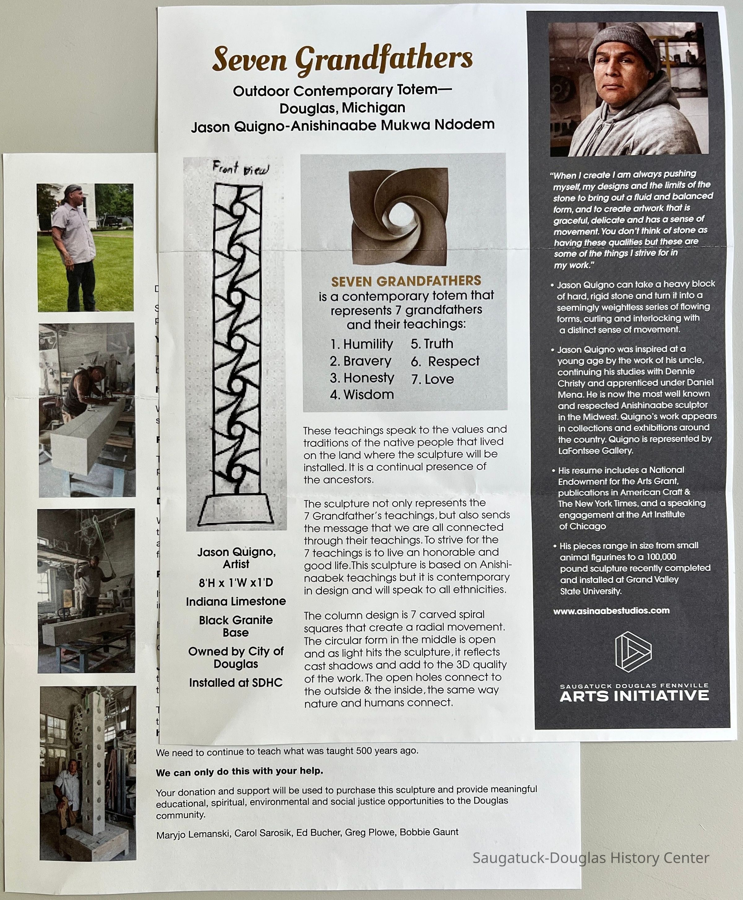 Two page letter about the Saugatuck Douglas Fennville Arts Initiative and asking donors to fund the acquisition of a limestone sculpture by Jason Quigno. The letter includes information about the meaning of the sculpture and the artist.Context