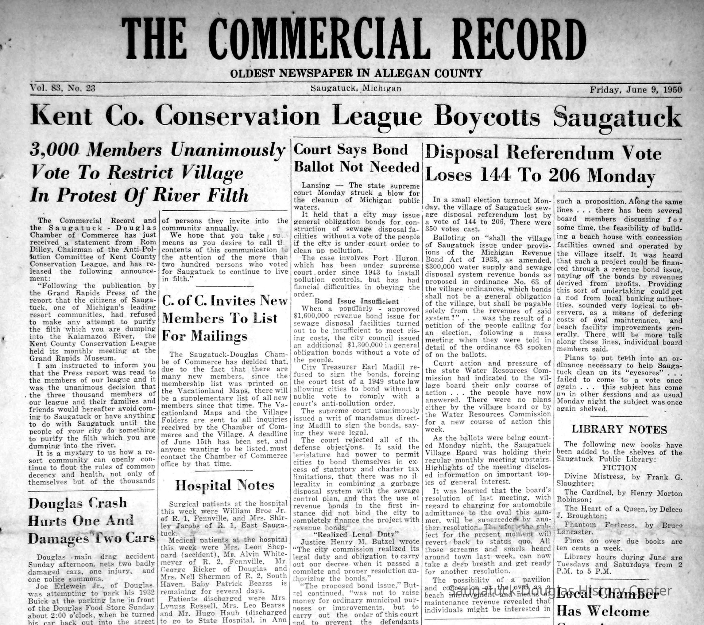 This 194-50 plan was never executed. A November 1, 1957 Commercial Record newspaper clipping (below) includes a plea by Saugatuck Village President Richard Hoffman for the community to fund a sewage disposal project and states "A few years back the village voted on the proposition of putting in a system for that part of town east of the river. This was turned down."