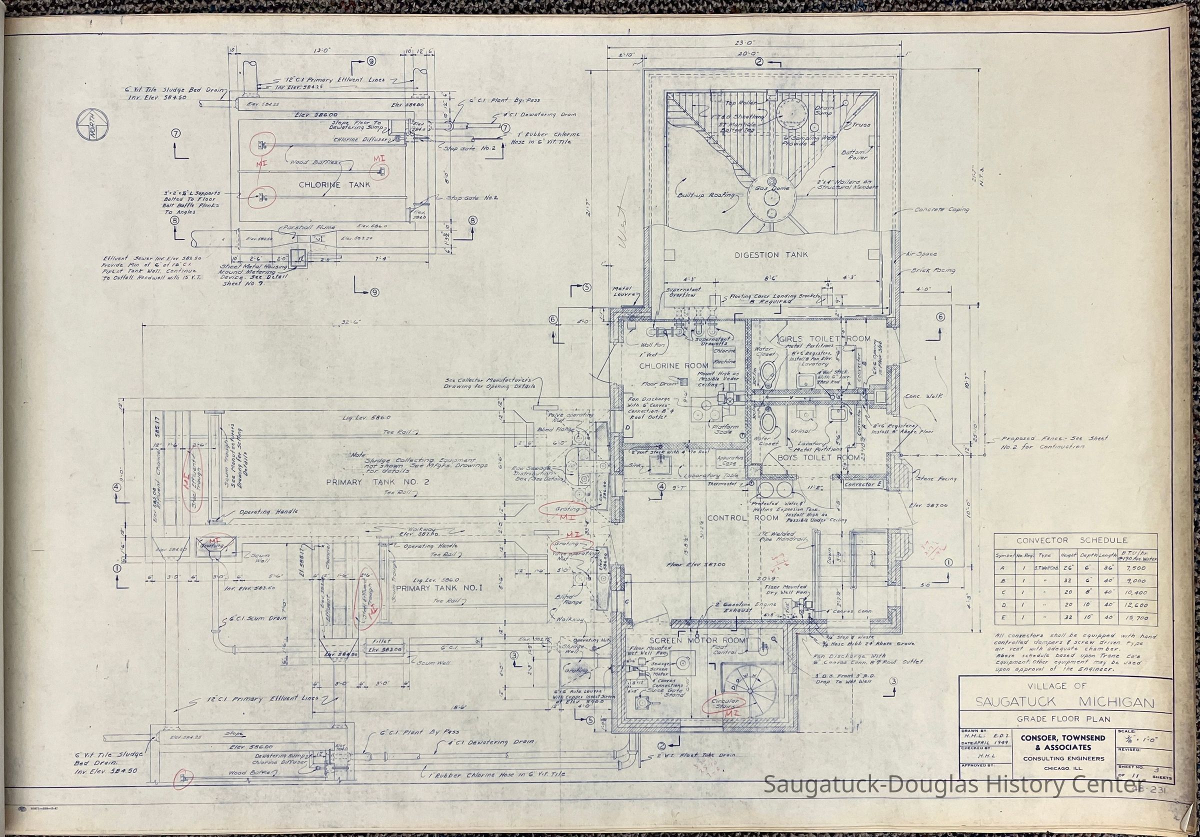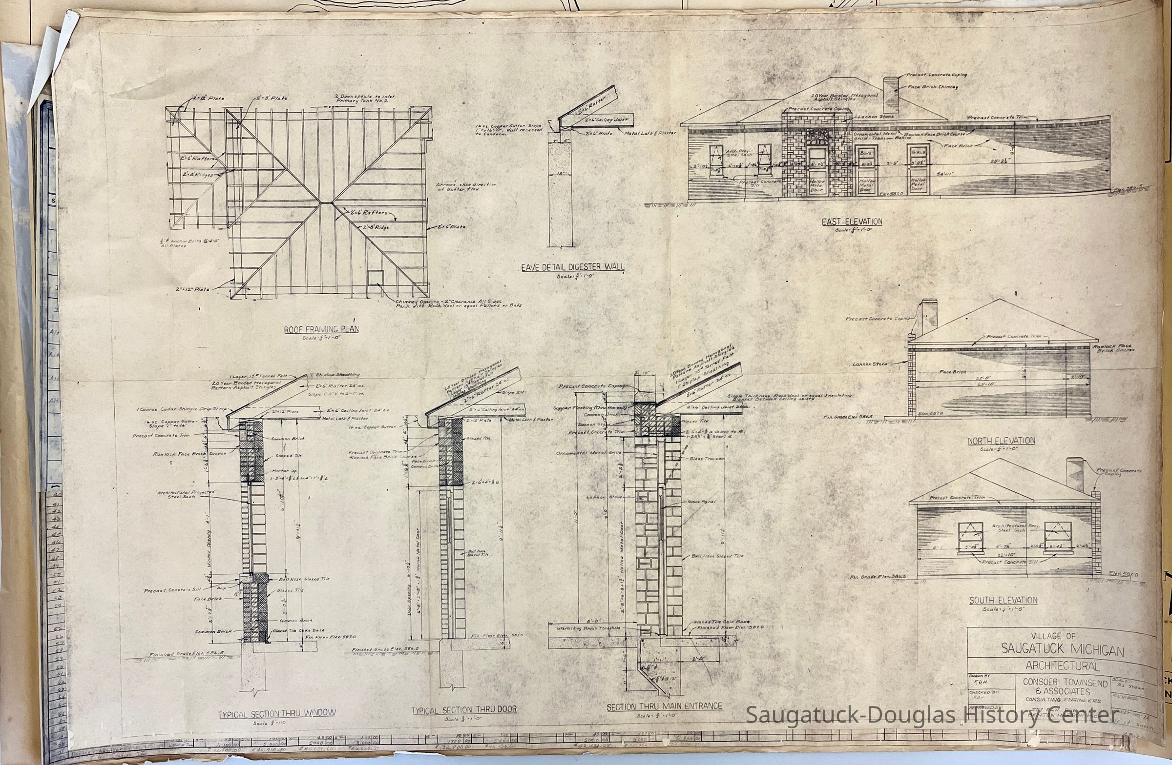 Architectural drawing for a one-story, concrete Village of Saugatuck building prepared by Consoer Townsend & Associates of Benton Harbor, Michigan.