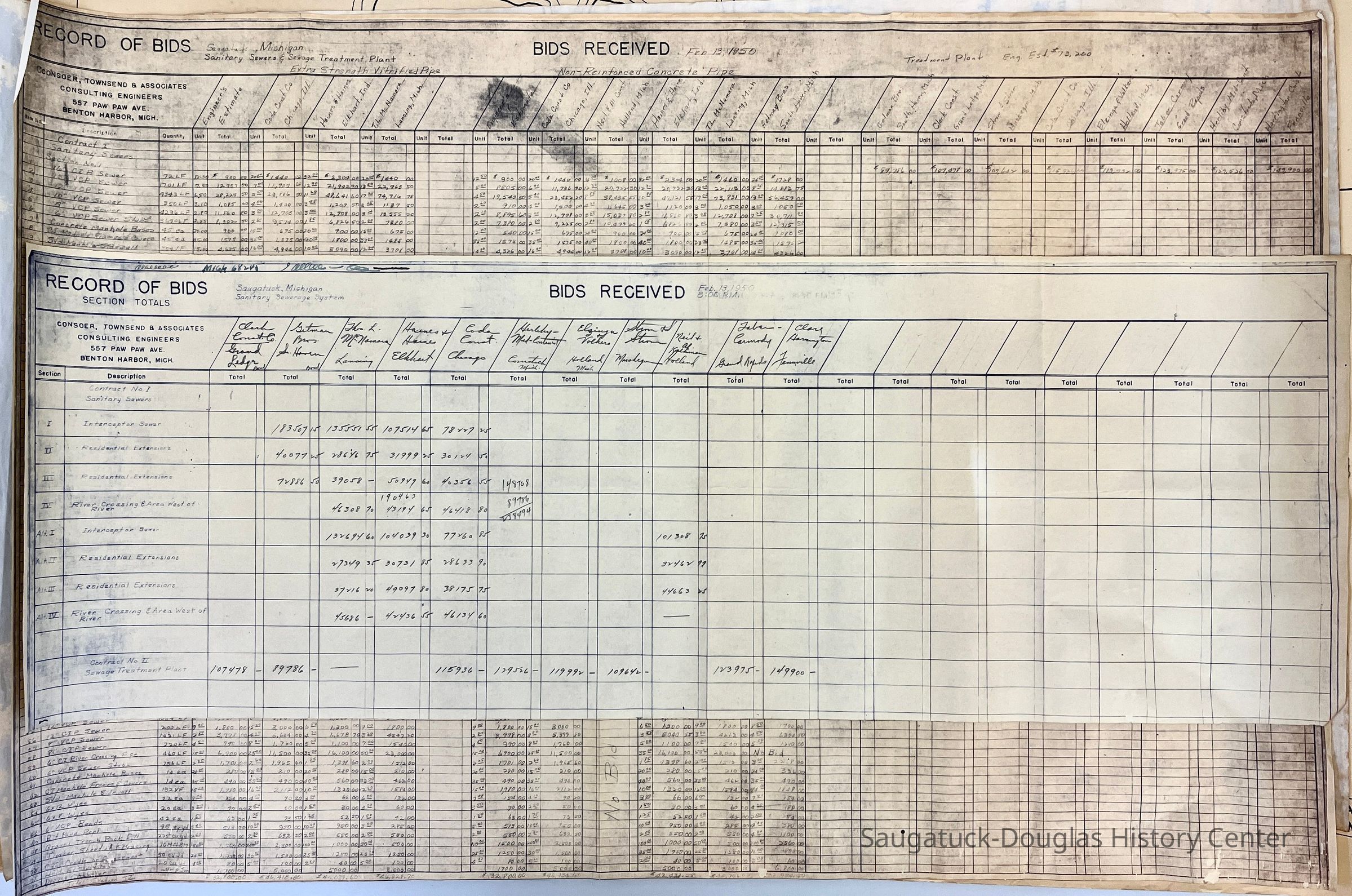 Two Record of Bid sheets for a Sanitary Sewerage System and Sanitary Sewers & Sewage Treatment Plant, Feb. 13, 1950 that lists the bidding contractors and their quotes.