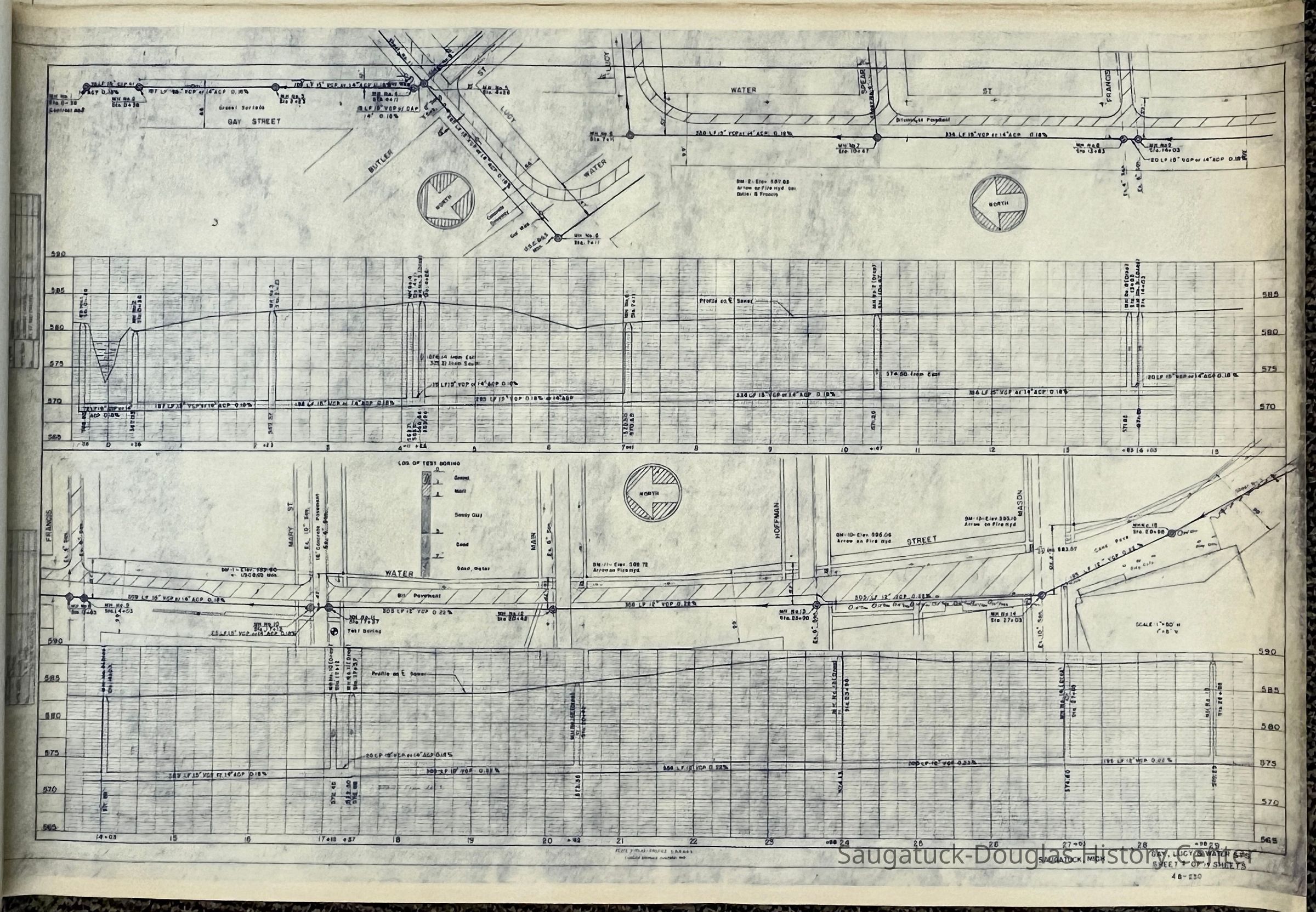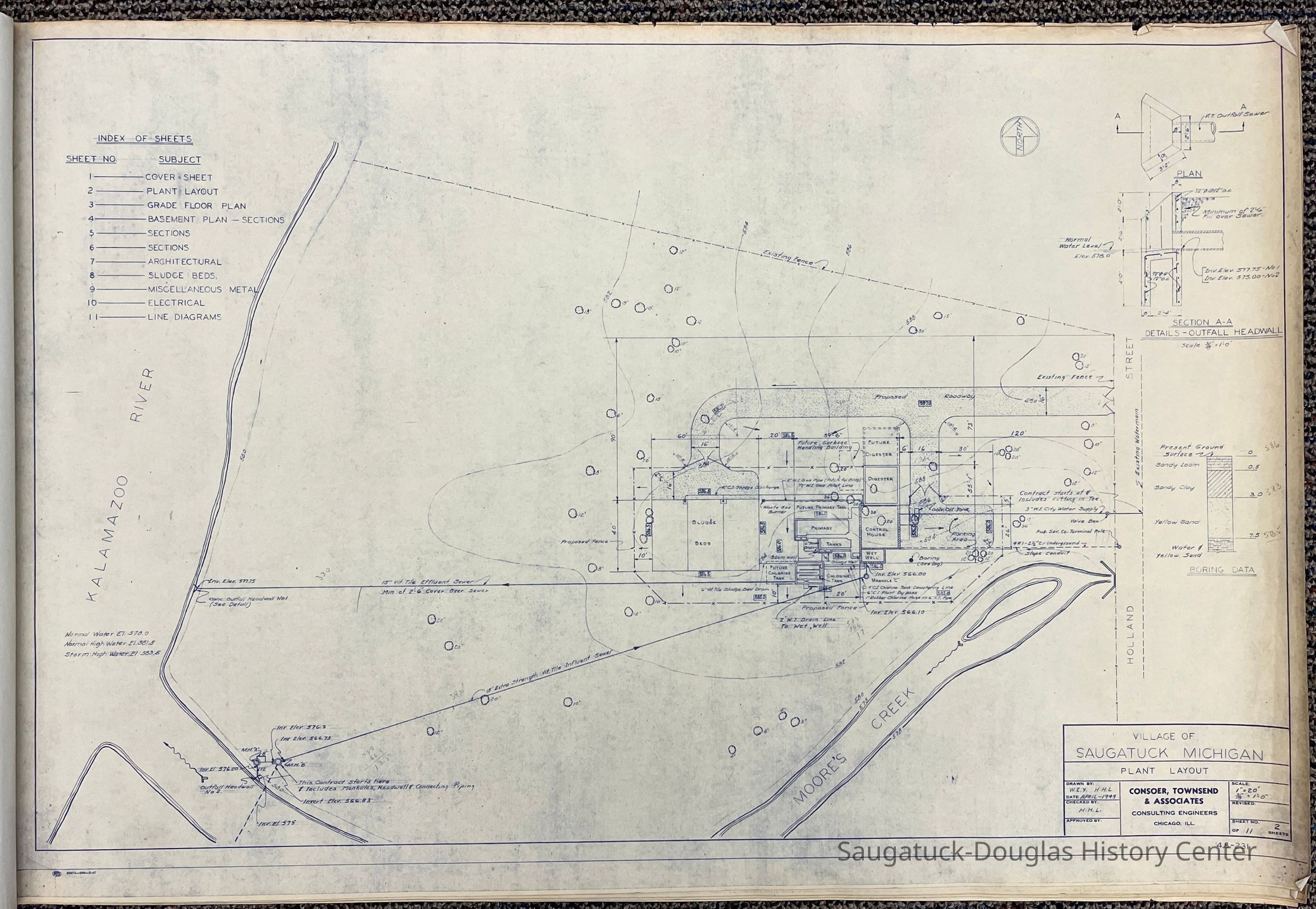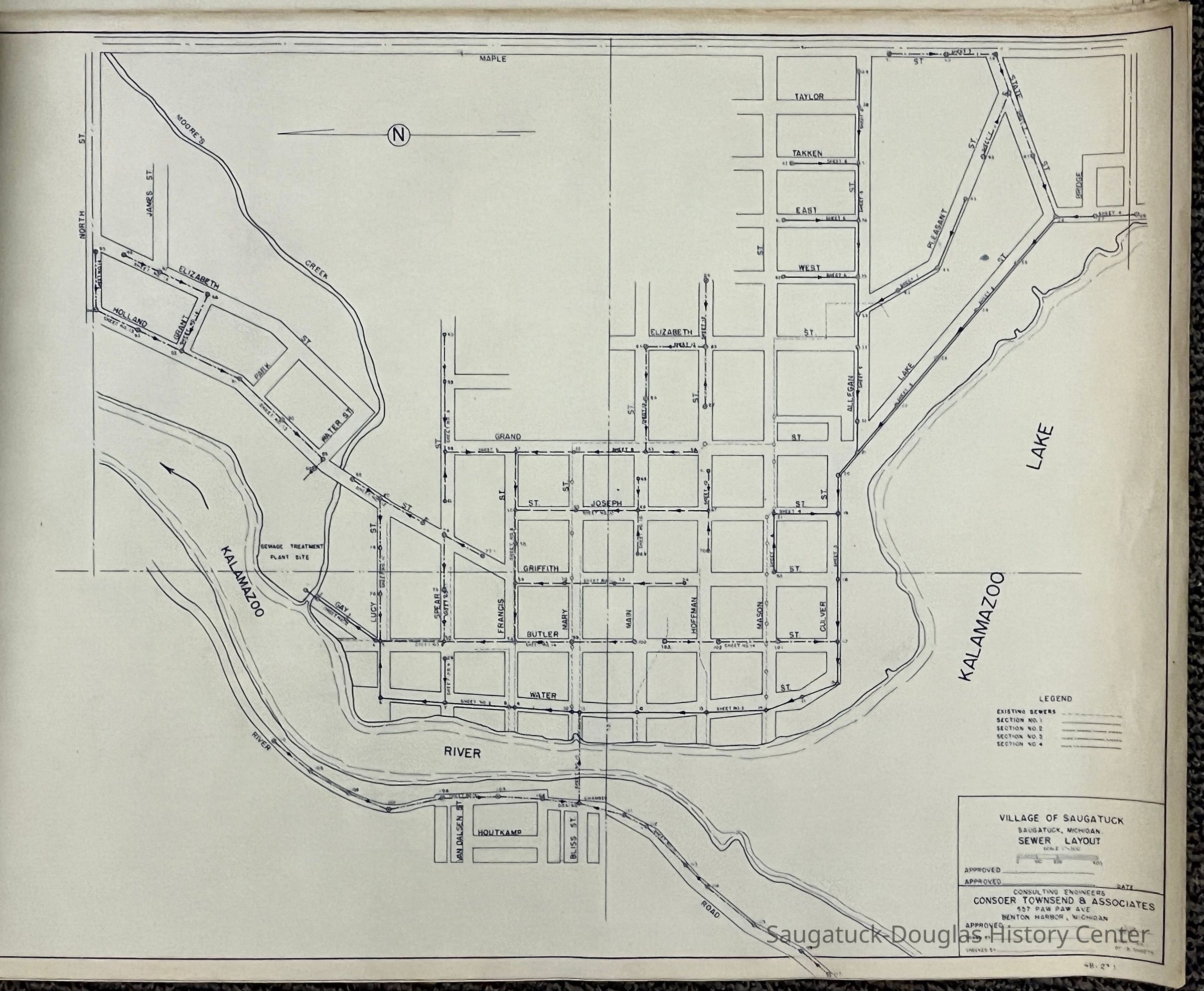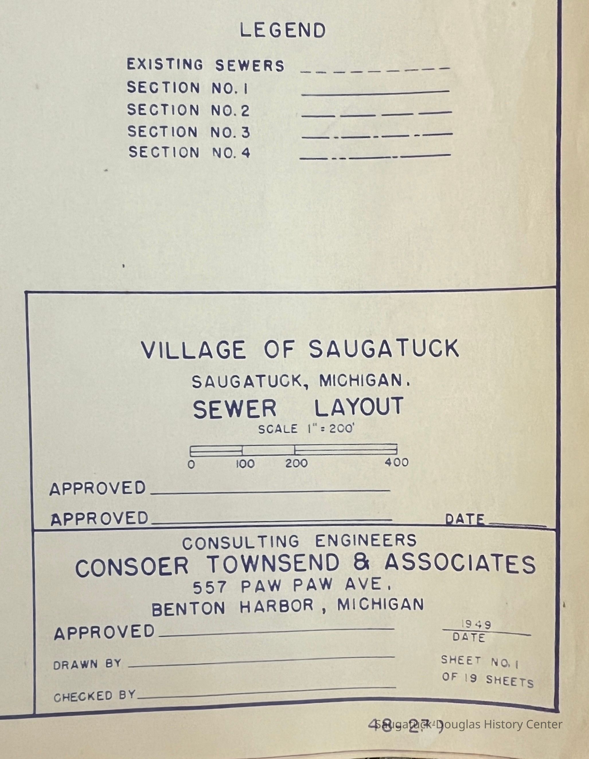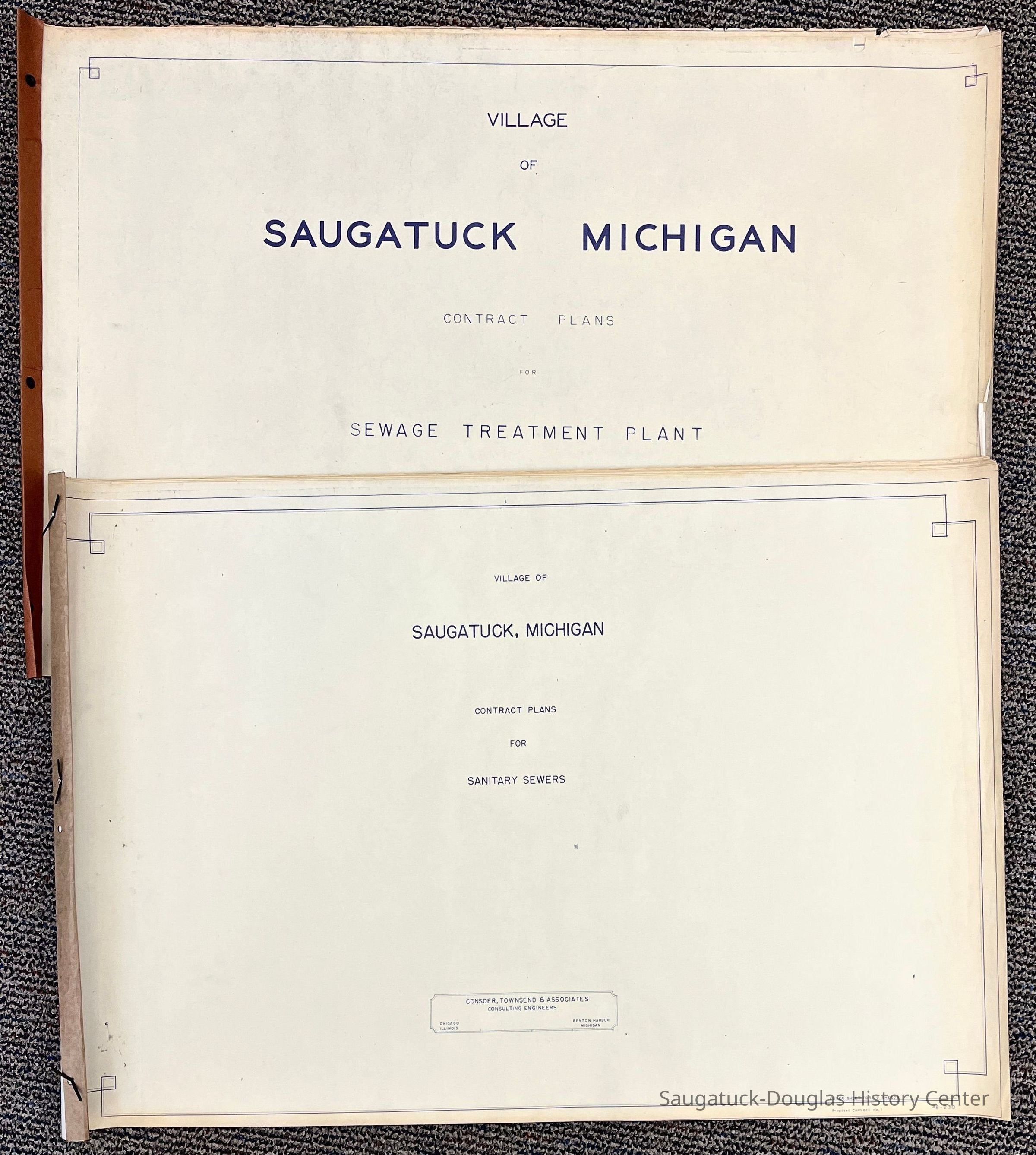 Two, bound booklets of engineering plans for the Village of Saugatuck's sewer system created by Consoer Townsend & Associates of 557 Paw Paw Ave., Benton Harbor, Michigan. The plans are dated 1949.