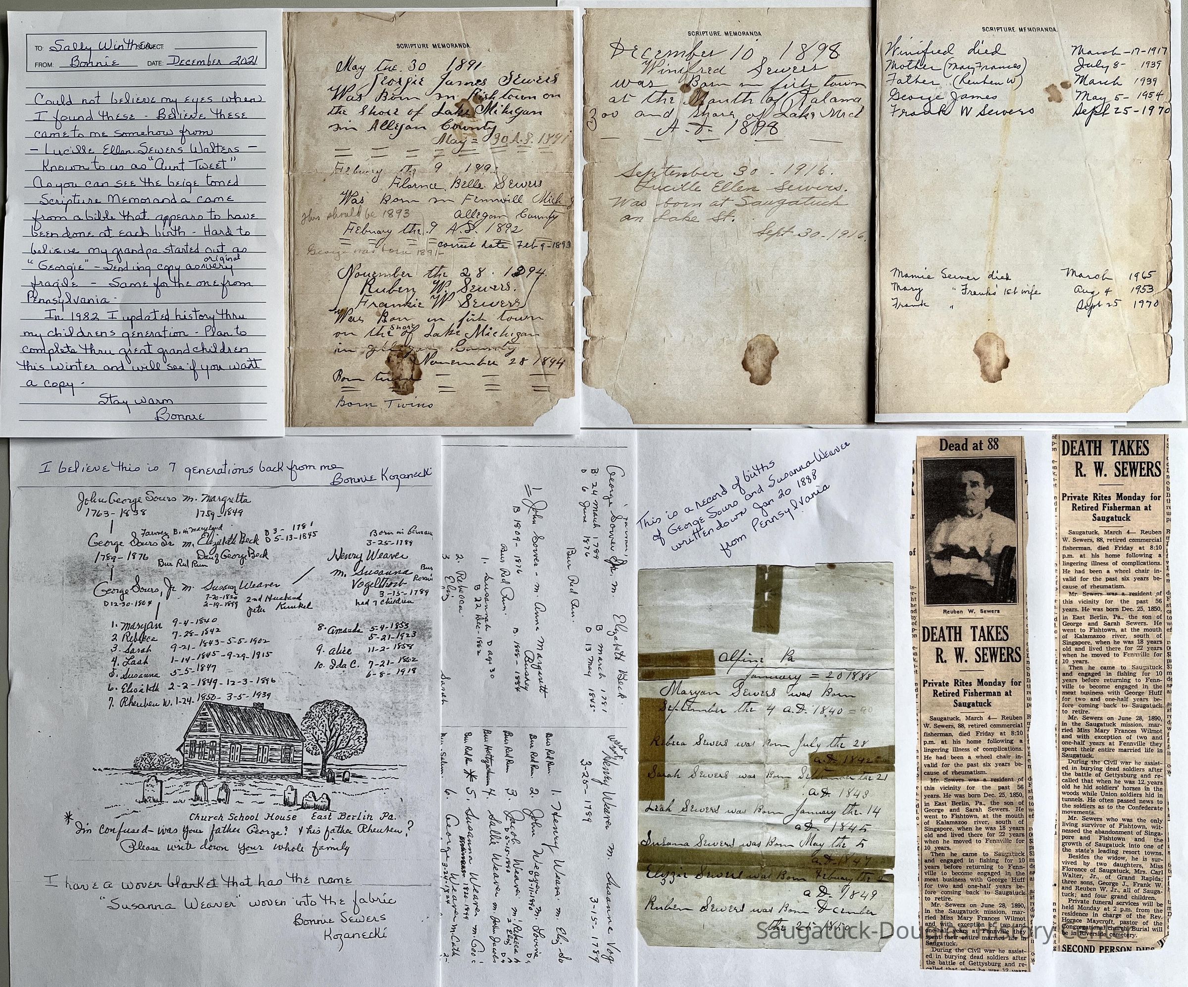 Collection of copies of pages from family bible, lists and newspaper clippings pertaining to Saugatuck's Sewers familyCataloged By