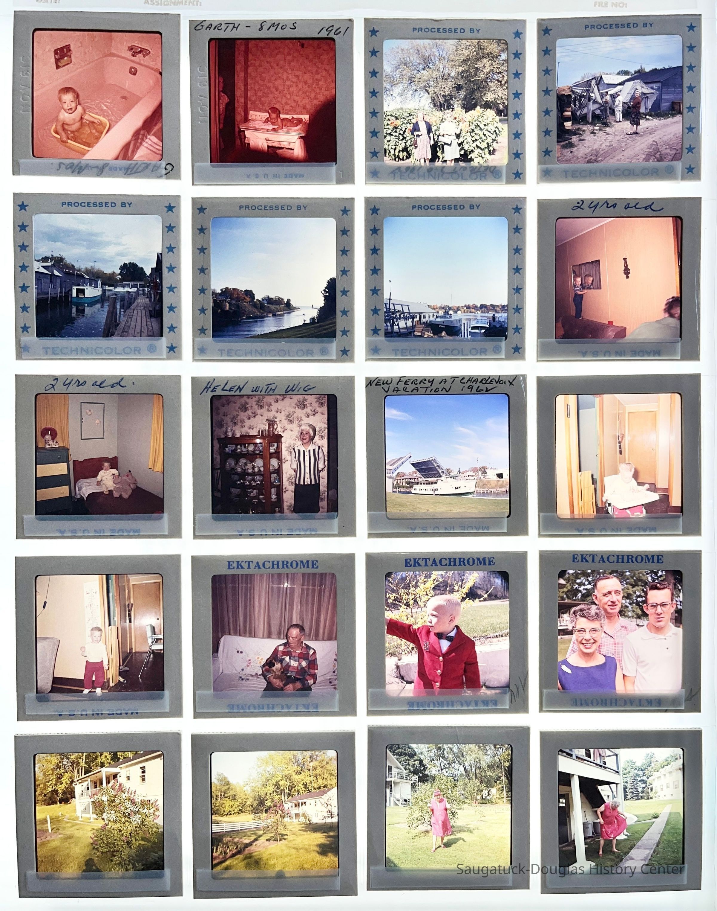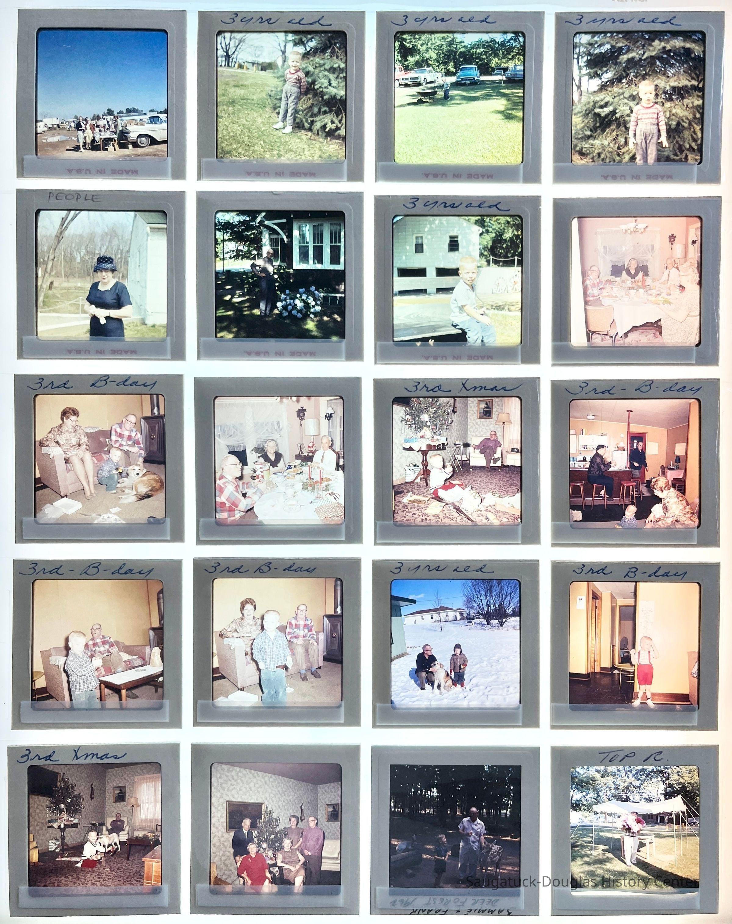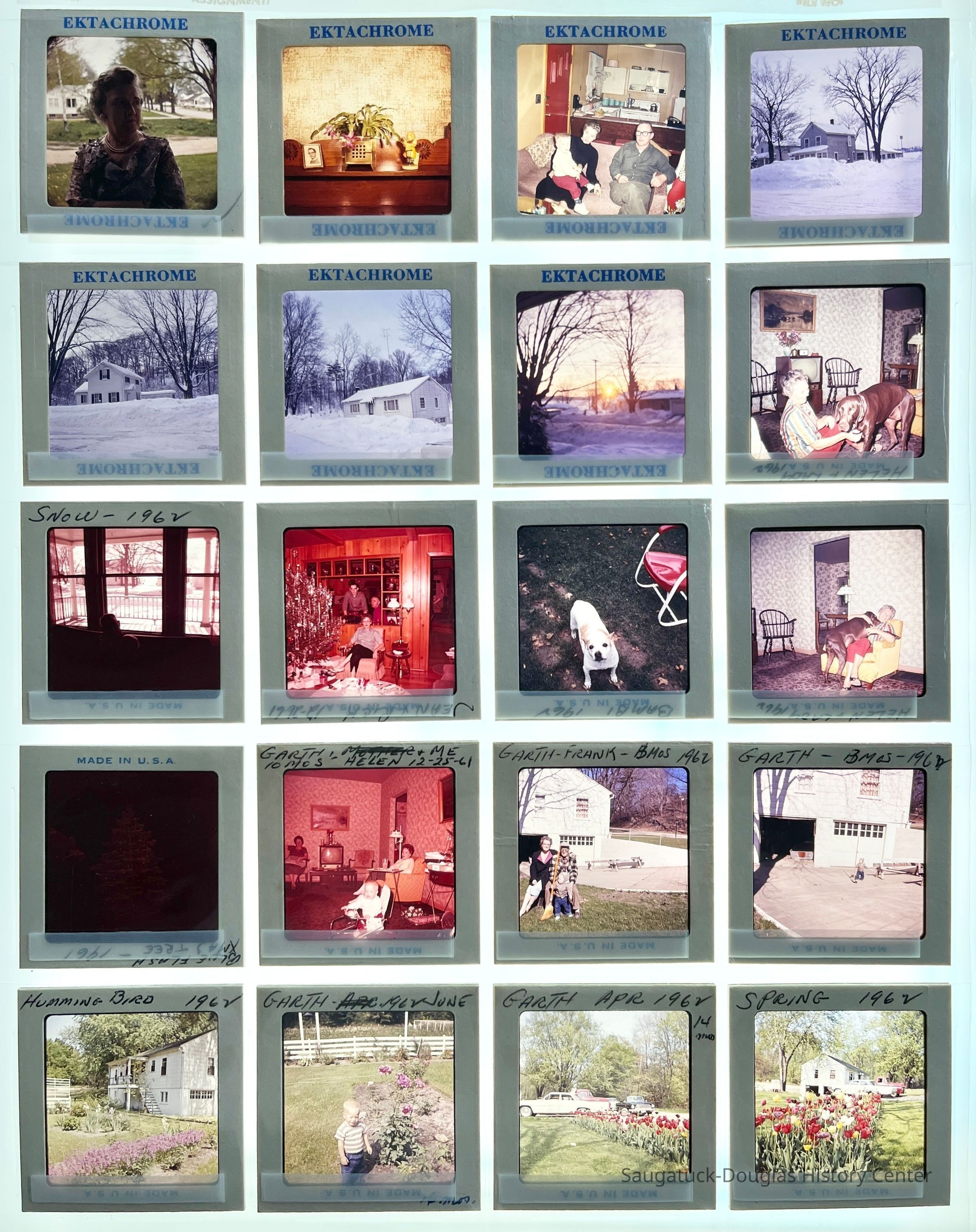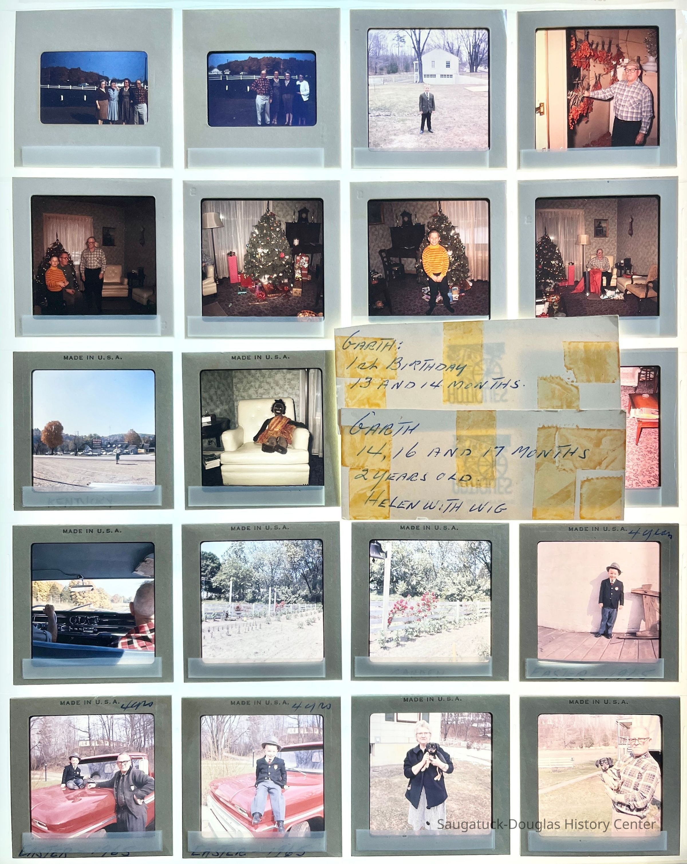 Five sheets of Sewers family slides from the early 1960s. Many shots of Garth Sewers growing from an infant in 1961 to a 3-year-old boy, birthday parties, Christmases, vacations, pets, gardens, flowers, winters snows, and the Sewers' house on Lake Street.Photograph Details