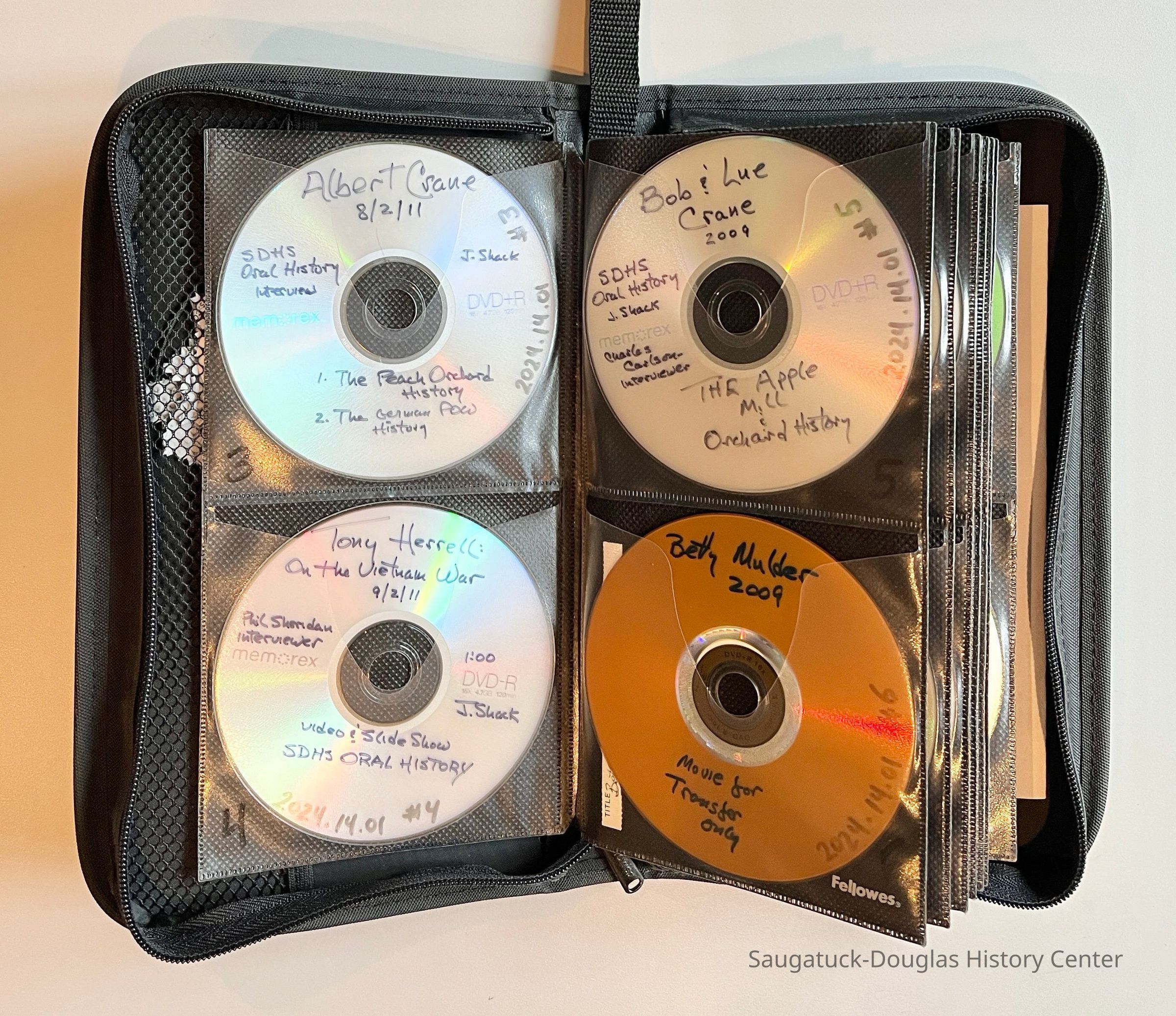 Two, black zippered Fellows-brand DVD/CD cases loaded with DVDs in protective page sleeves. The DVDs contain video, audio or photographic content created by John Shack's, mostly oral history interviews. Many of the DVDs are backup duplicates.