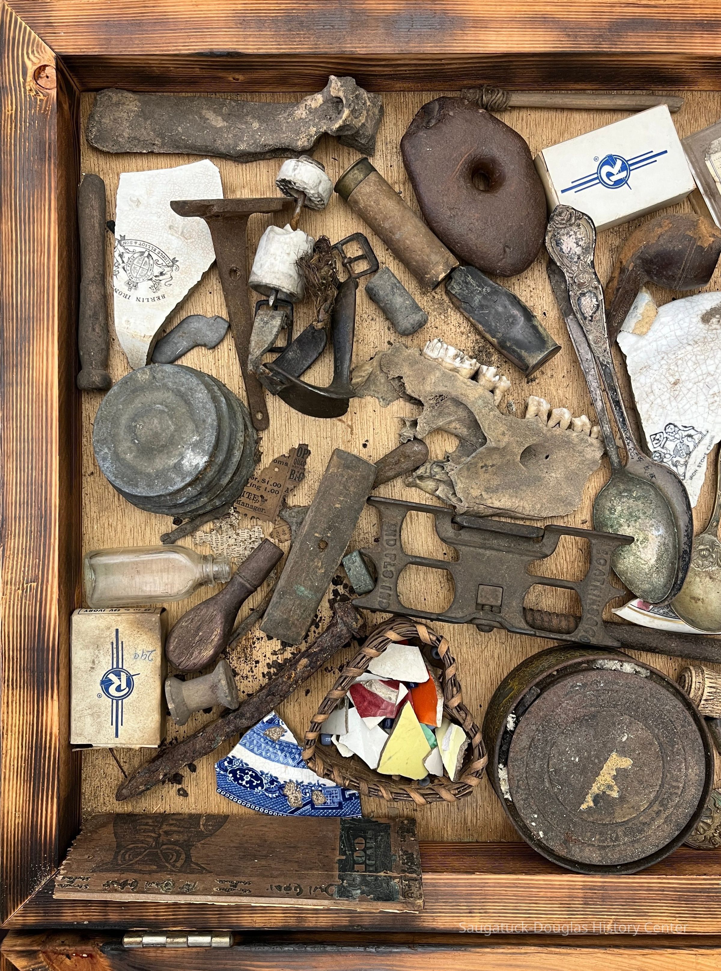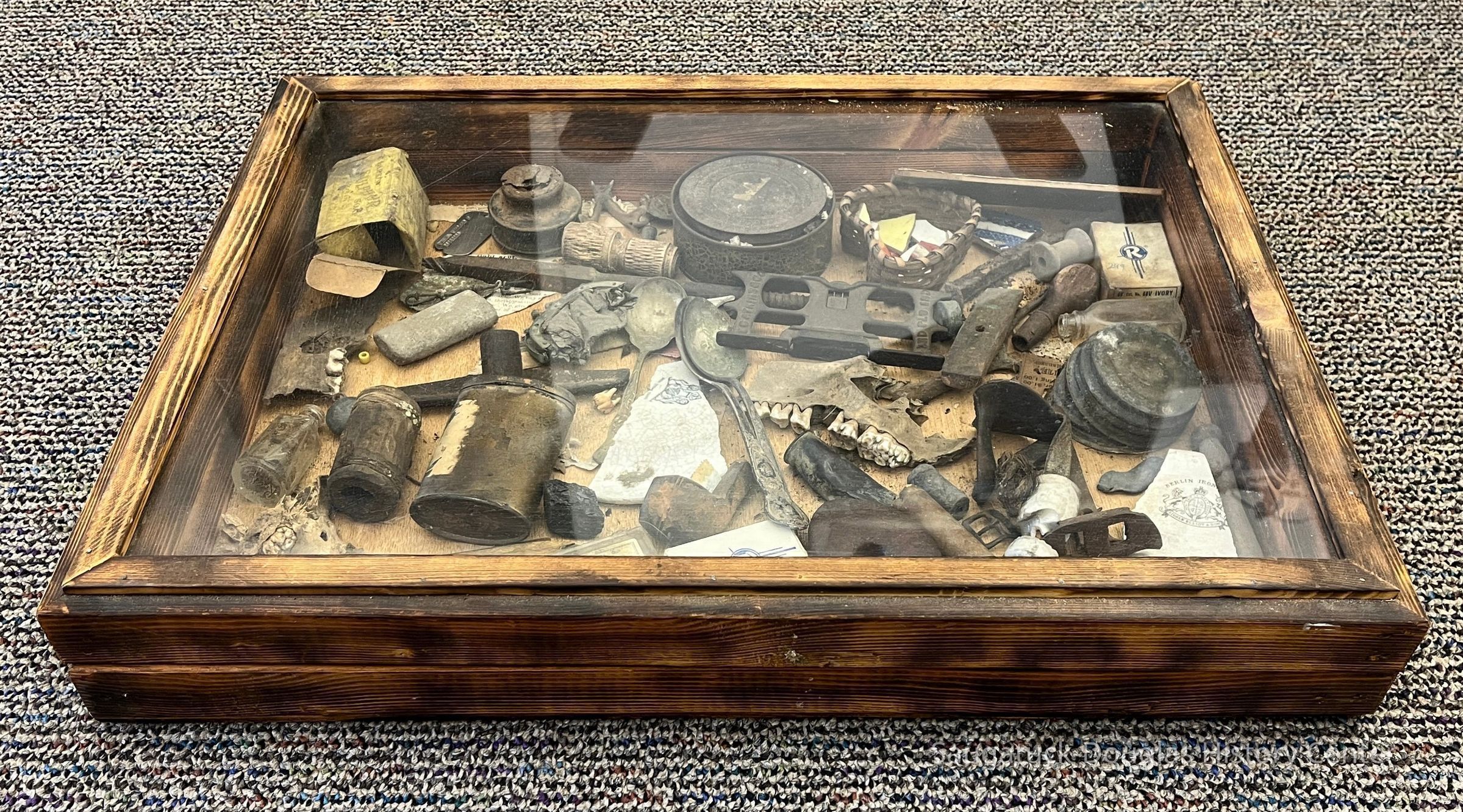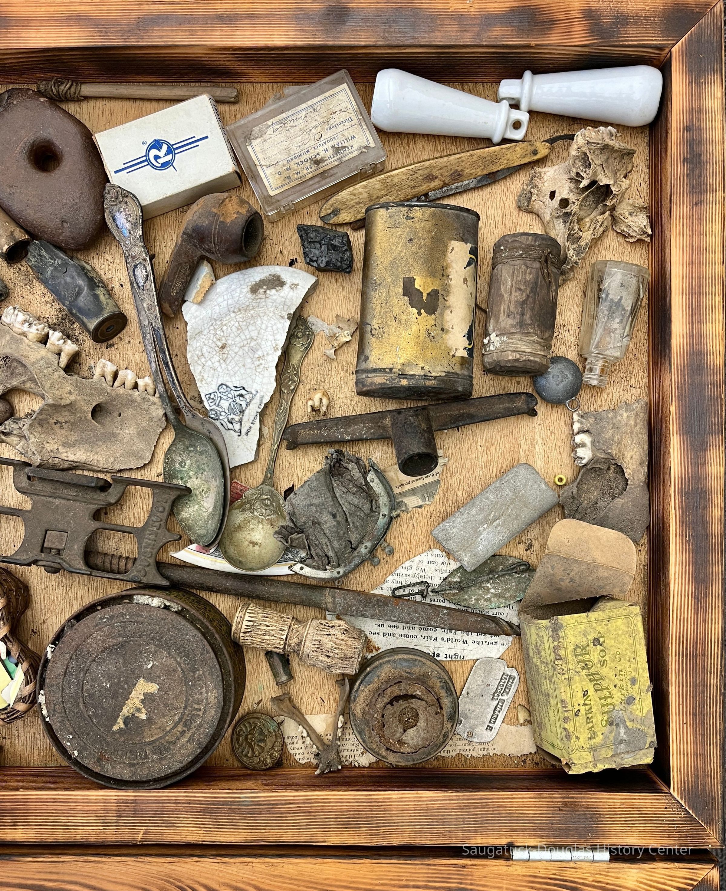 Wooden box with hinged, glass lid. The box contains a collection of pottery shards, bones and teeth, tins, lids, spoons, boxes, a corn shucker, an inkwell, stones, bottles, fishing floats, weights and lures, beads, a soldier's identification or dog tag, smoking pipe bowl, wooden clothes pin, wooden handle from a stamp, metal jar lids, newspaper scraps, Dr. Miller/Dr. Schock plastic pill box, insulated staples box, sulfur box, wood from a cigar box, metal lock mechanism, purse clasp, stamps, a chunk of coal, folding knife, and other unknown old items.