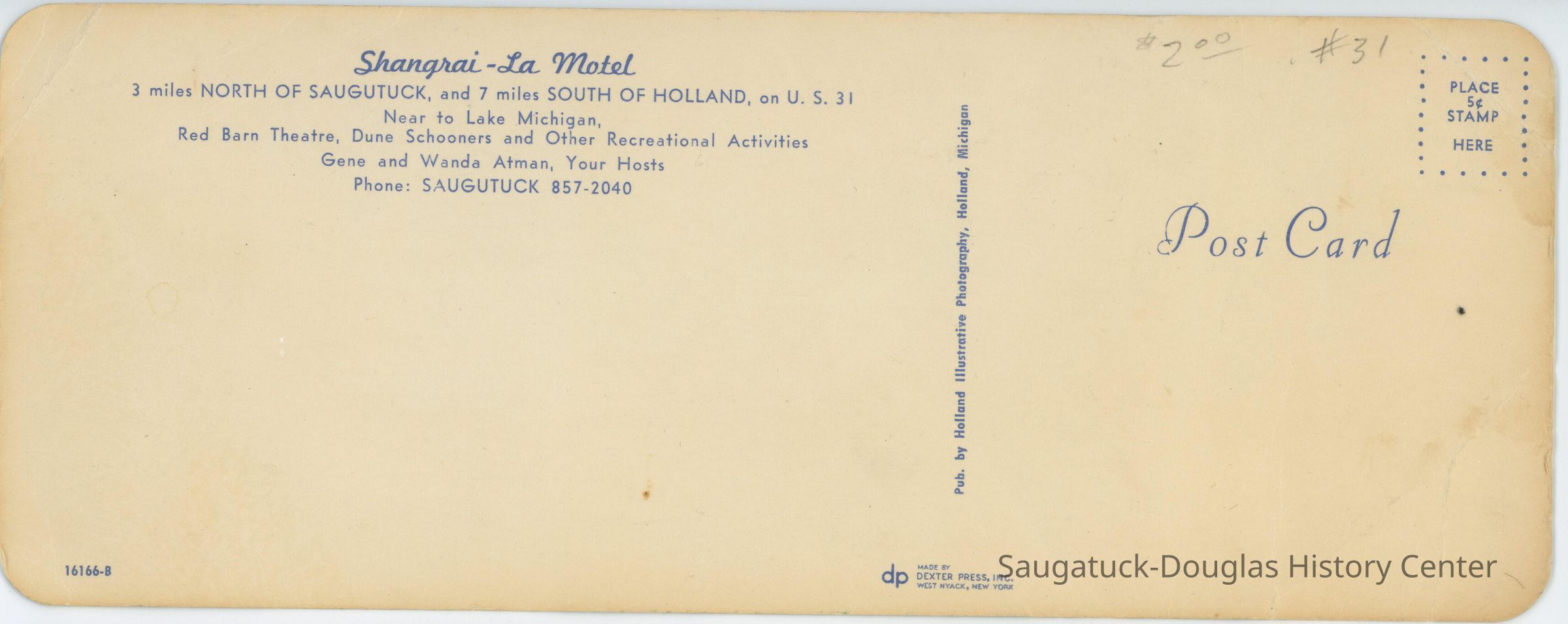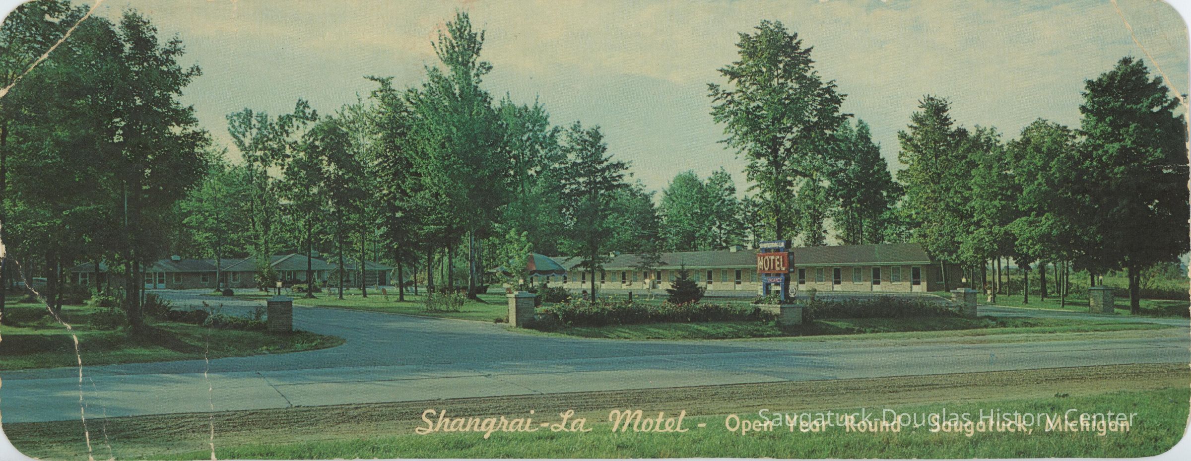 A color advertising postcard showing the Shanghai-La Motel from the road. Front of postcard notes the motel is "Open Year 'Round."Subject