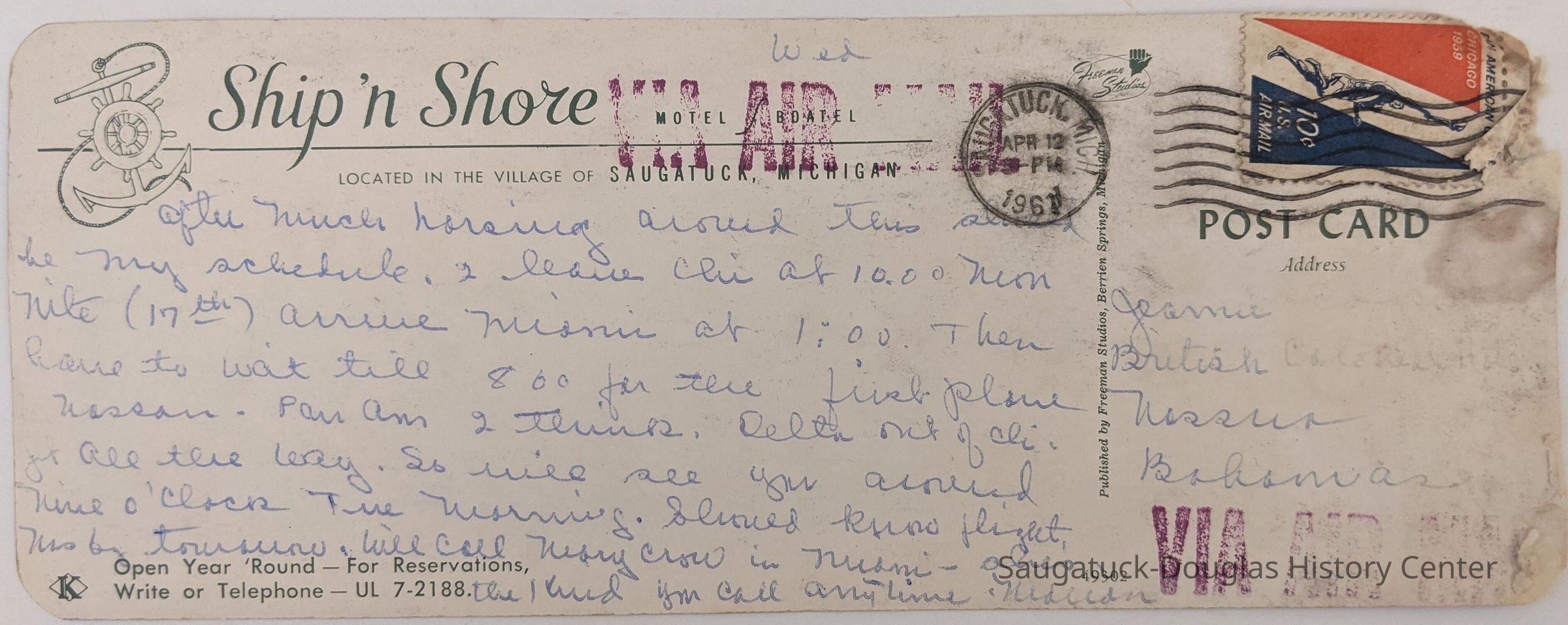 Postcard to inform Jeamie of the writer's travel plans from Chicago to Miami to Nassau.Location