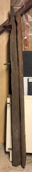 A. Weathered wooden plank pierced by metal rod and nails. 27x18x4 inches.