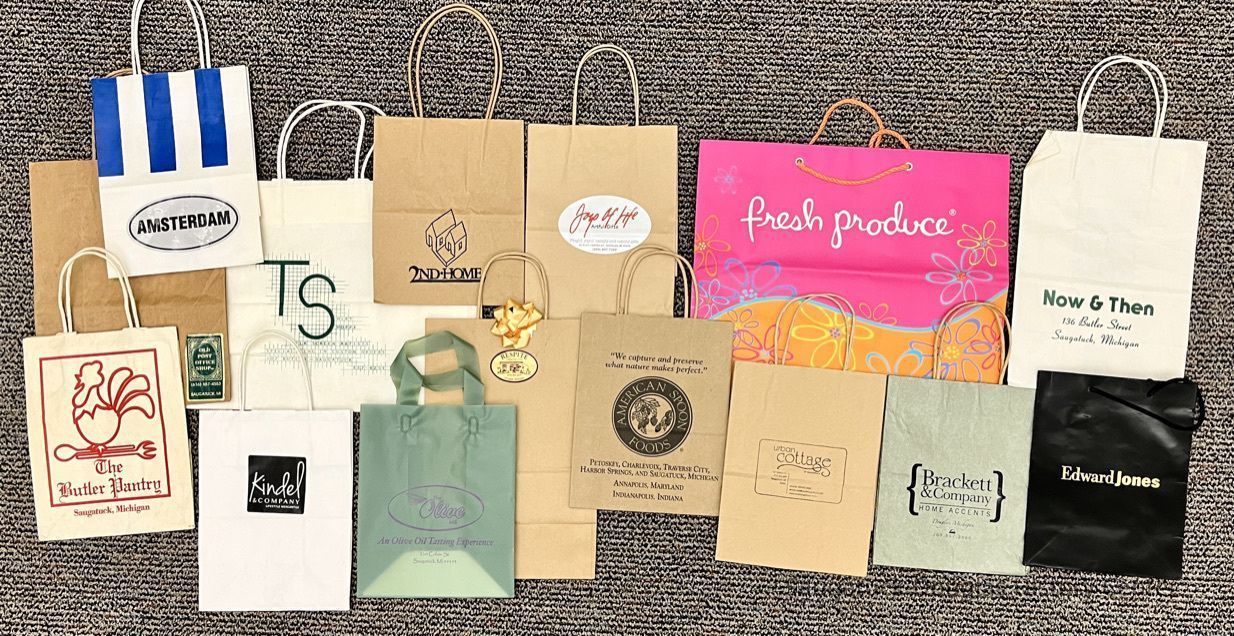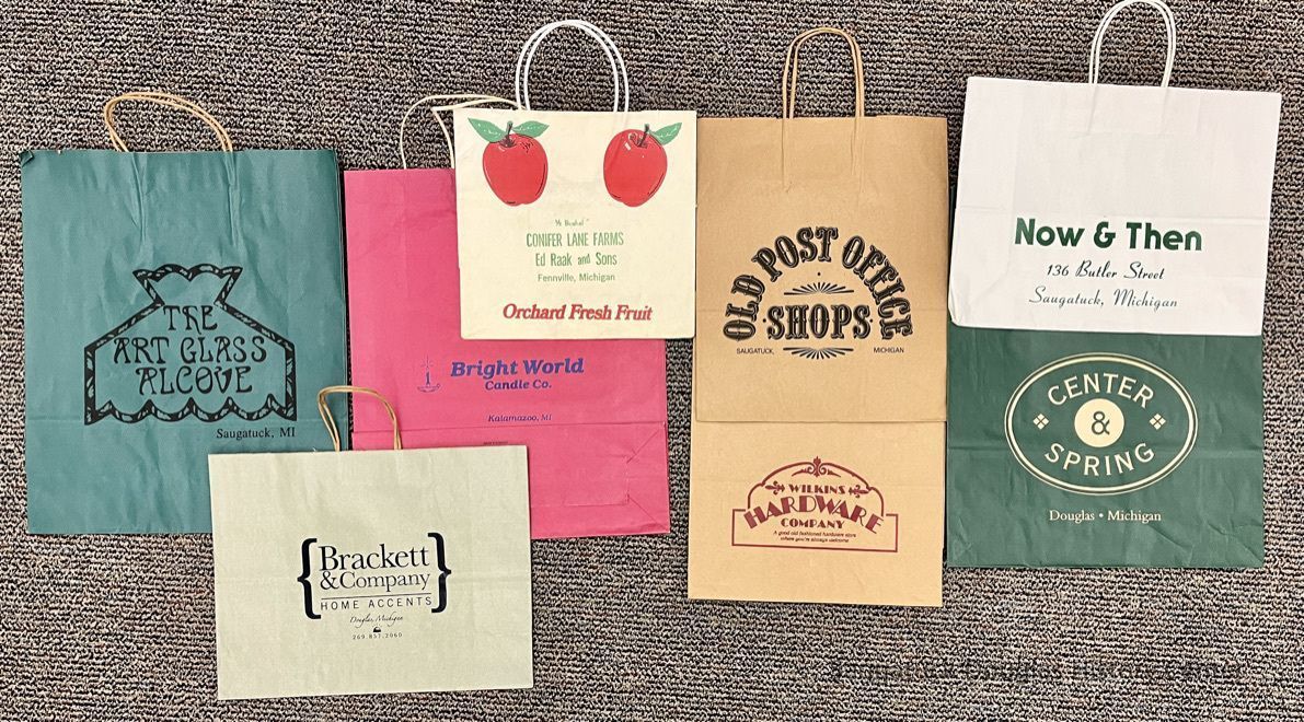Collection of 23 shopping bags from local businesses including Art Glass Alcove, Brackett & Company (2), Bright World Candle Company, Conifer Lane Farms/Ed Raak and Sons/Fennville, Old Post Office Shops (2), Wilkins Hardware Company, Now & Then (2), Center & Spring, Amsterdam, The Butler Pantry, Kindle & Company, TS Tshirt Shop, 2nd Home, The Olive Mill, Respite Coffee, Joys of Life, American Spoon Foods, Fresh Produce, Urban Cottage, and Edward JonesContext